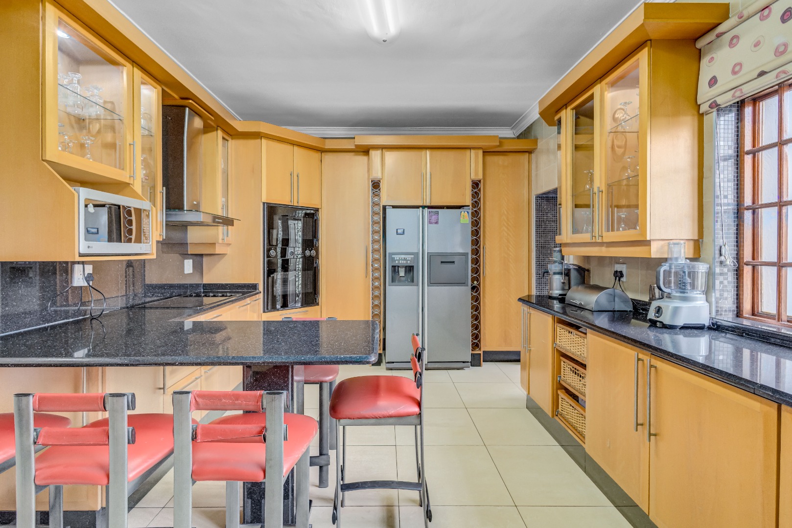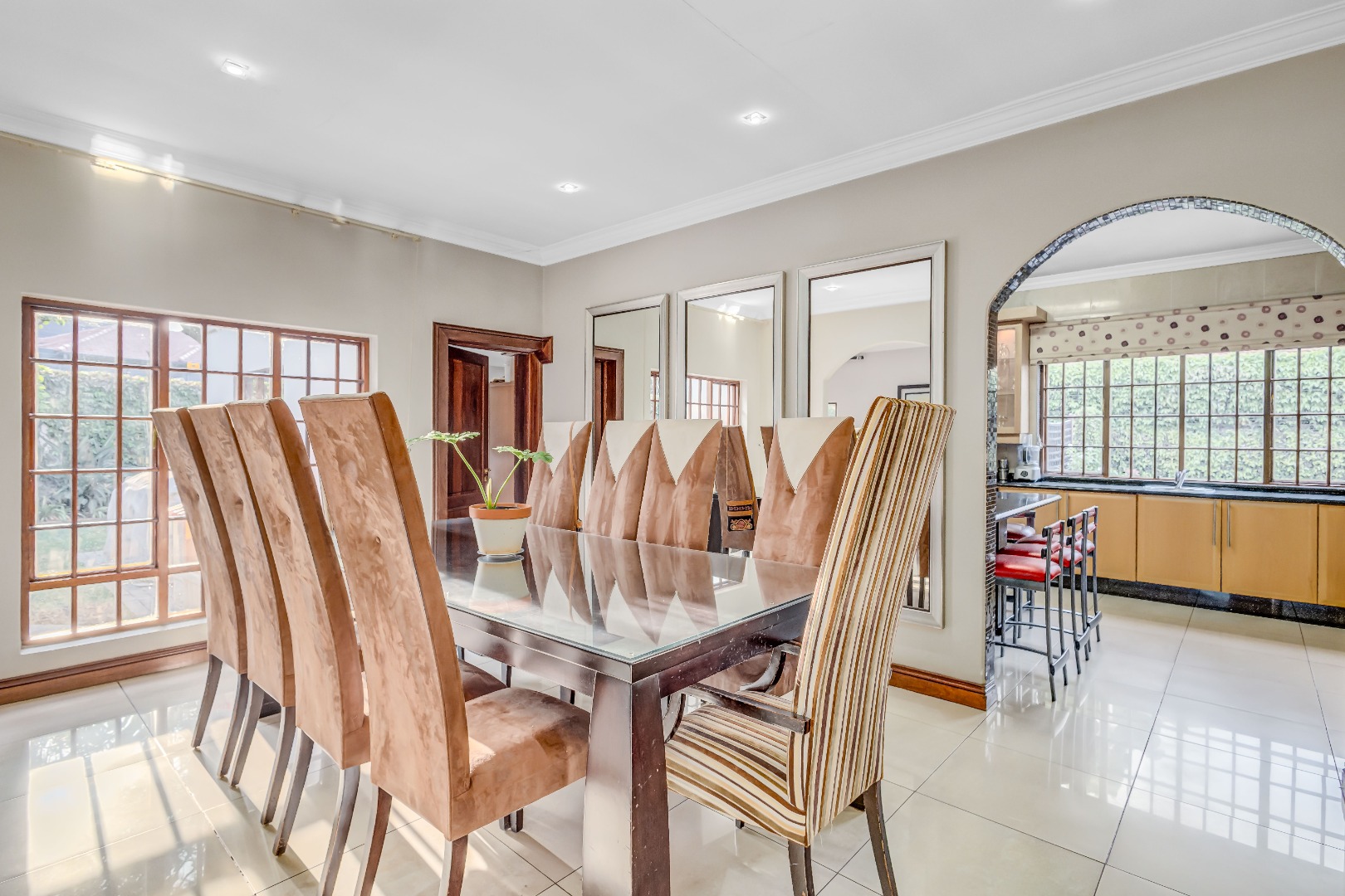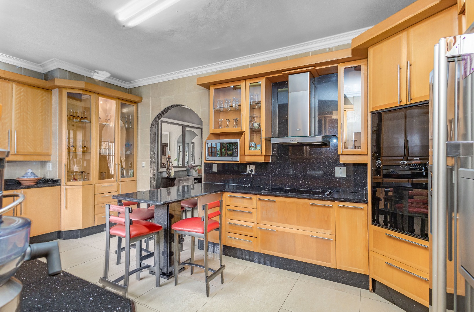 The home flows beautifully, starting with versatile living areas that include a semi open plan TV lounge, a formal lounge or family room, and a dining room. The dining room connects to the generous kitchen, fitted with sleek granite countertops, ample cabinetry, a breakfast nook, electric hob, and double eye level oven, making it a true chef’s delight. A separate scullery provides space for three under counter appliances for added convenience.