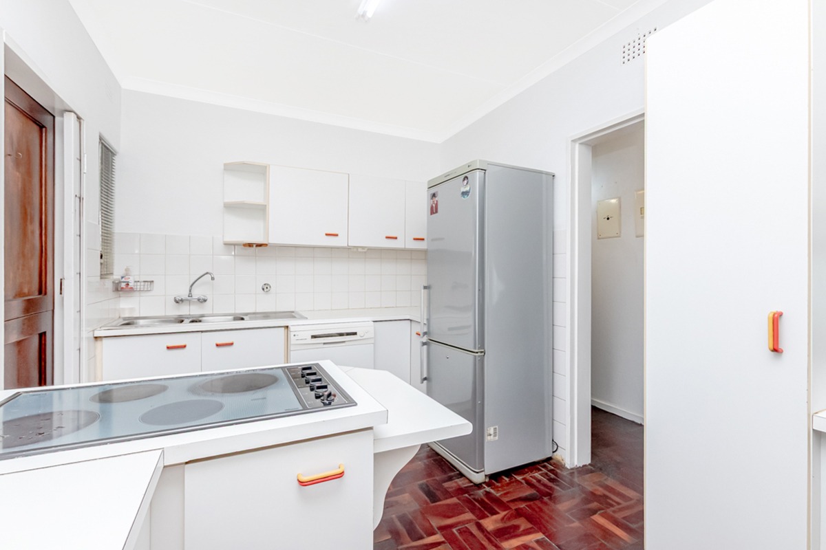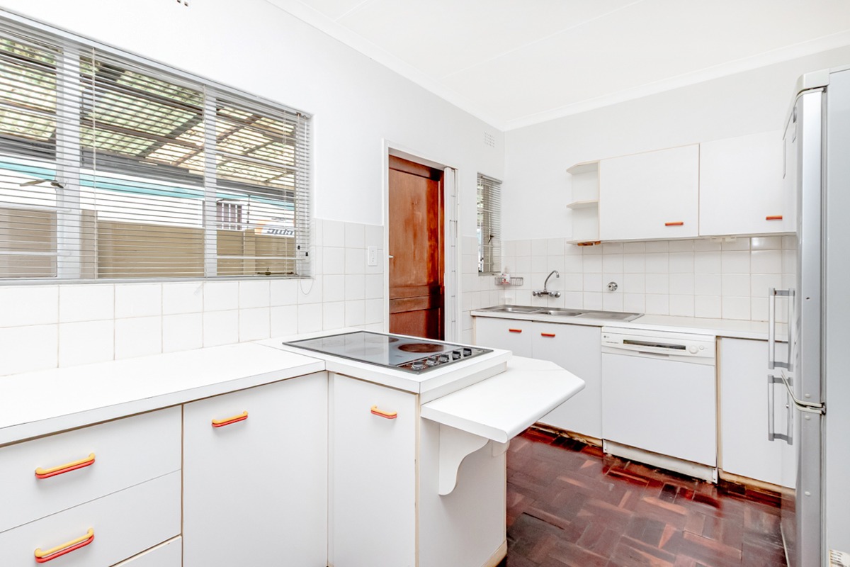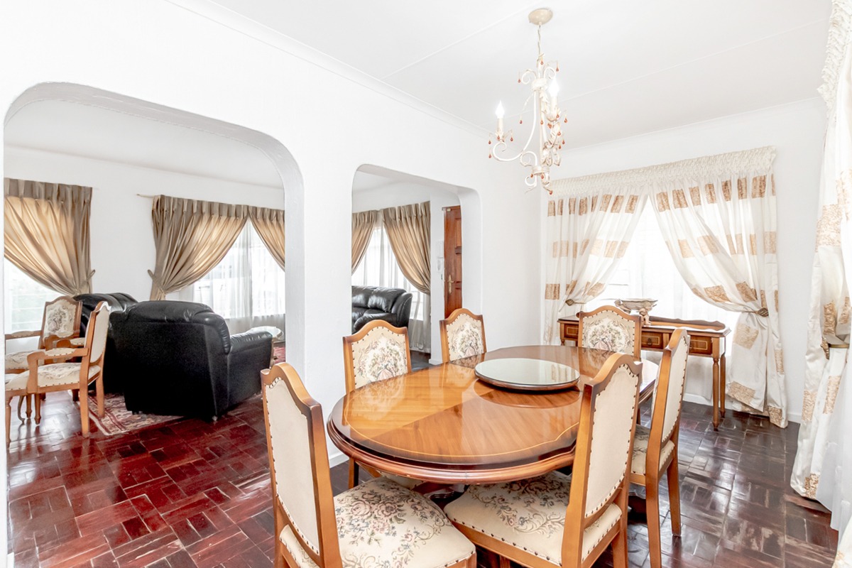 The home offers a spacious open-plan lounge and dining area, comfortably accommodating an eight-seater dining table and featuring a convenient kitchen hatch. The spacious kitchen is finished with parquet flooring and offers ample workspace.