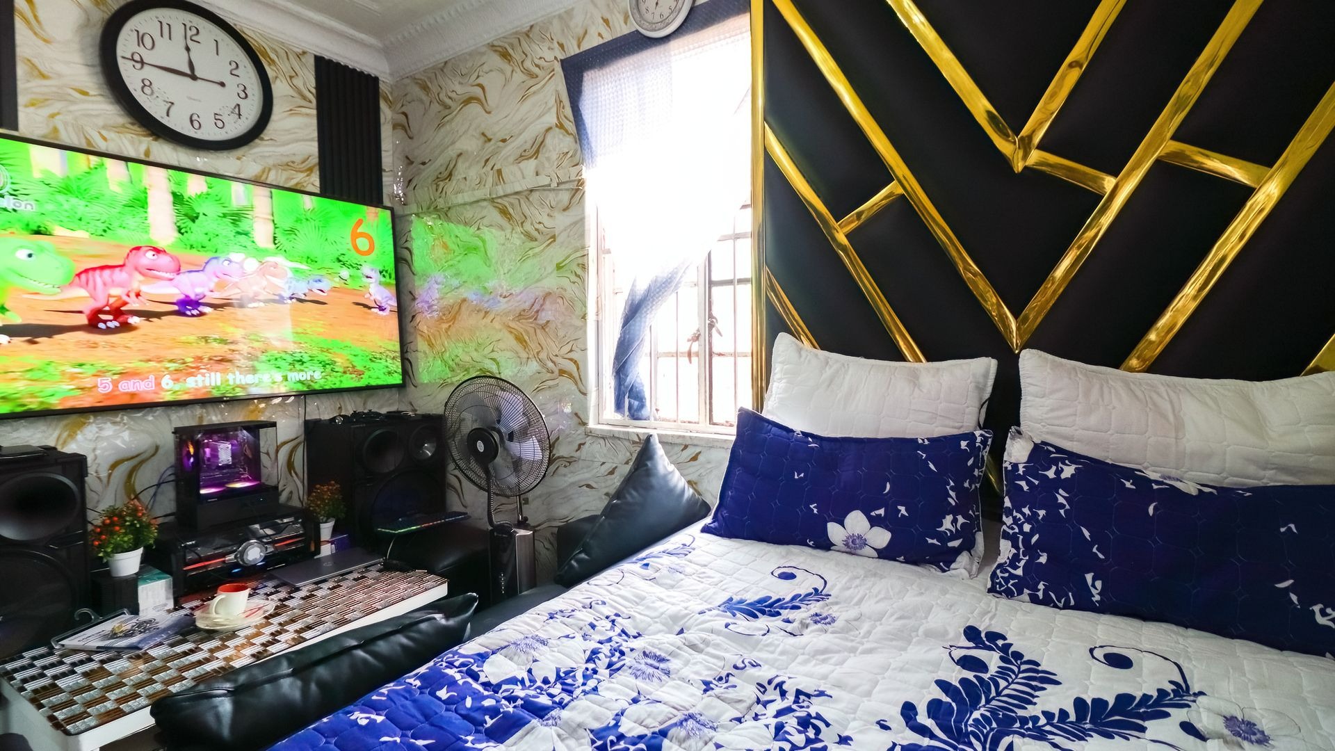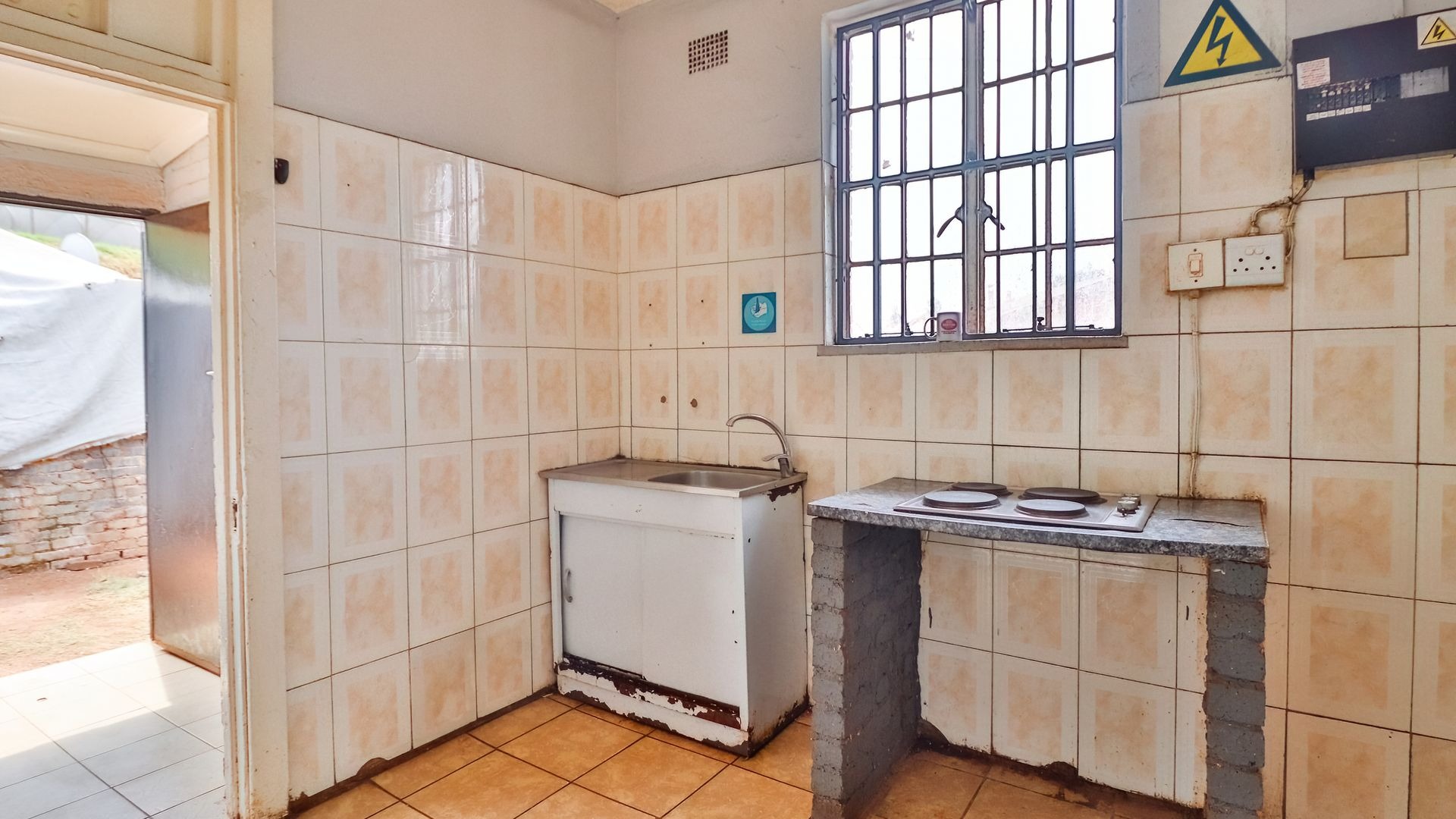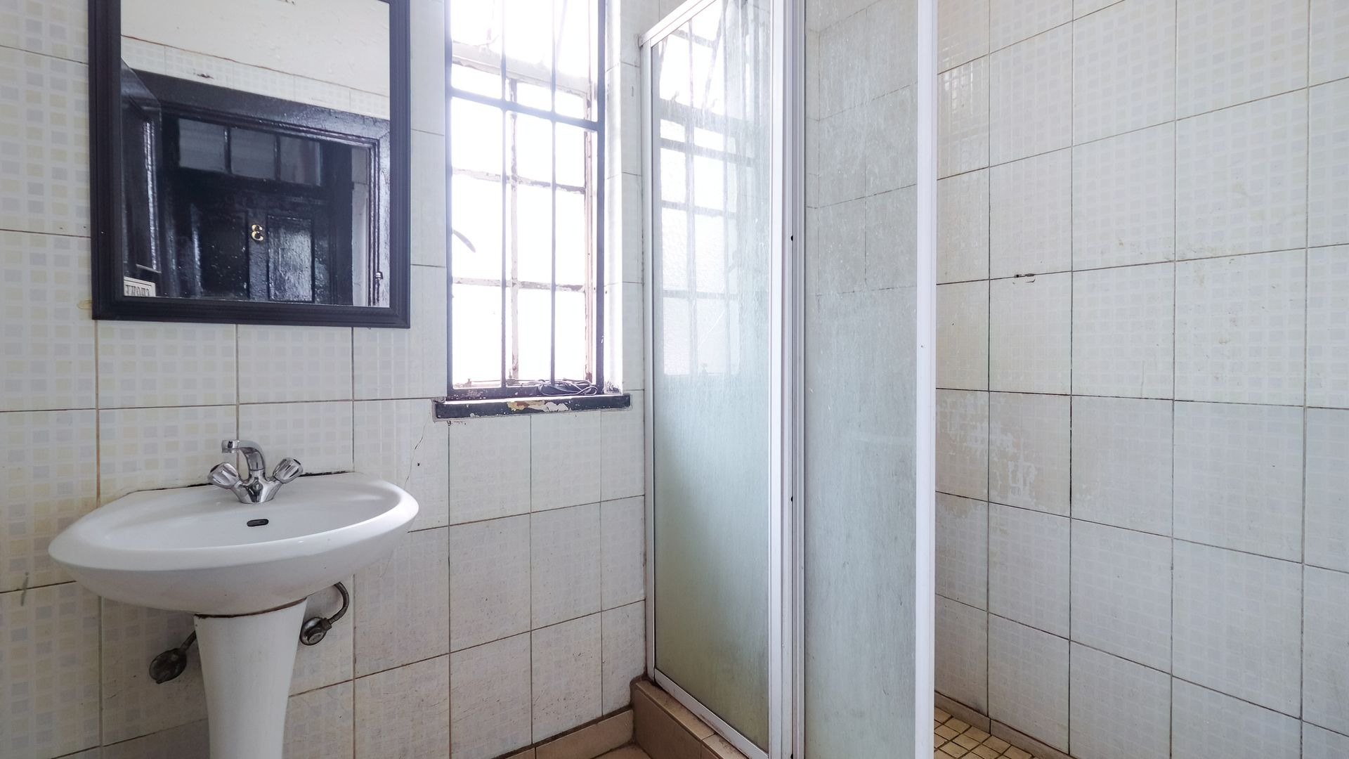 The interior comprises four bedrooms and one bathroom, offering ample accommodation. While currently functional, the kitchen and bathroom spaces are ready for a modern transformation. The kitchen features tiled walls and floor, a basic sink, and a two-plate stovetop, with visible signs of wear that highlight its potential for a complete renovation. Similarly, the bathroom, with its tiled surfaces, pedestal sink, and shower, awaits a contemporary update to enhance comfort and style.