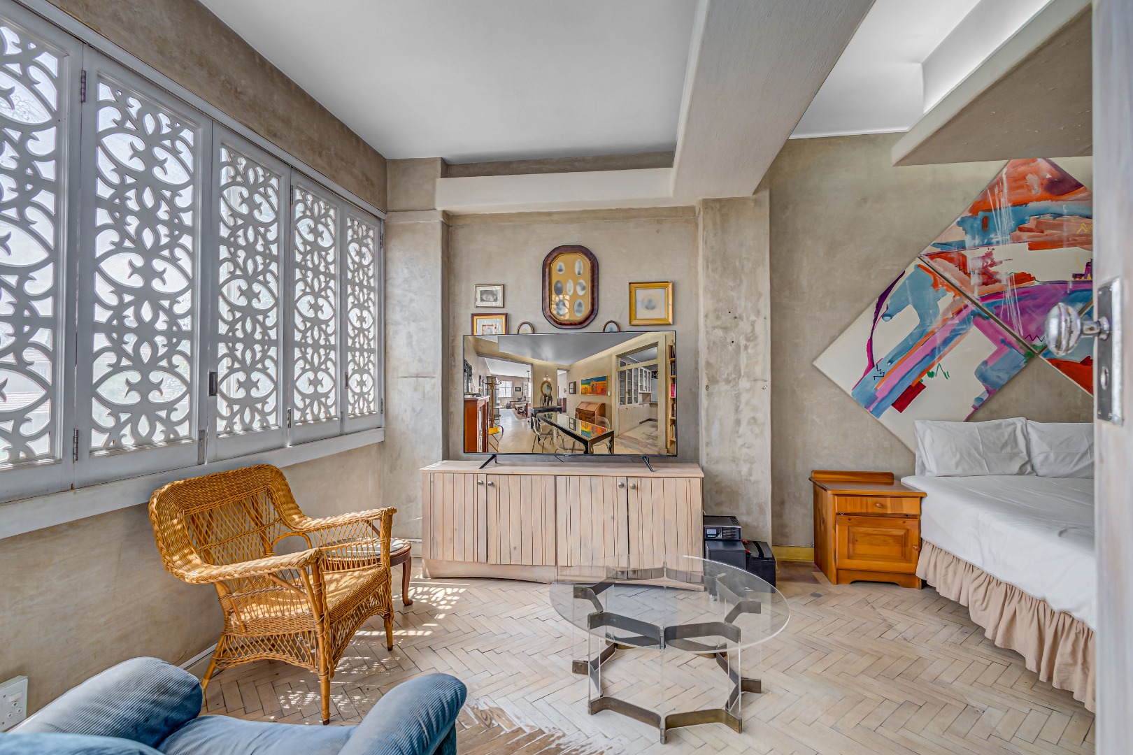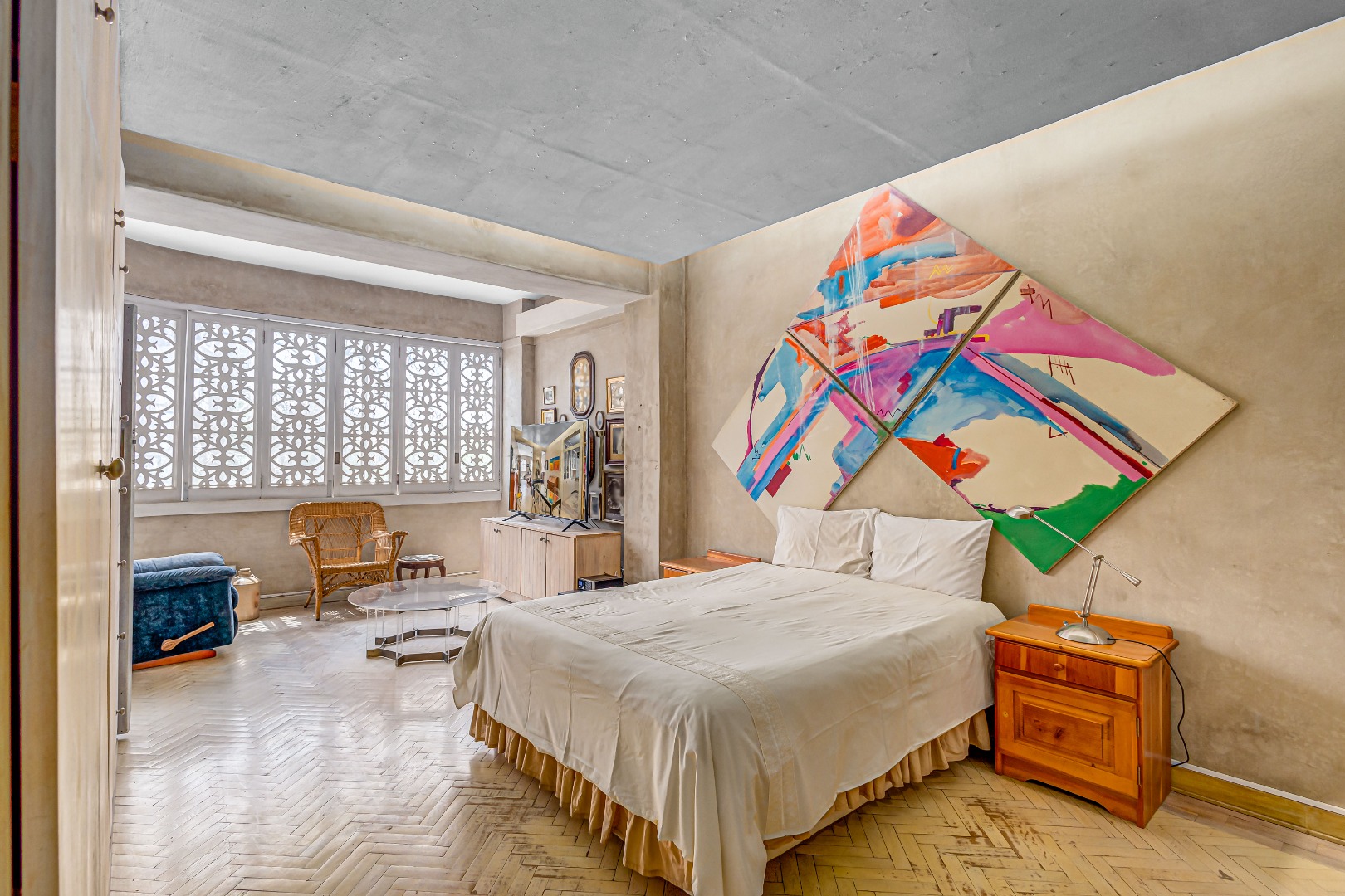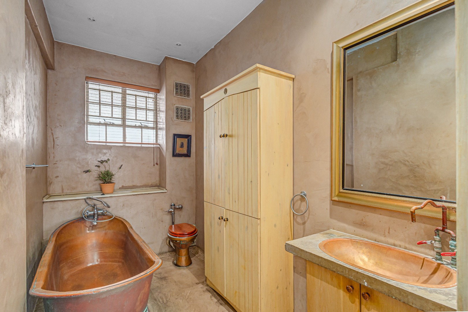 The en suite bathroom is neat and functional, featuring a luxurious copper bath and sink, which are both valuable statement pieces that beautifully complement the apartment’s timeless appeal.