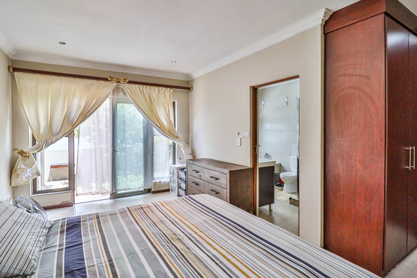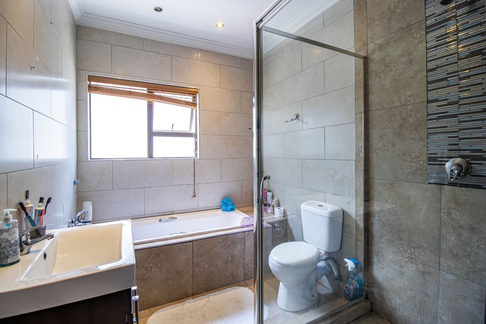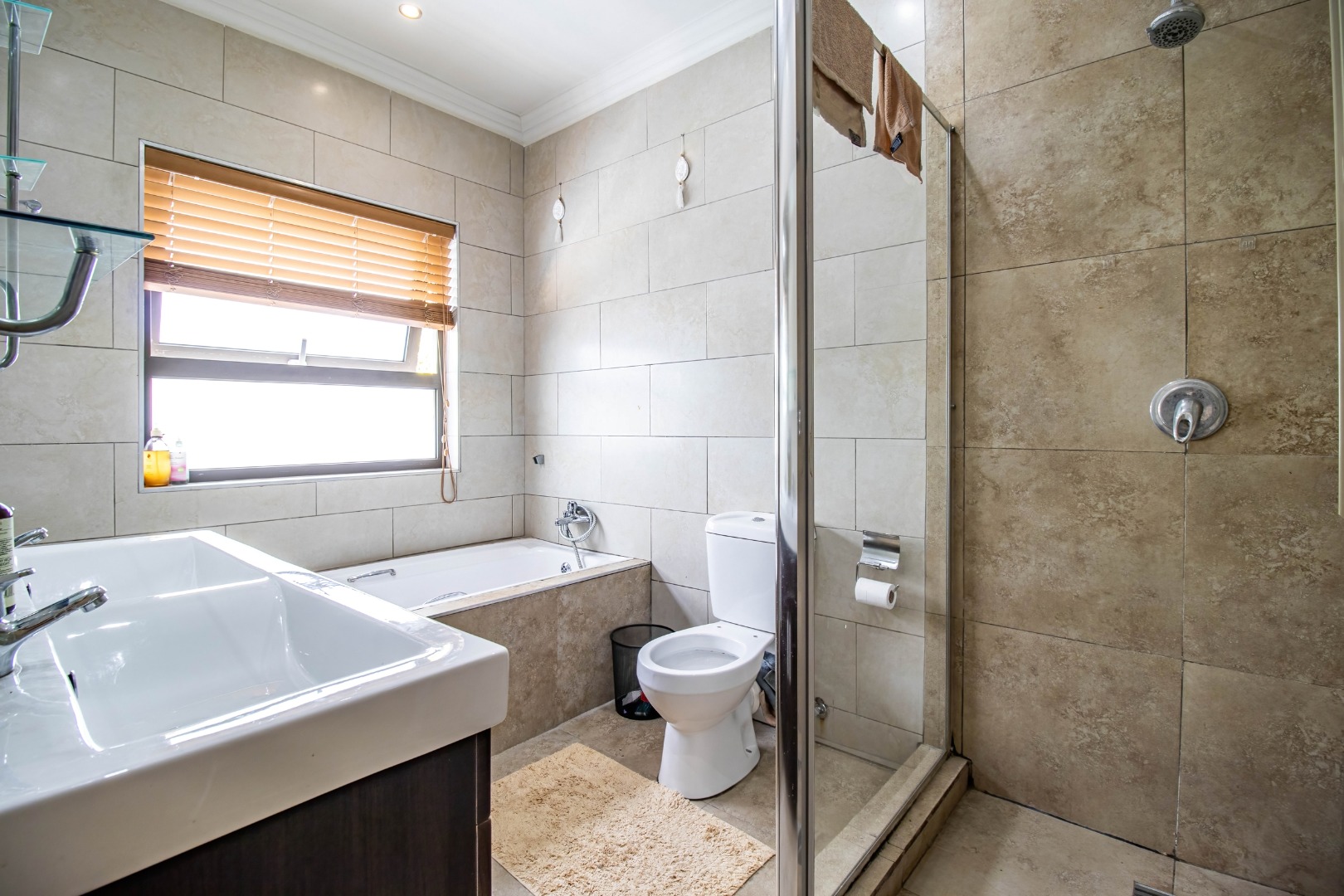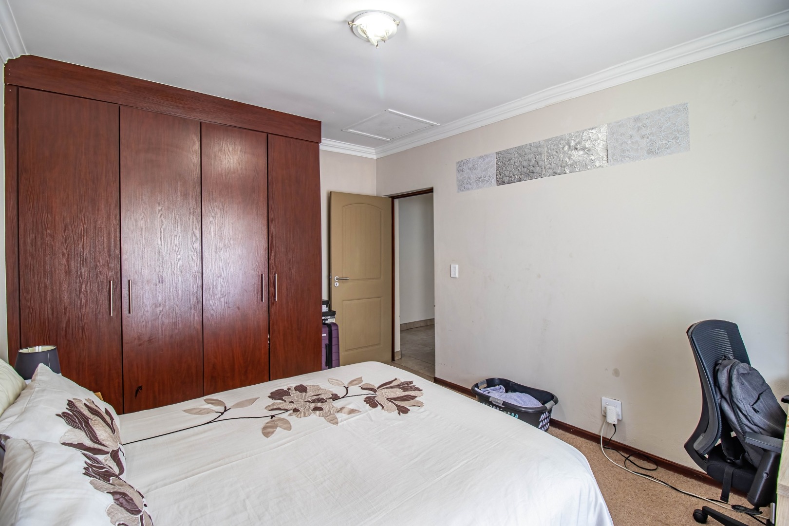 All three bedrooms are well-sized and fitted with ample built-in cupboards, offering comfort and practicality. The main bedroom serves as a private retreat, complete with a modern en-suite bathroom. The additional bedrooms are serviced by a full family bathroom, while a convenient guest toilet enhances everyday functionality.