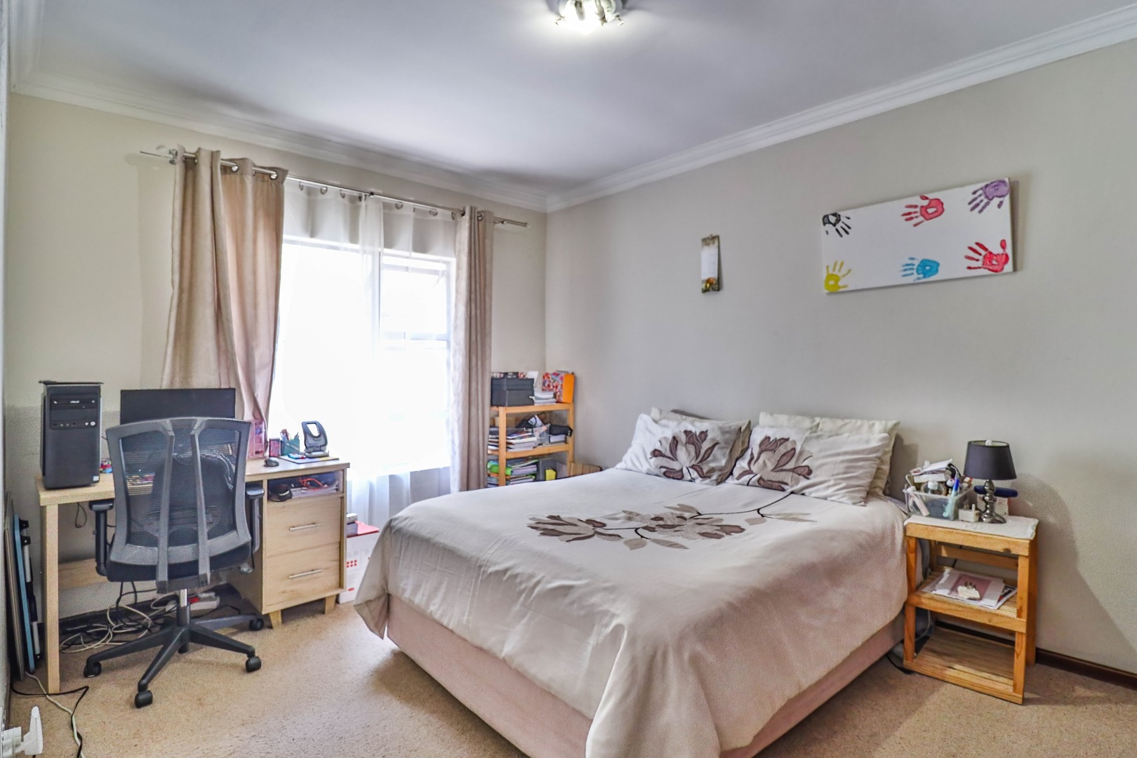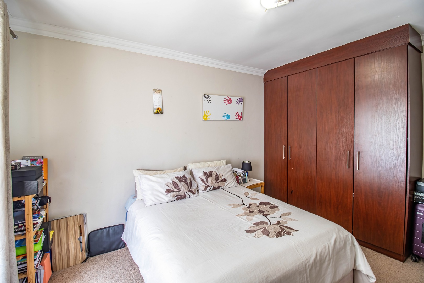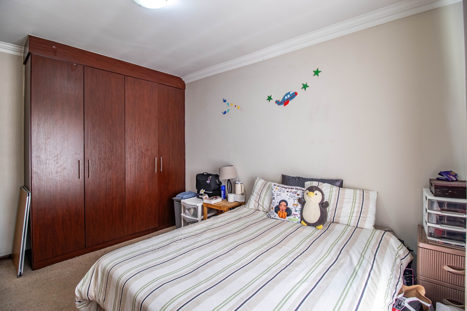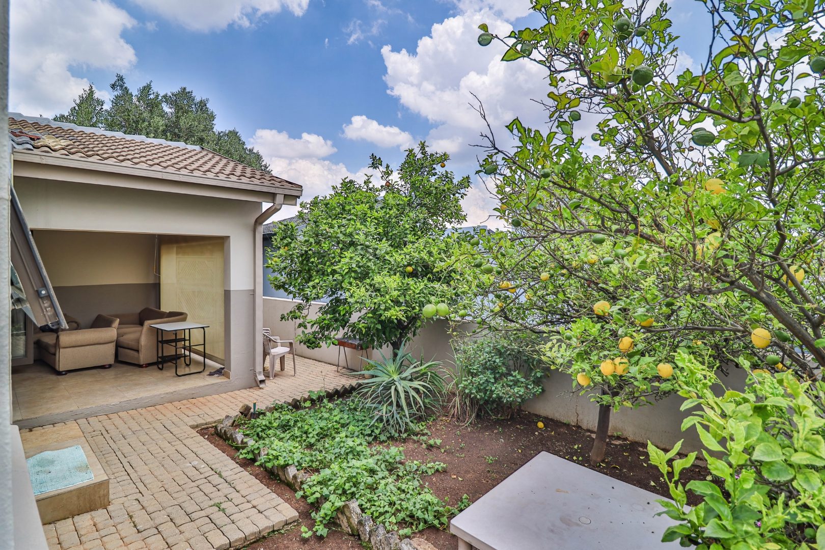All three bedrooms are well-sized and fitted with ample built-in cupboards, offering comfort and practicality. The main bedroom serves as a private retreat, complete with a modern en-suite bathroom. The additional bedrooms are serviced by a full family bathroom, while a convenient guest toilet enhances everyday functionality.