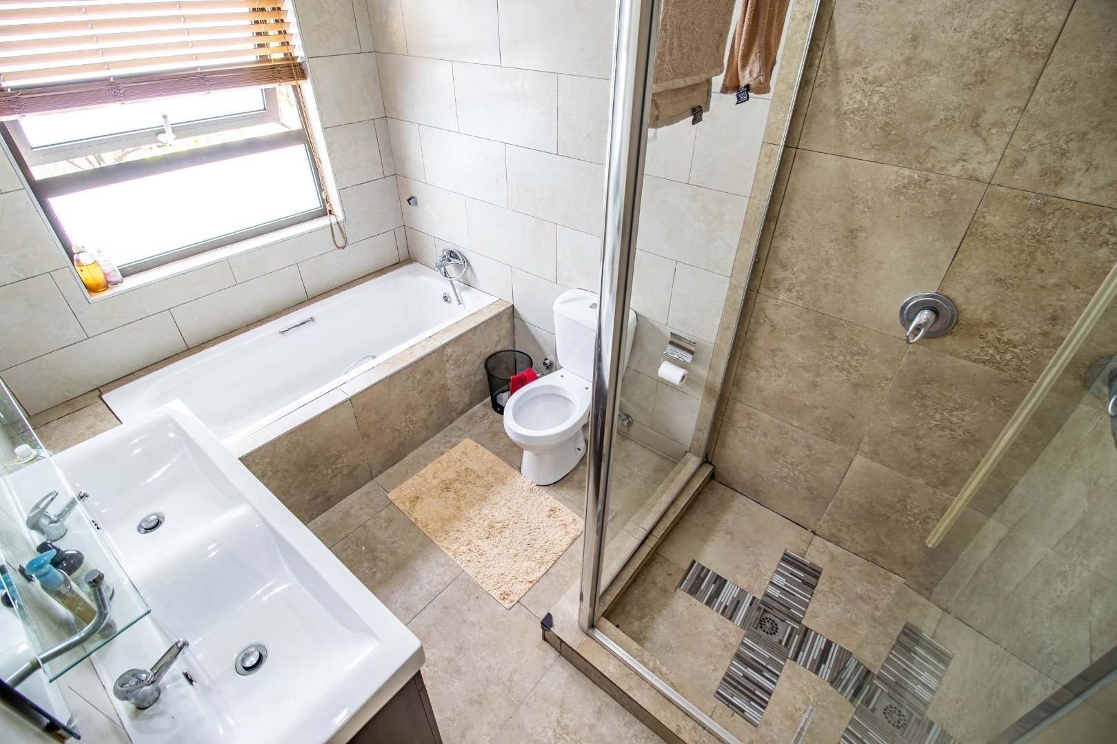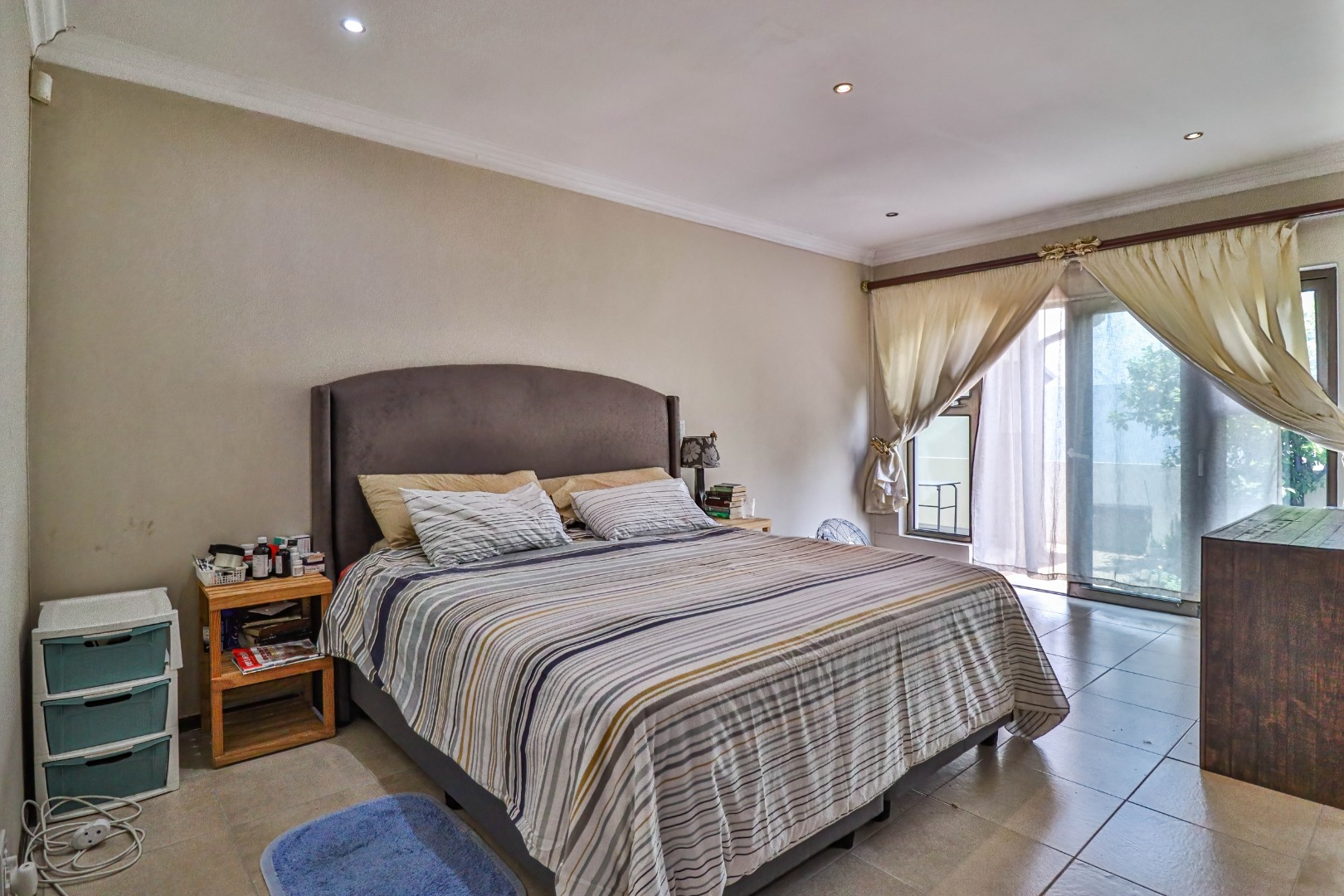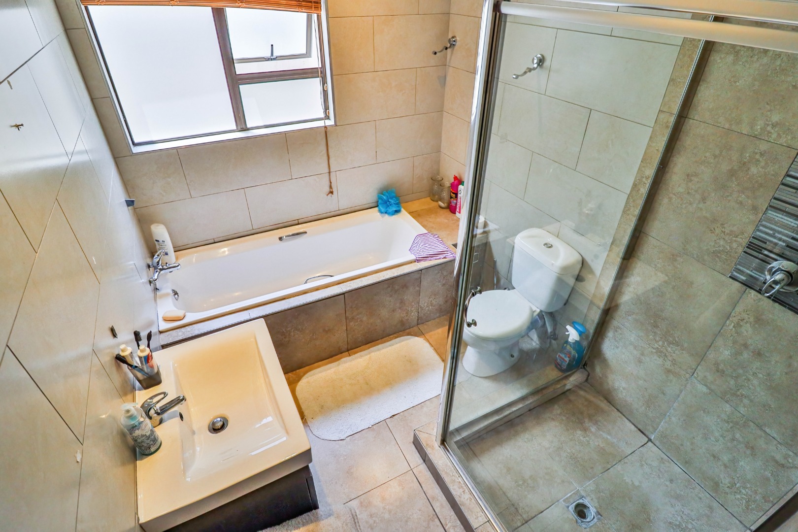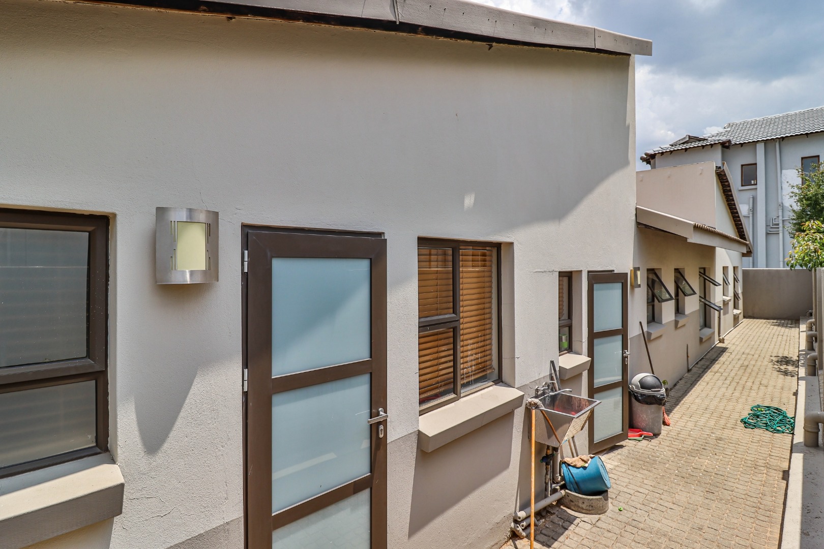All three bedrooms are well-sized and fitted with ample built-in cupboards, offering comfort and practicality. The main bedroom serves as a private retreat, complete with a modern en-suite bathroom. The additional bedrooms are serviced by a full family bathroom, while a convenient guest toilet enhances everyday functionality.