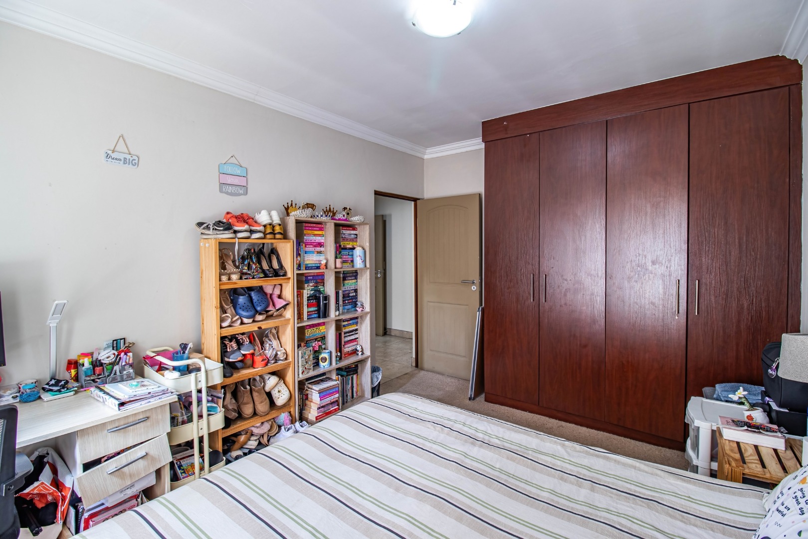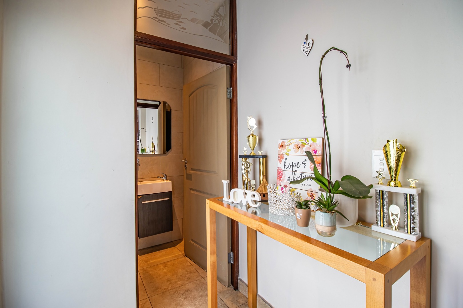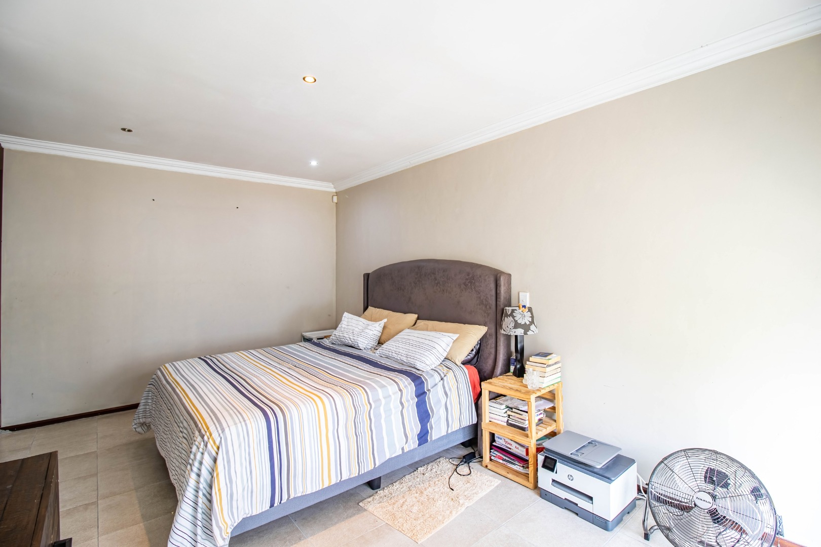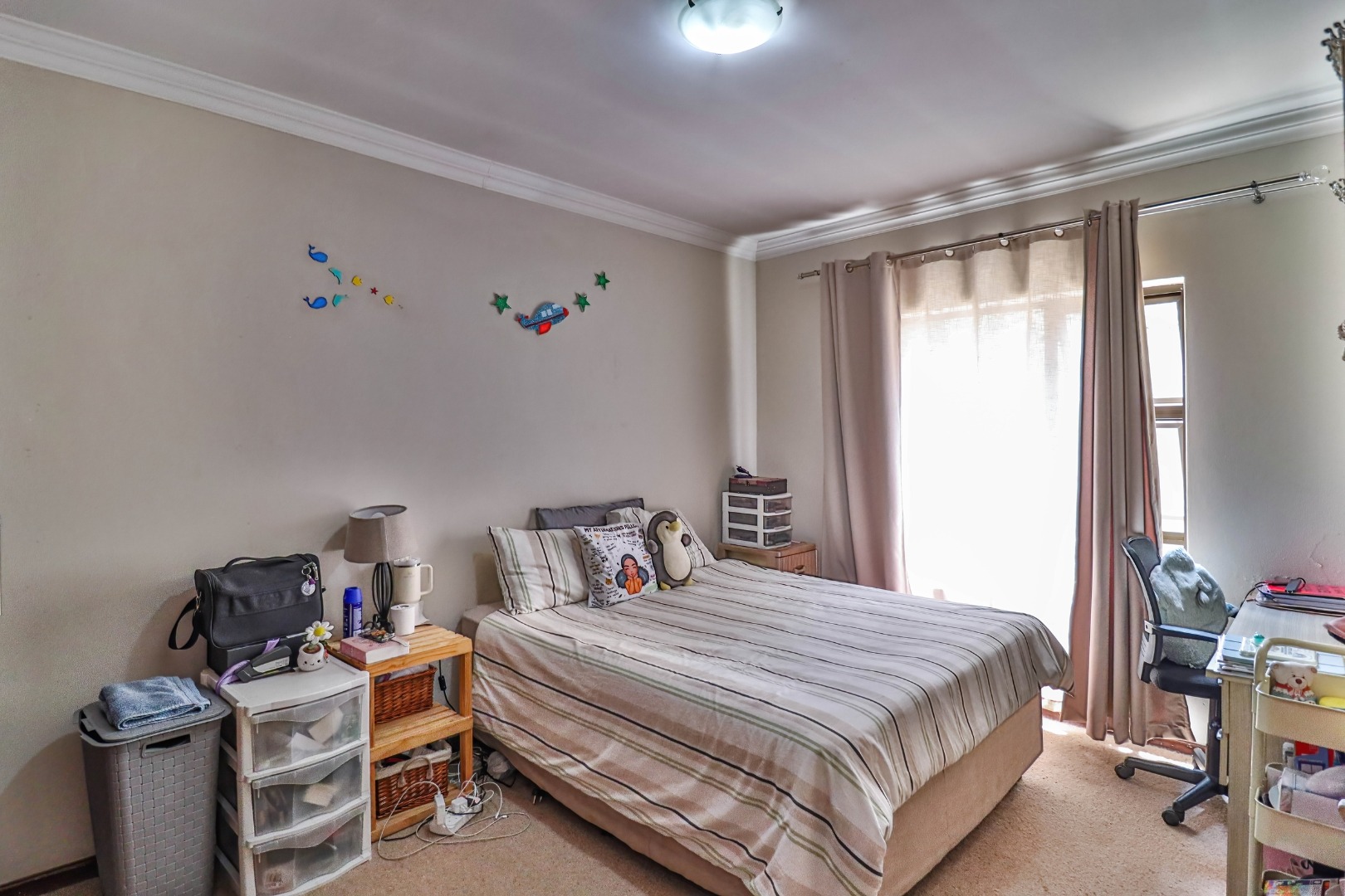 All three bedrooms are well-sized and fitted with ample built-in cupboards, offering comfort and practicality. The main bedroom serves as a private retreat, complete with a modern en-suite bathroom. The additional bedrooms are serviced by a full family bathroom, while a convenient guest toilet enhances everyday functionality.