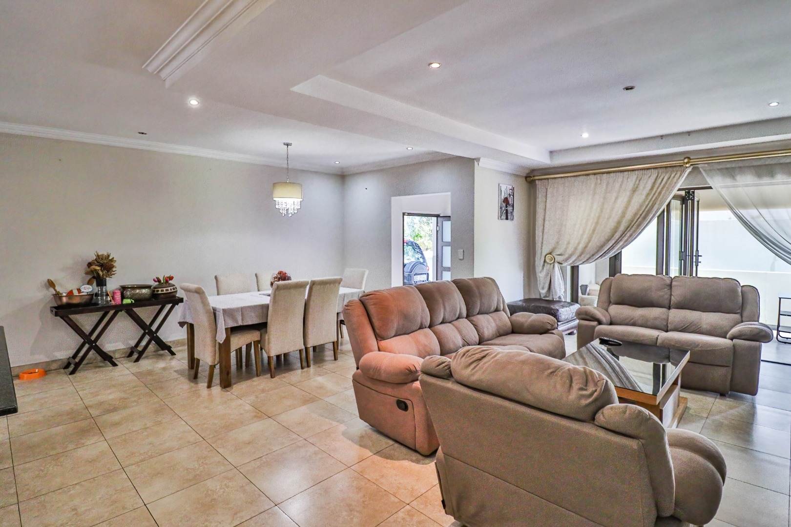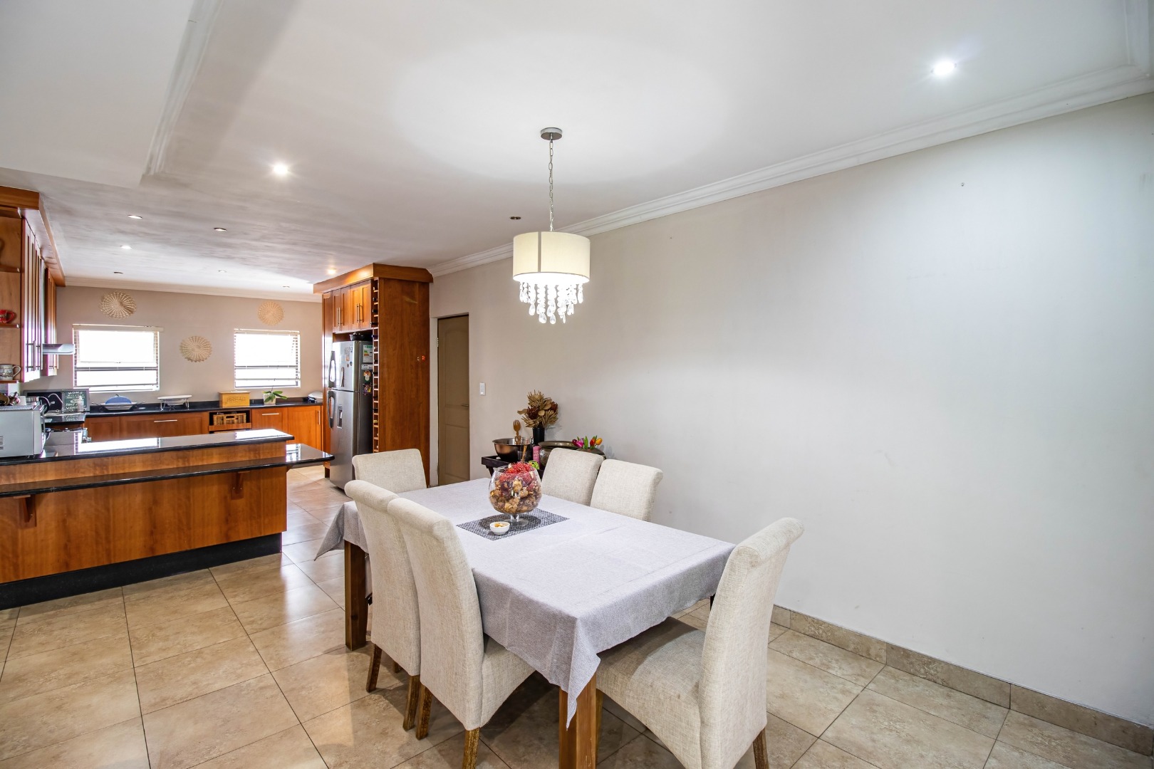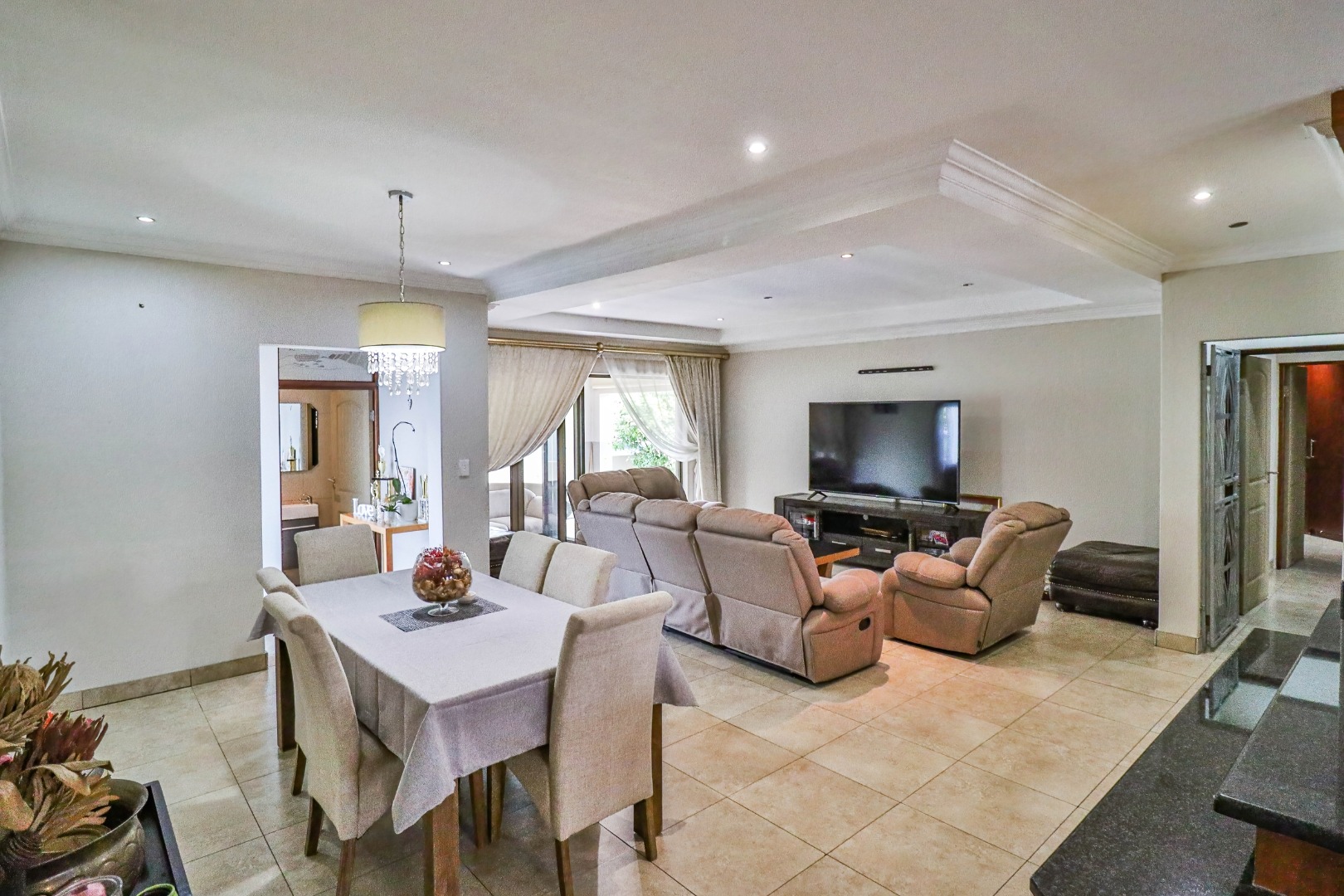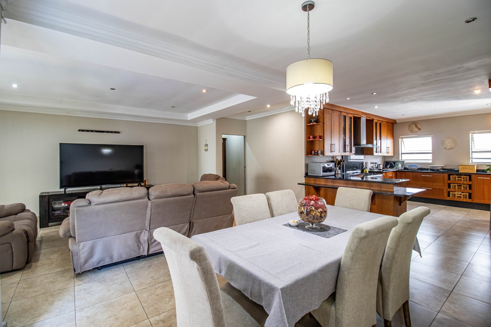 The home welcomes you with a spacious open-plan layout designed for modern living. The expansive kitchen is both functional and stylish, featuring generous cupboard and counter space, ideal for family meals and entertaining. A separate scullery neatly accommodates all appliances, keeping the main kitchen uncluttered and refined. From the kitchen, the home flows effortlessly into the dining area and TV lounge, creating a warm and inviting central living space.