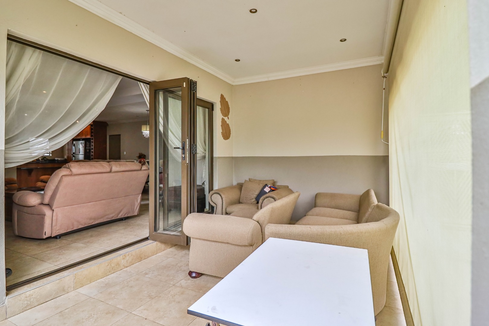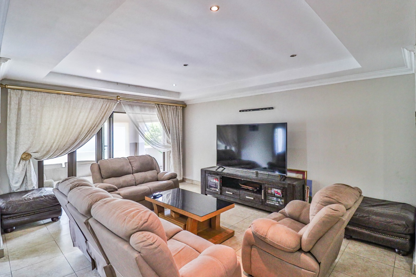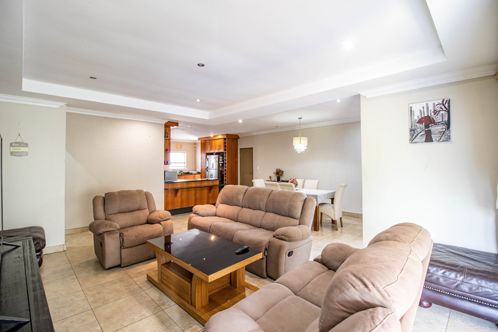 The home welcomes you with a spacious open-plan layout designed for modern living. The expansive kitchen is both functional and stylish, featuring generous cupboard and counter space, ideal for family meals and entertaining. A separate scullery neatly accommodates all appliances, keeping the main kitchen uncluttered and refined. From the kitchen, the home flows effortlessly into the dining area and TV lounge, creating a warm and inviting central living space.