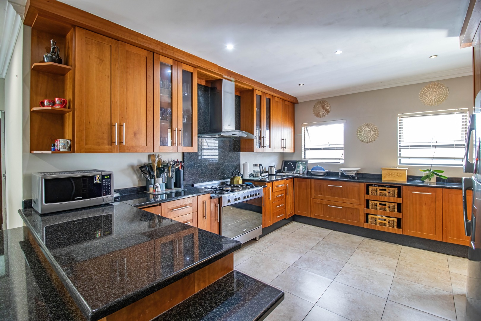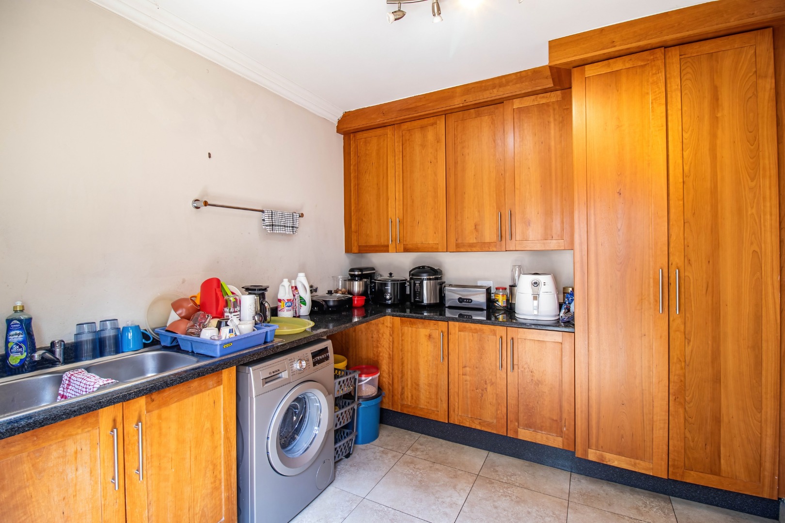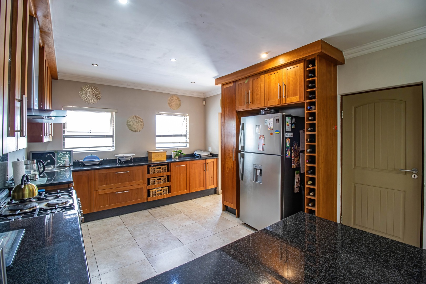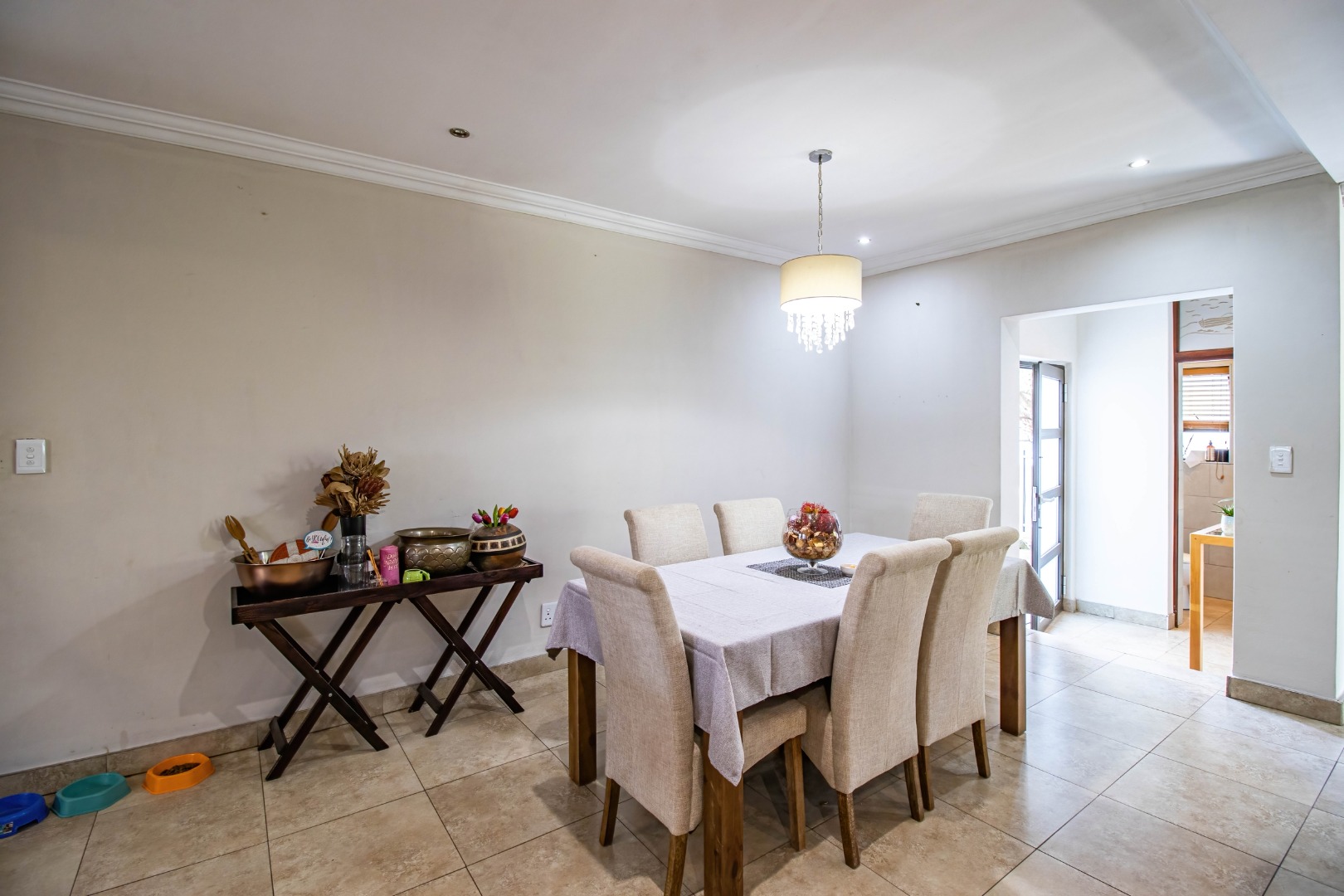 The home welcomes you with a spacious open-plan layout designed for modern living. The expansive kitchen is both functional and stylish, featuring generous cupboard and counter space, ideal for family meals and entertaining. A separate scullery neatly accommodates all appliances, keeping the main kitchen uncluttered and refined. From the kitchen, the home flows effortlessly into the dining area and TV lounge, creating a warm and inviting central living space.