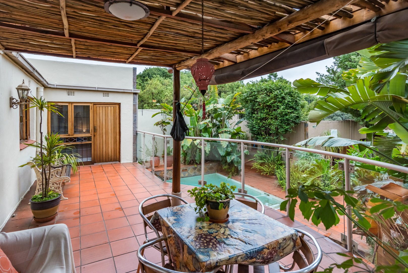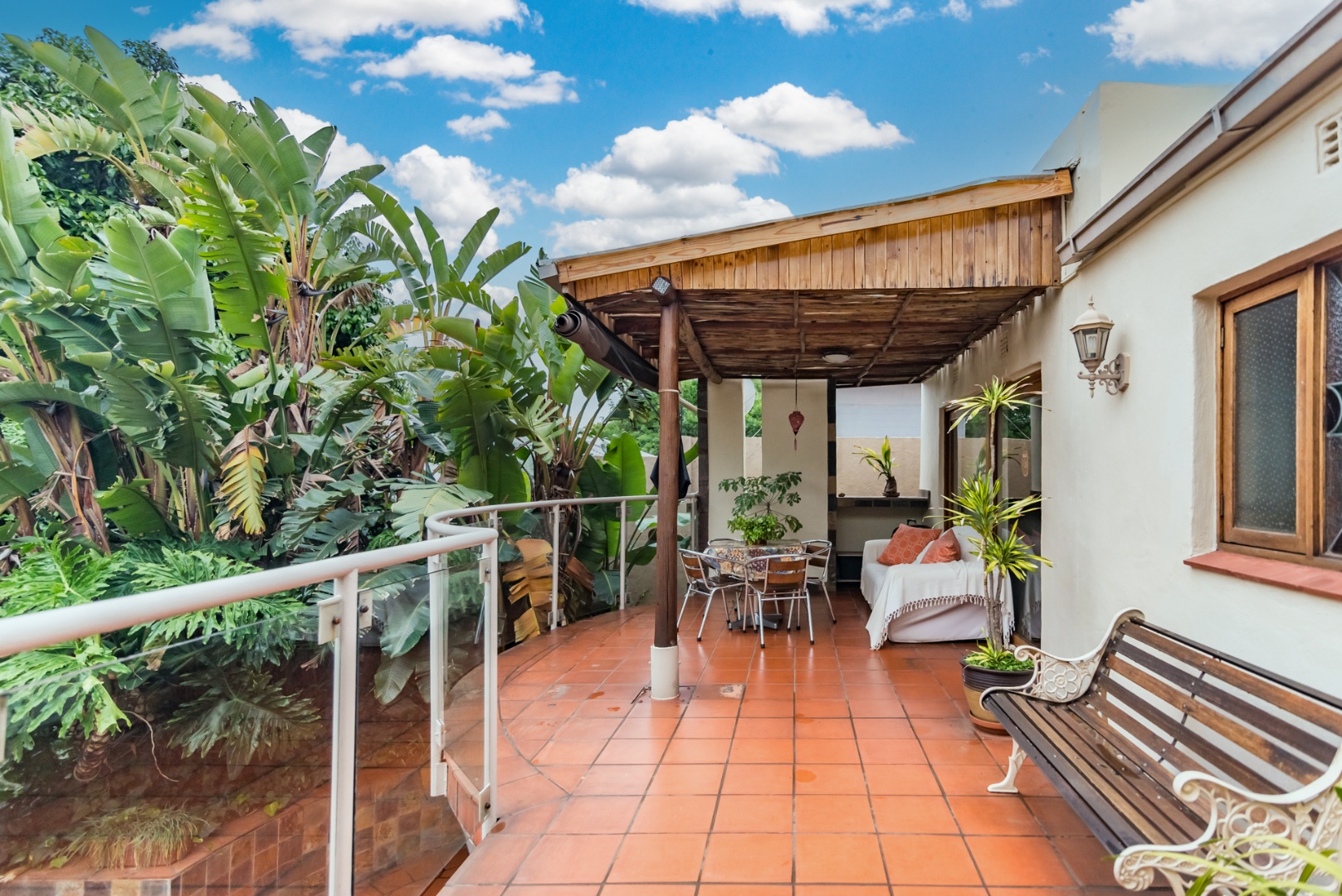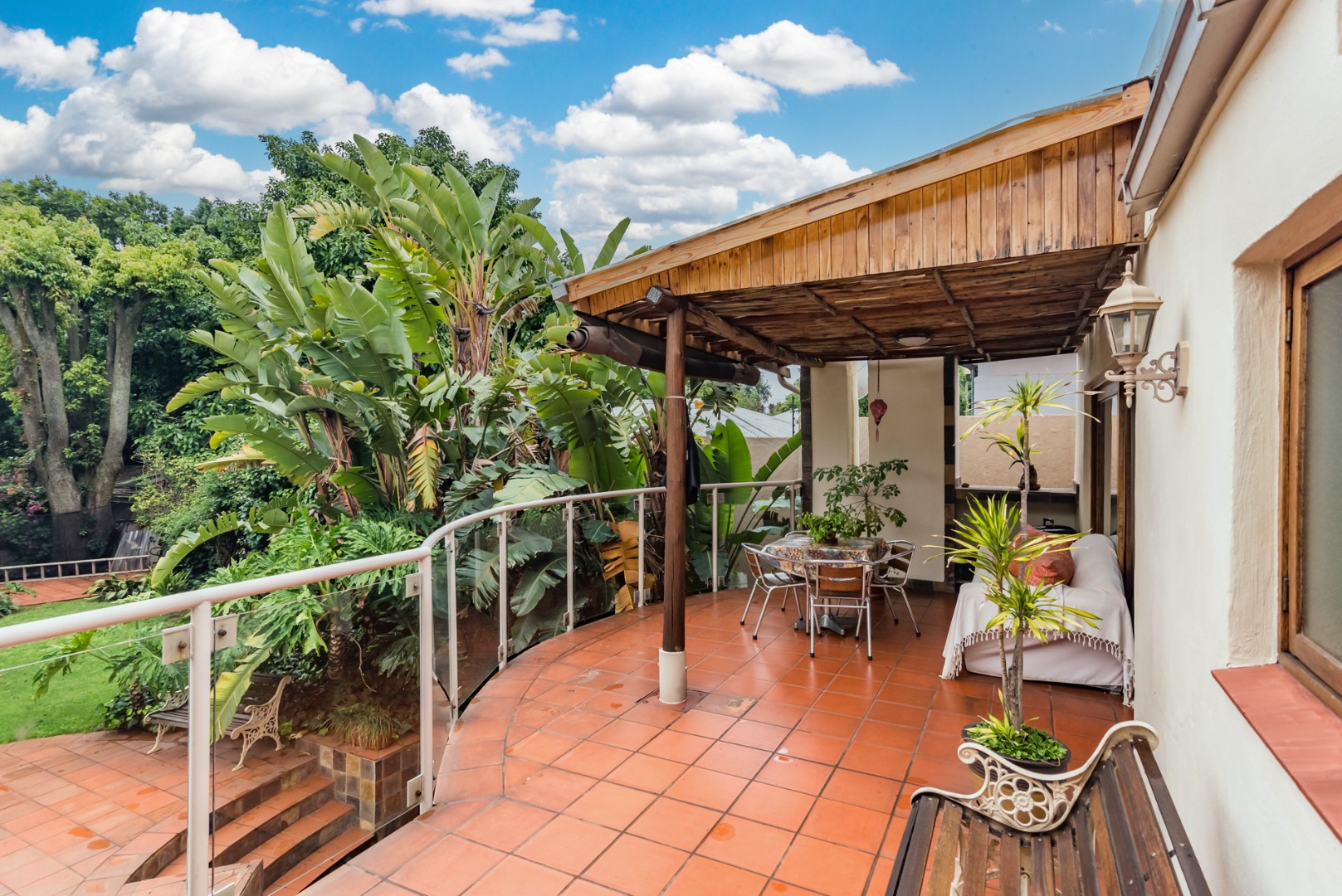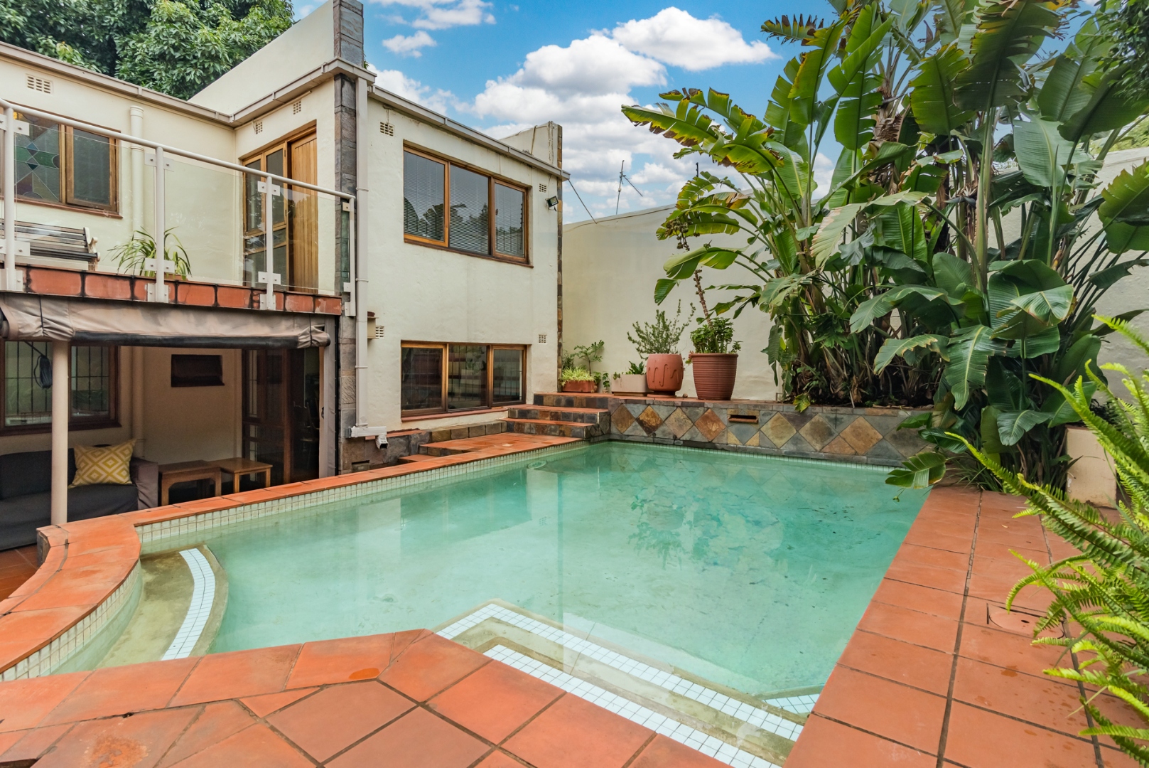 Discover this charming 3-bedroom, 3-bathroom residence nestled in the desirable suburban area of Westdene. The inviting interior features a spacious lounge, a dedicated dining room, and a family TV room, all boasting warm hardwood flooring and characterful exposed ceiling beams. Large windows and sliding doors ensure ample natural light, with direct access to a private patio and a lush outdoor balcony, perfect for relaxation or entertaining.