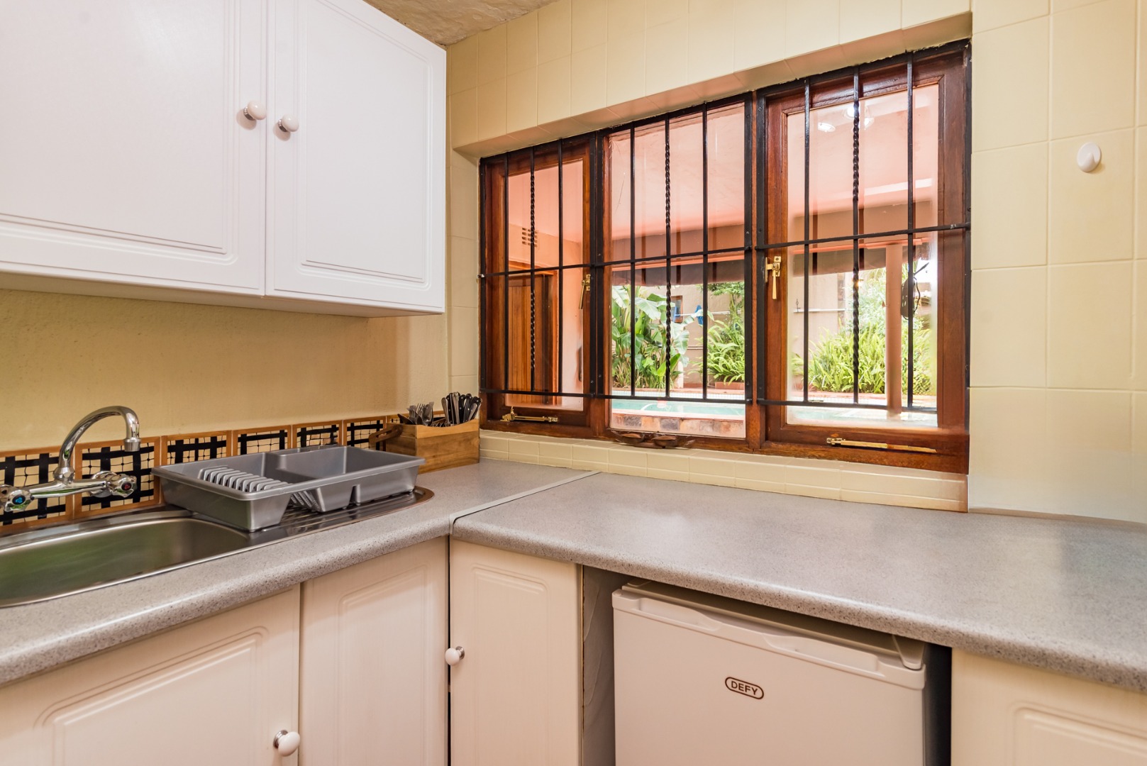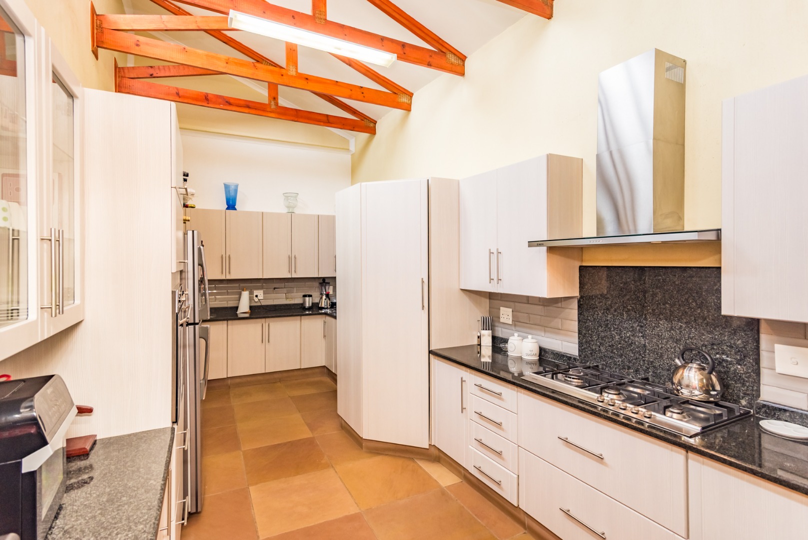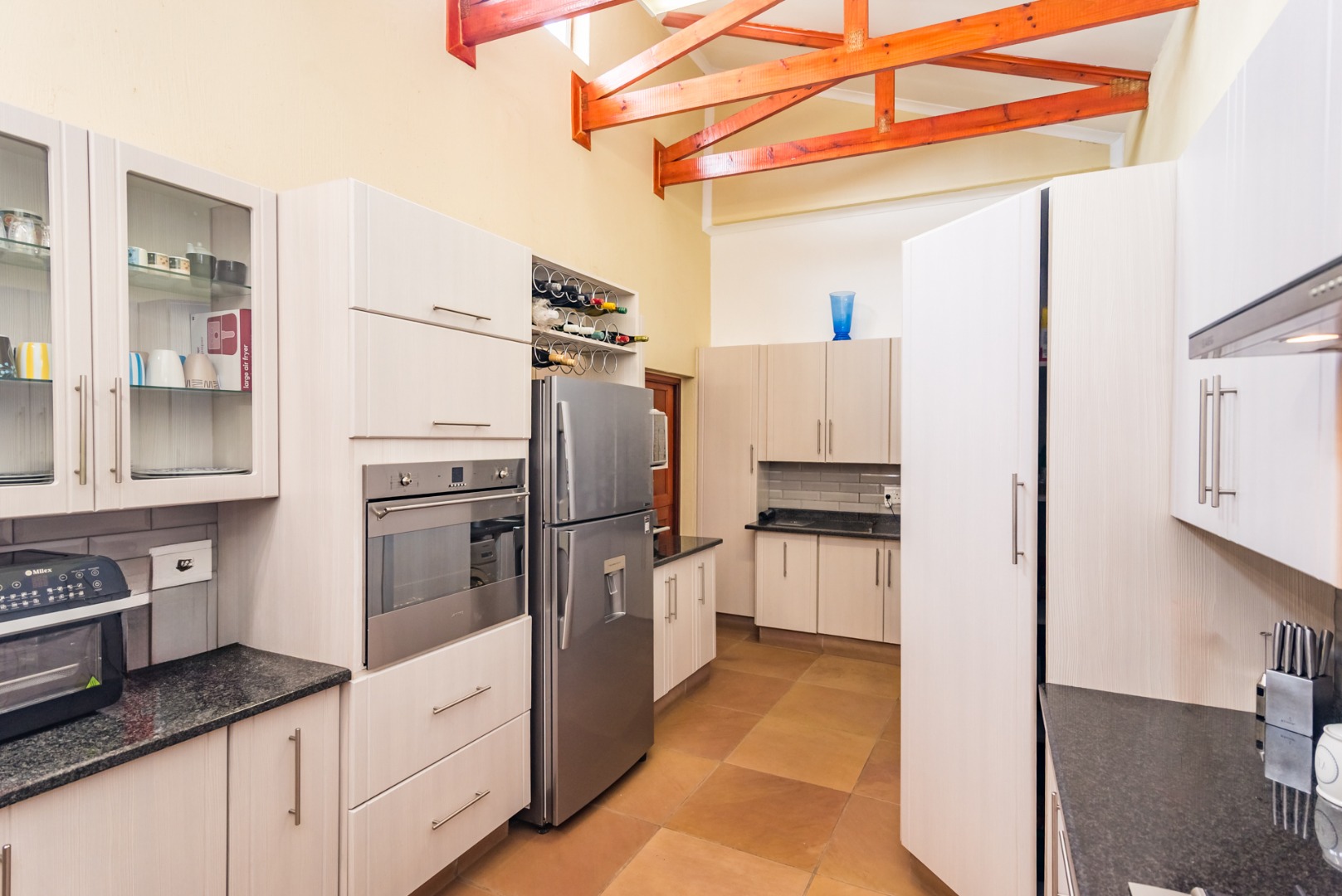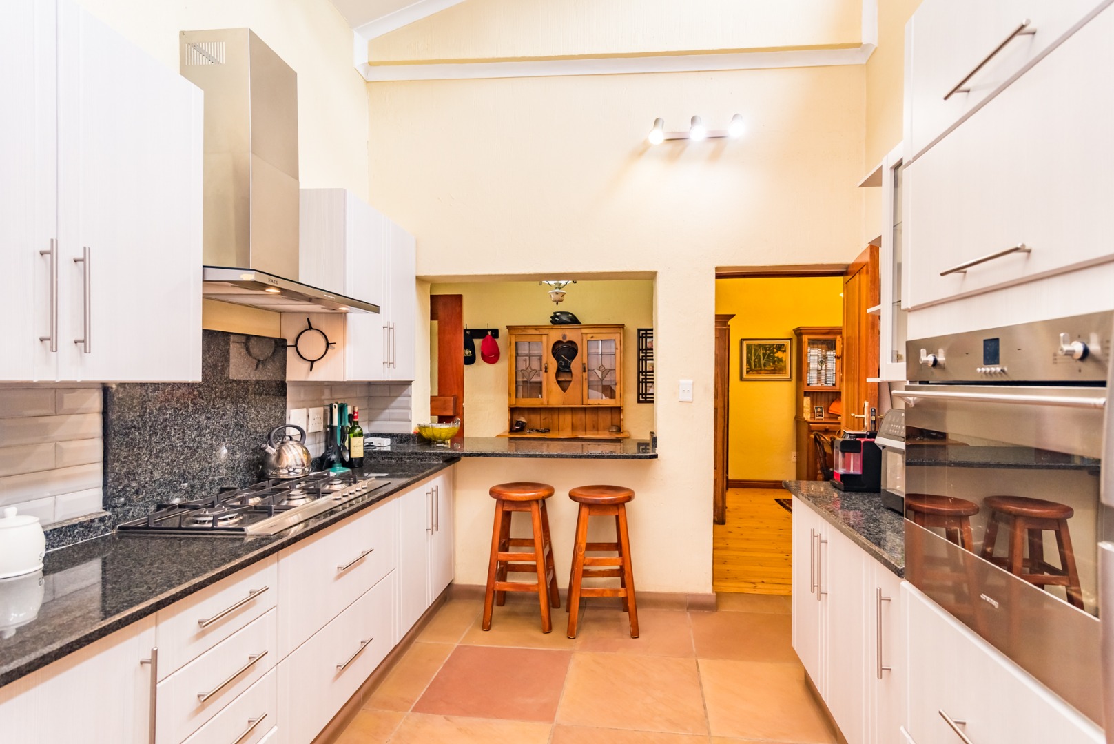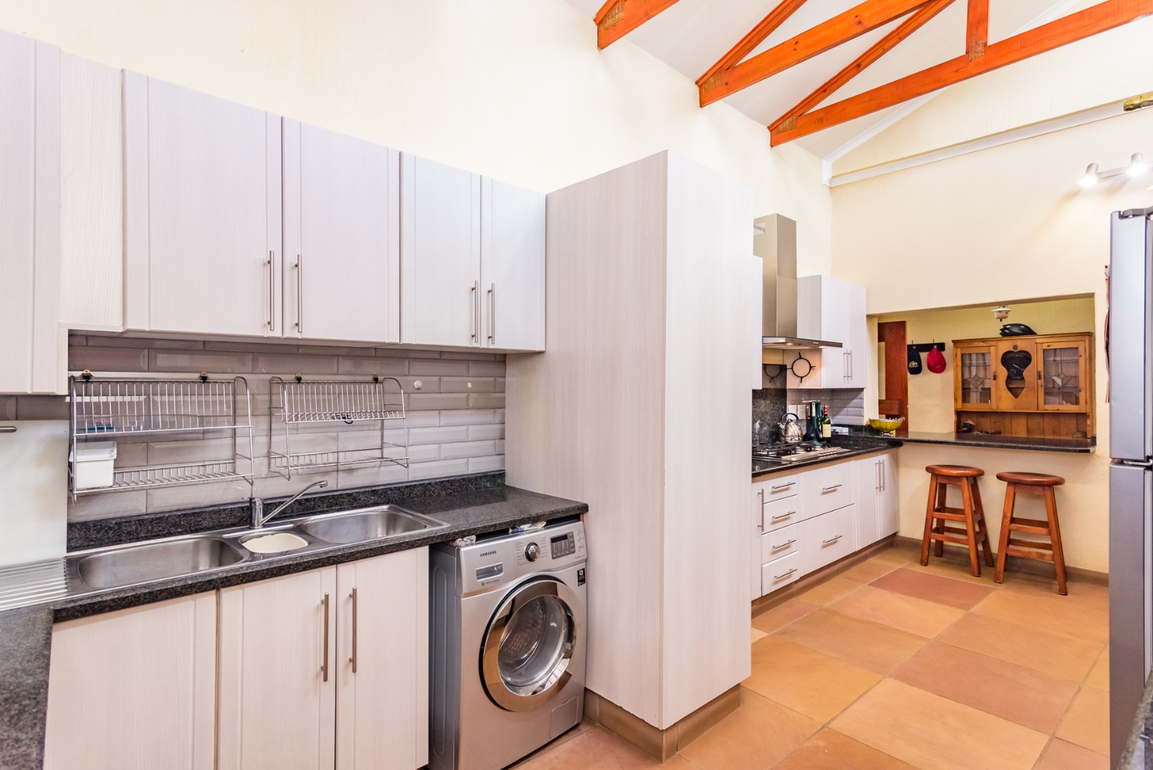 The well-appointed kitchen is equipped with modern light cabinetry, durable granite countertops, a gas hob, and integrated appliances, including a washing machine, complemented by a convenient breakfast bar. The property includes a study, offering a versatile space for work or hobbies. Outside, enjoy a refreshing pool and a well-maintained garden on the 540 sqm erf.