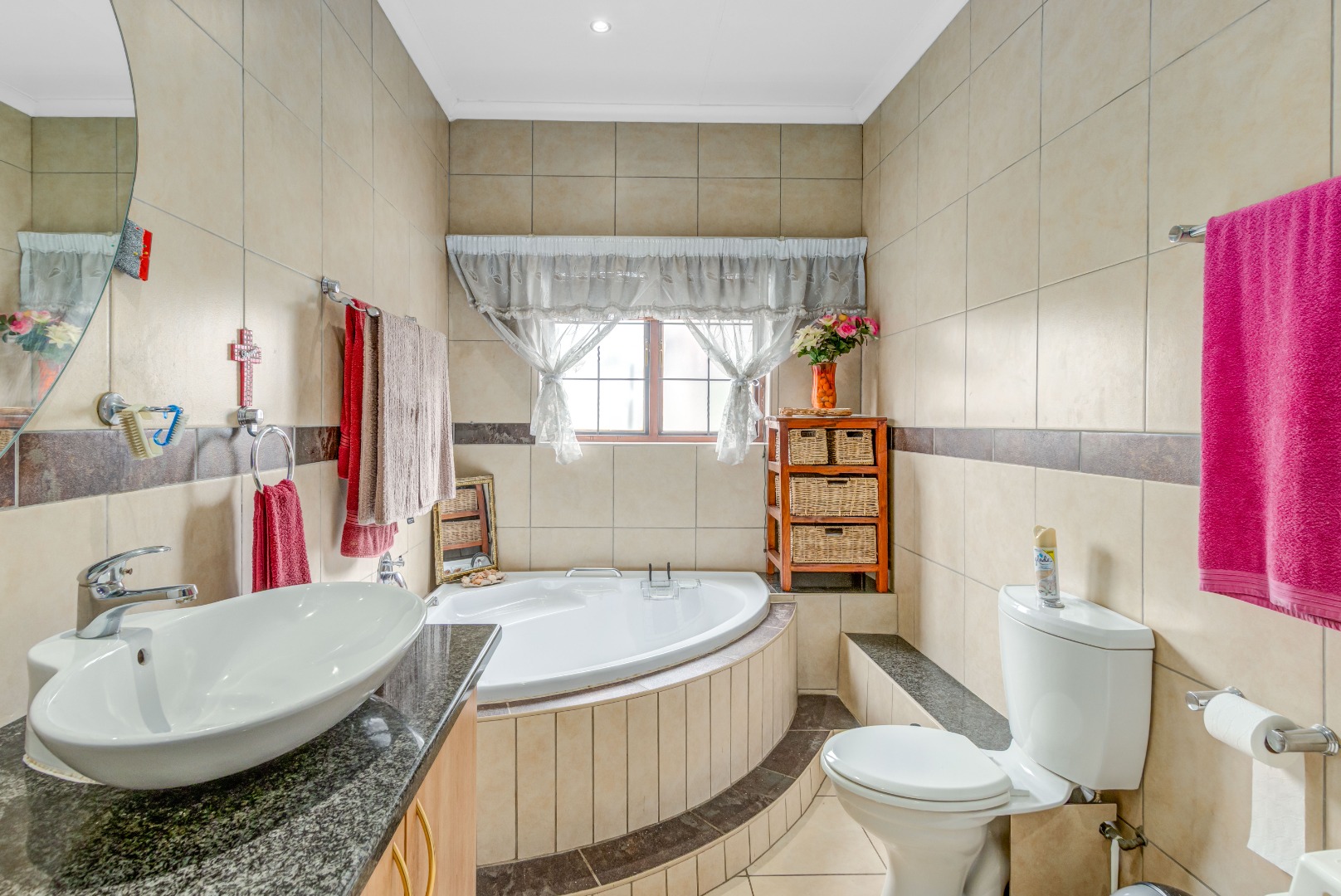 All three bedrooms are carpeted, each with generous built-in cupboards and ceiling fans for year-round comfort. The main bedroom impresses with extensive cupboard space and a private en-suite bathroom featuring a basin, toilet, and a luxurious bathtub.