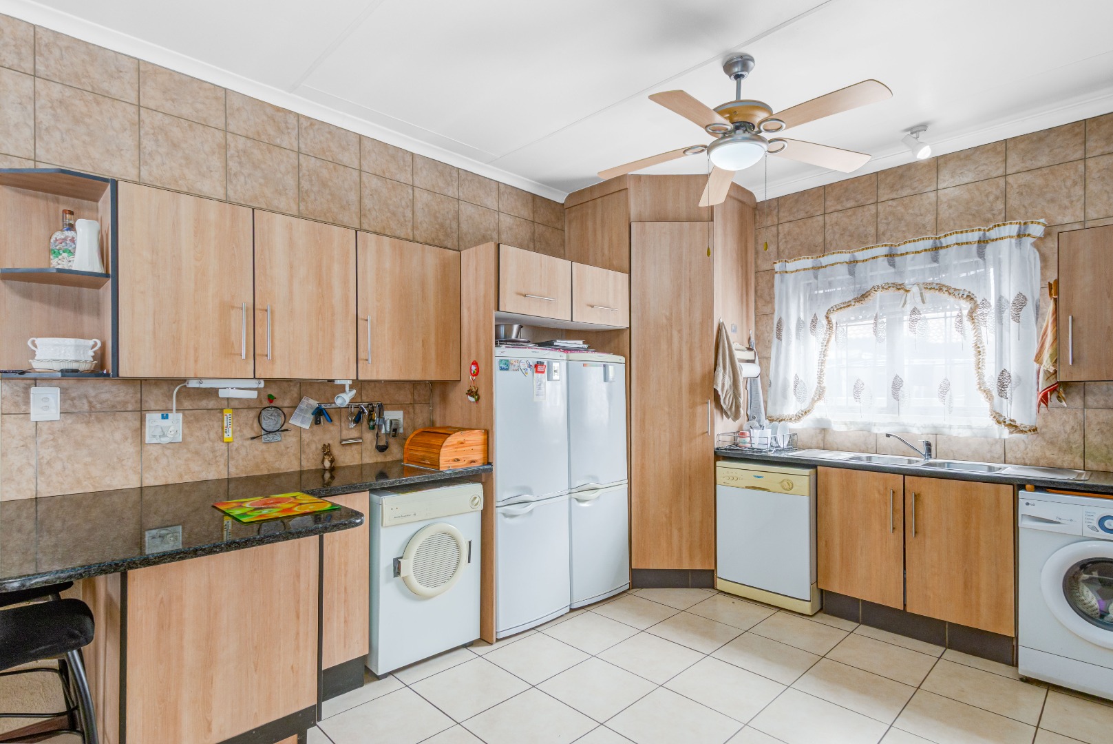 Step inside to a huge, well-appointed kitchen boasting abundant cupboard and counter space, an electric oven and stove, a double wash-up sink, space for three appliances, and room for a large double-door fridge. The extended countertop doubles as a breakfast nook, flowing comfortably into a cosy dining area.