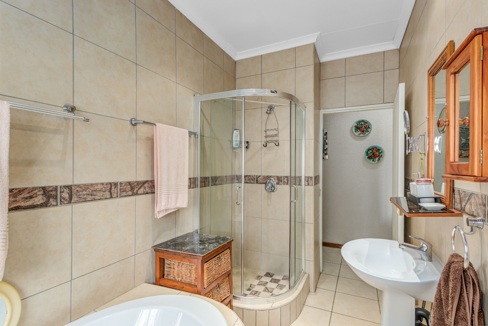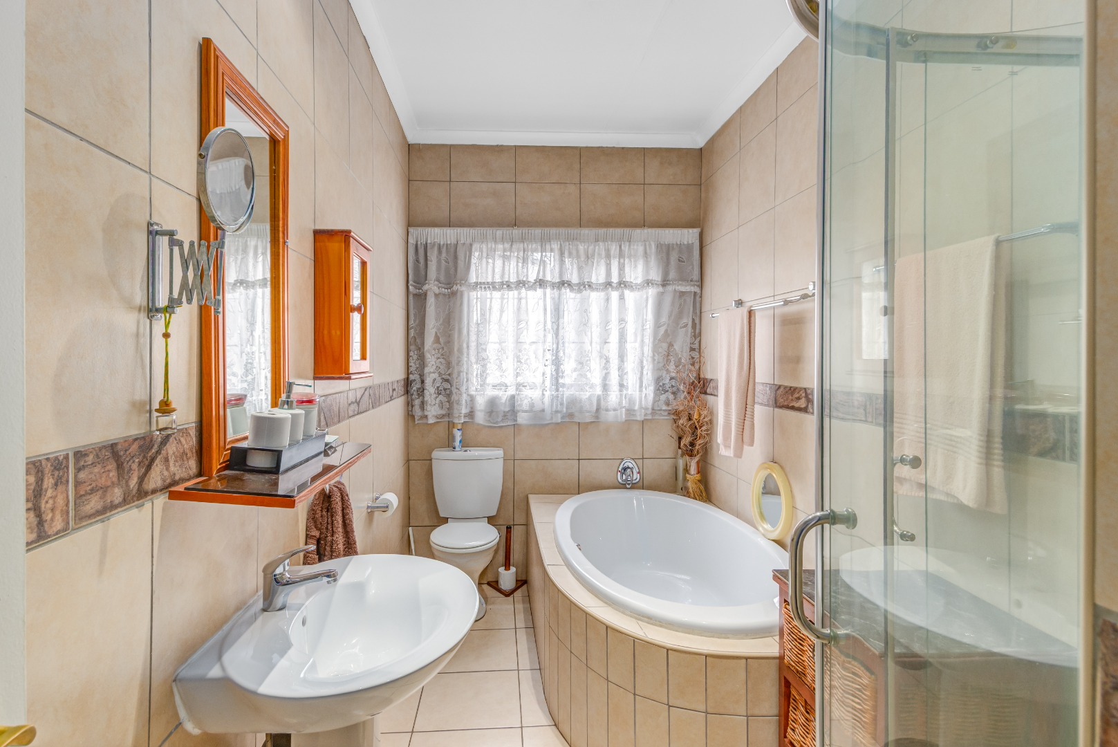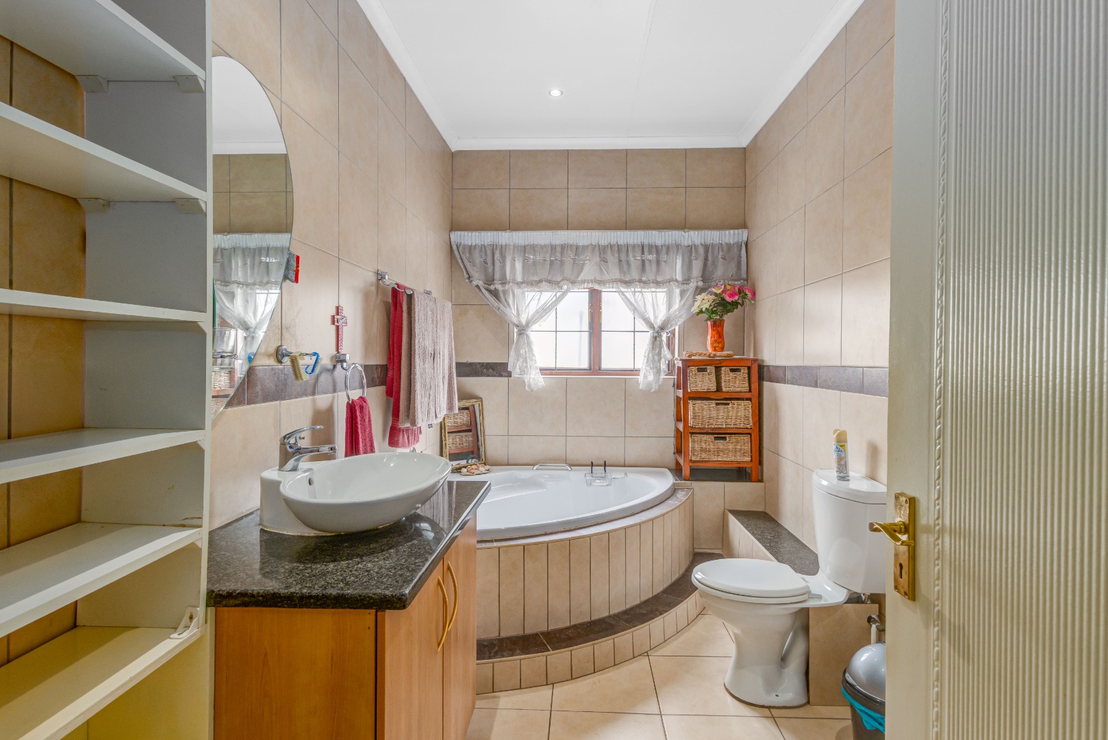 All three bedrooms are carpeted, each with generous built-in cupboards and ceiling fans for year-round comfort. The main bedroom impresses with extensive cupboard space and a private en-suite bathroom featuring a basin, toilet, and a luxurious bathtub.