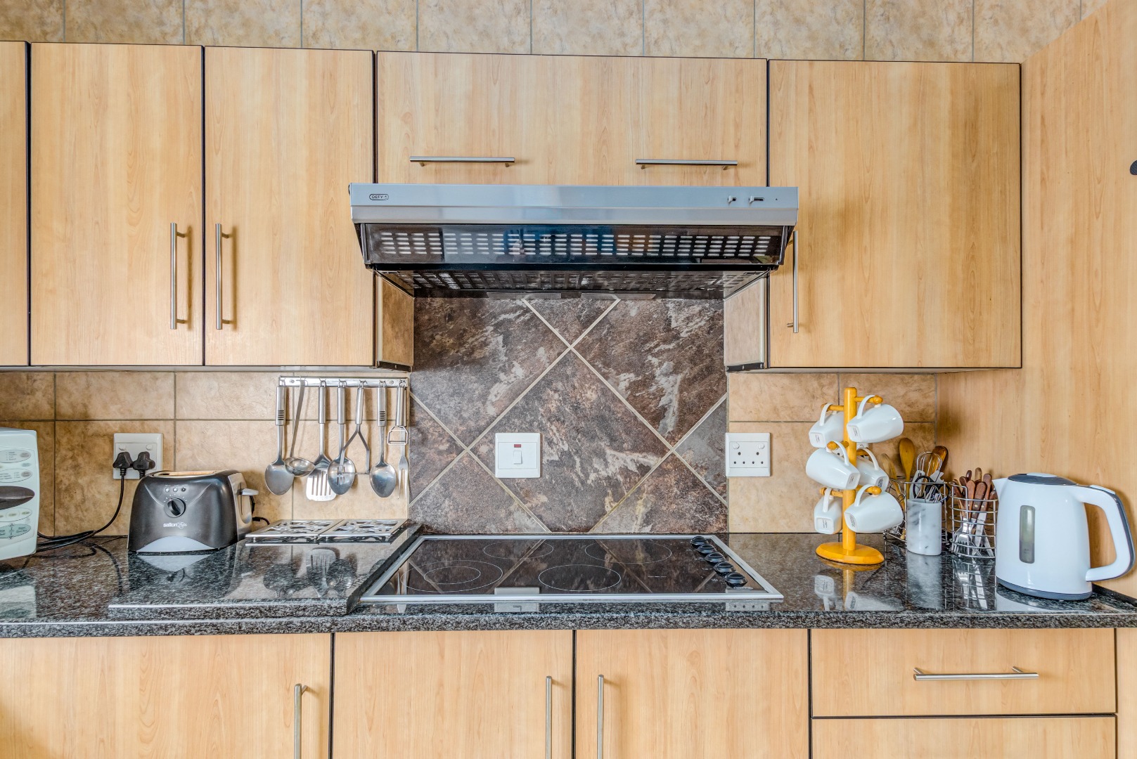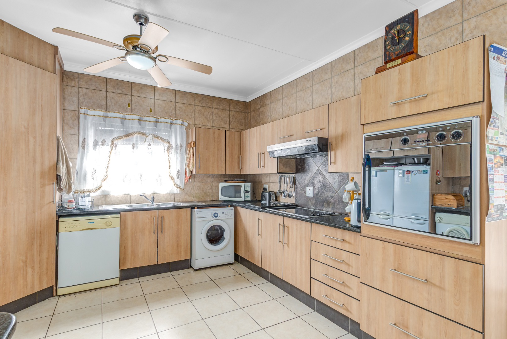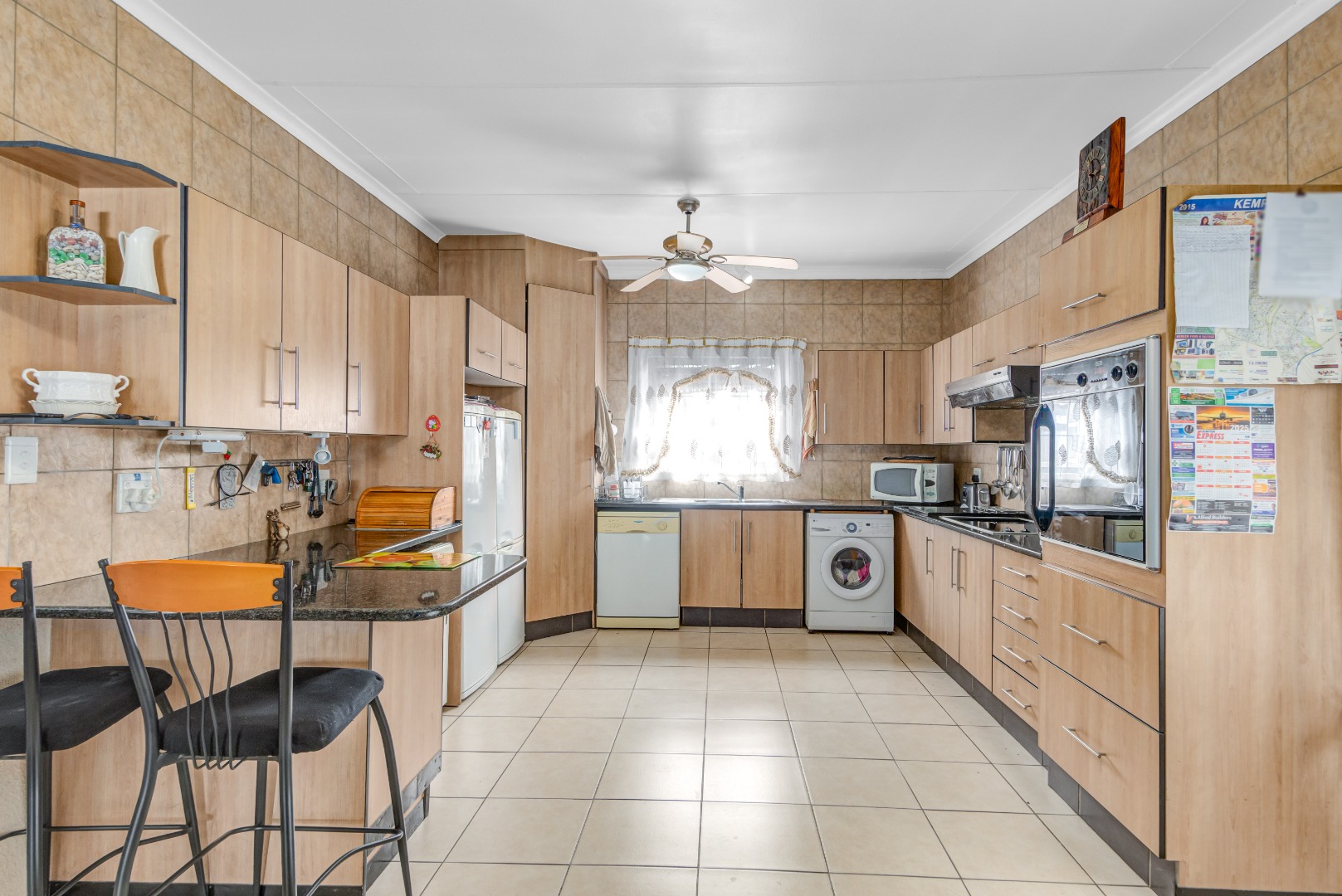 Step inside to a huge, well-appointed kitchen boasting abundant cupboard and counter space, an electric oven and stove, a double wash-up sink, space for three appliances, and room for a large double-door fridge. The extended countertop doubles as a breakfast nook, flowing comfortably into a cosy dining area.