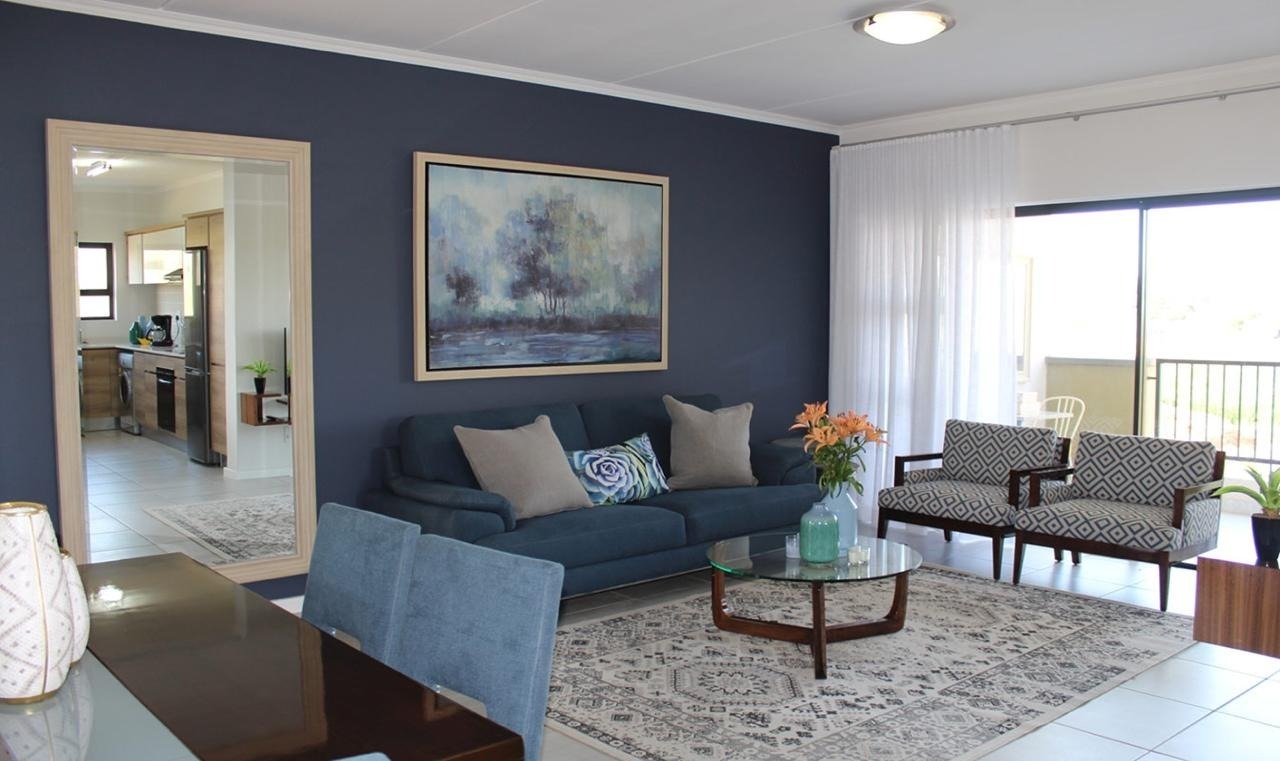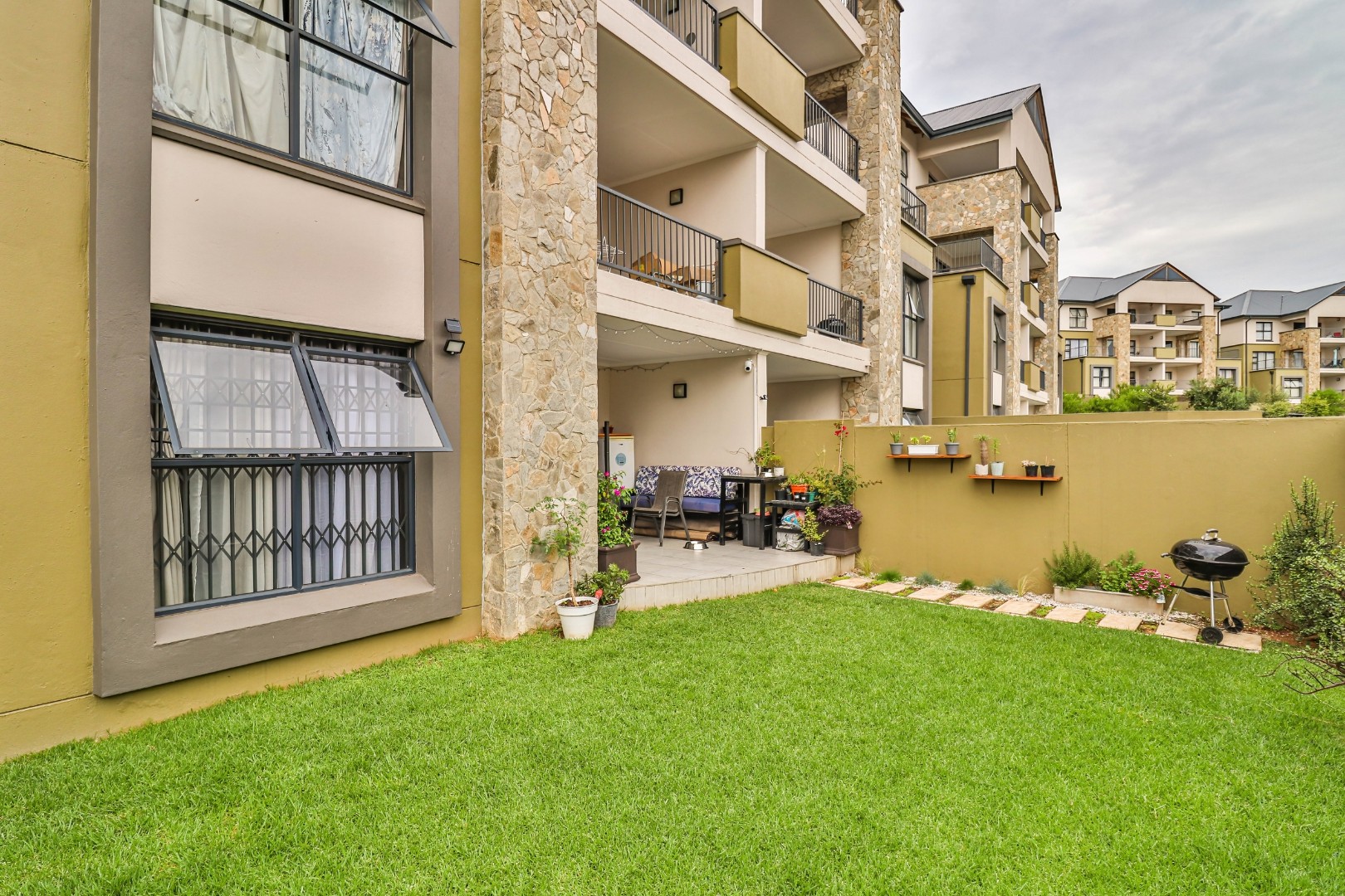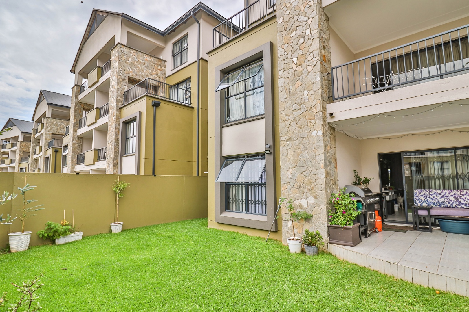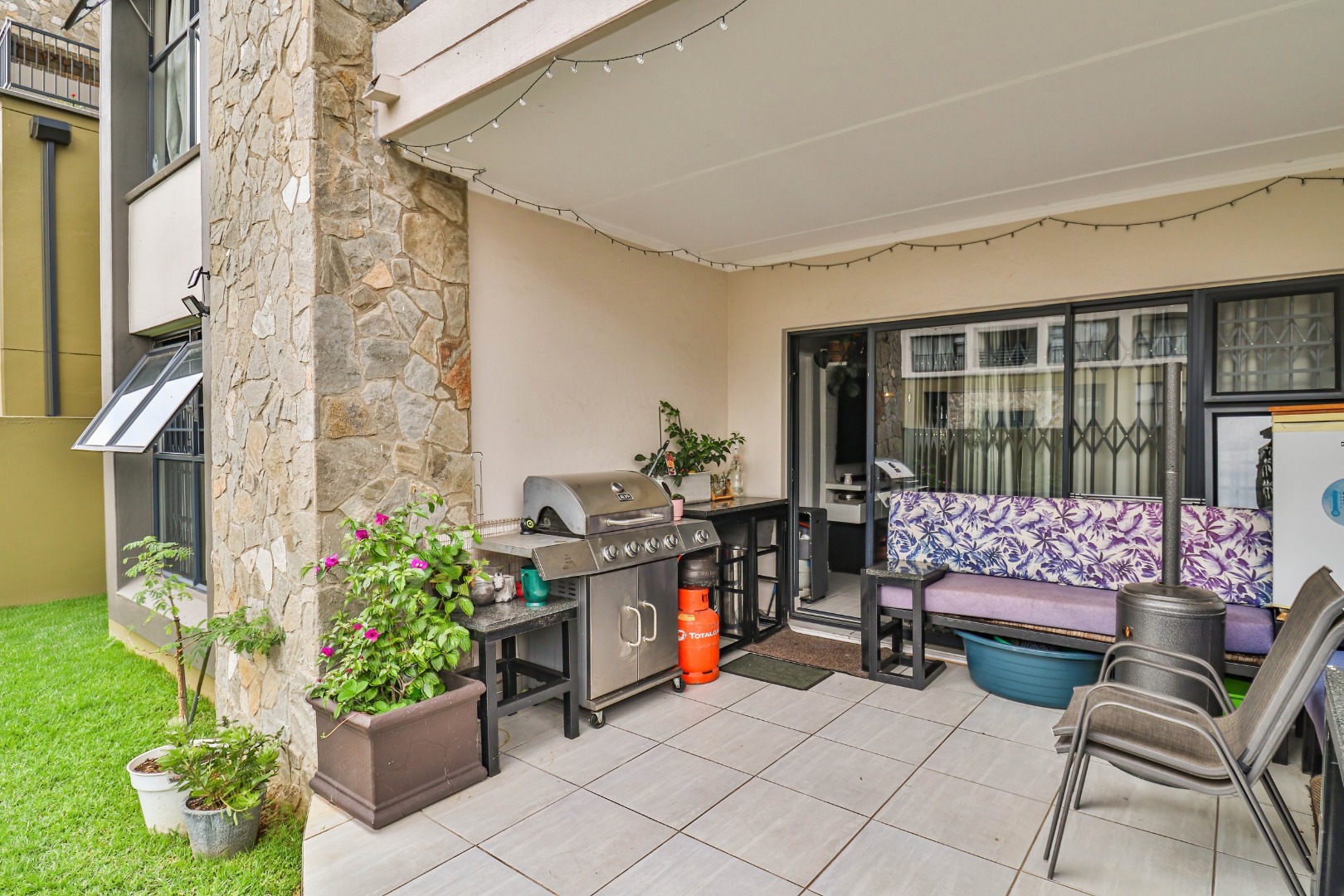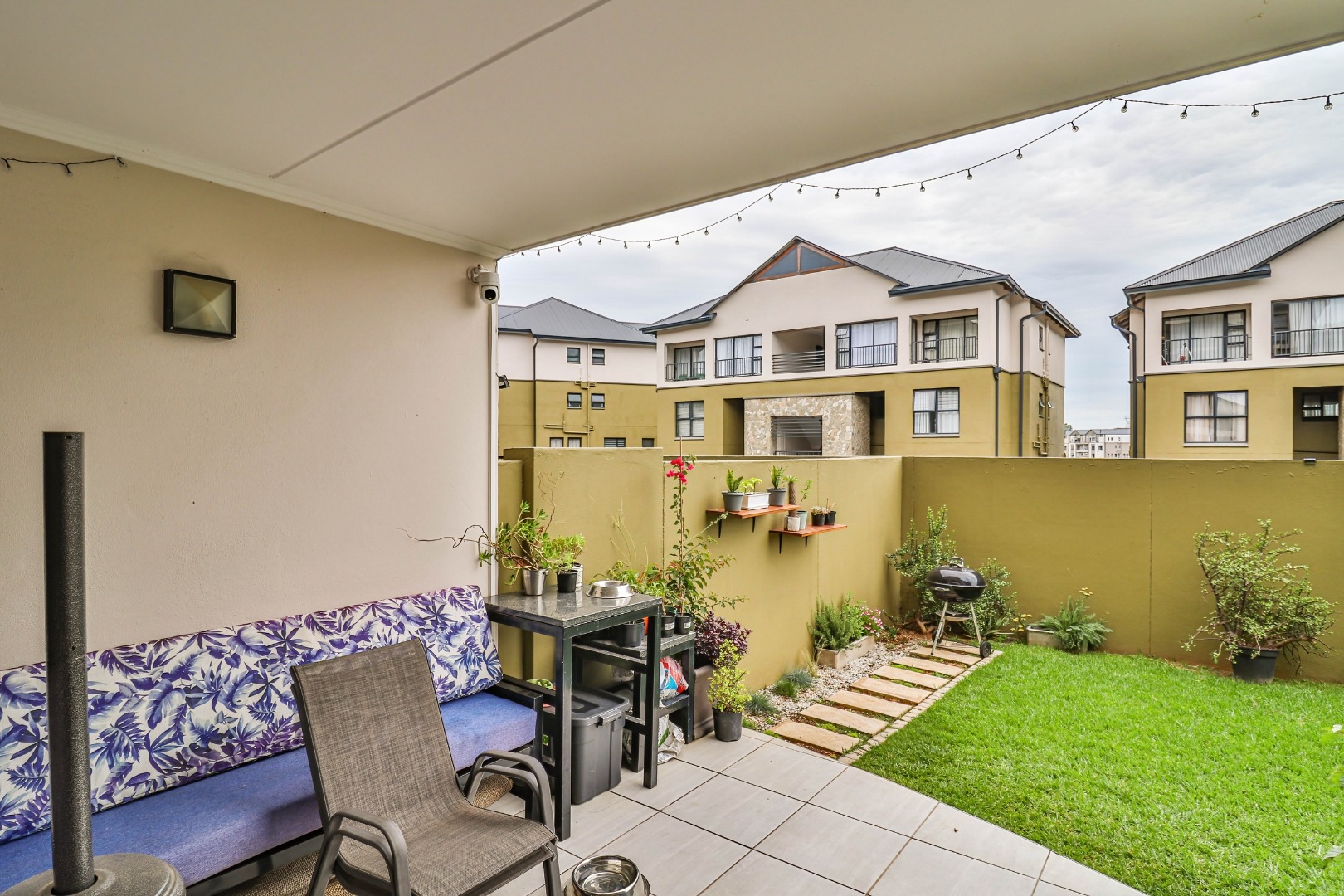 This modern 110 sqm apartment offers sophisticated estate living in Waterfall, Midrand. Its open-plan design seamlessly connects the living, dining, and kitchen areas, creating an inviting atmosphere. The contemporary kitchen boasts stylish two-tone cabinetry, integrated appliances, and a convenient washing machine, complemented by natural light. A dedicated study provides a versatile space. The residence features three comfortable bedrooms and two well-appointed bathrooms, including a private en-suite for the main bedroom. Step outside to a private ground-floor garden and a spacious covered patio, ideal for outdoor entertaining. This area, equipped with a gas grill and string lights, offers direct access to a small, well-maintained lawn. Residents also benefit from exceptional estate amenities: a communal pool, fully equipped gym, squash court, and clubhouse. Security is paramount, with features such as security gates, burglar bars, electric fencing, a security post, and an access gate within a totally walled property. The home includes a battery inverter for uninterrupted power and fibre connectivity. Water tanks contribute to sustainability, and the property is wheelchair friendly. Waterfall, Midrand, offers a desirable suburban estate environment, combining modern conveniences with a secure and vibrant community lifestyle. **Key Features:** * 3 Bedrooms, 2 Bathrooms (1 En-suite) * 110 sqm Floor Size * Open-Plan Living, Dining & Kitchen * Modern Kitchen with Integrated Appliances * Private Covered Patio & Garden * Estate Amenities: Pool, Gym, Squash Court, Clubhouse * Battery Inverter & Fibre Ready * Enhanced Security Features * Wheelchair Friendly * Dedicated Study