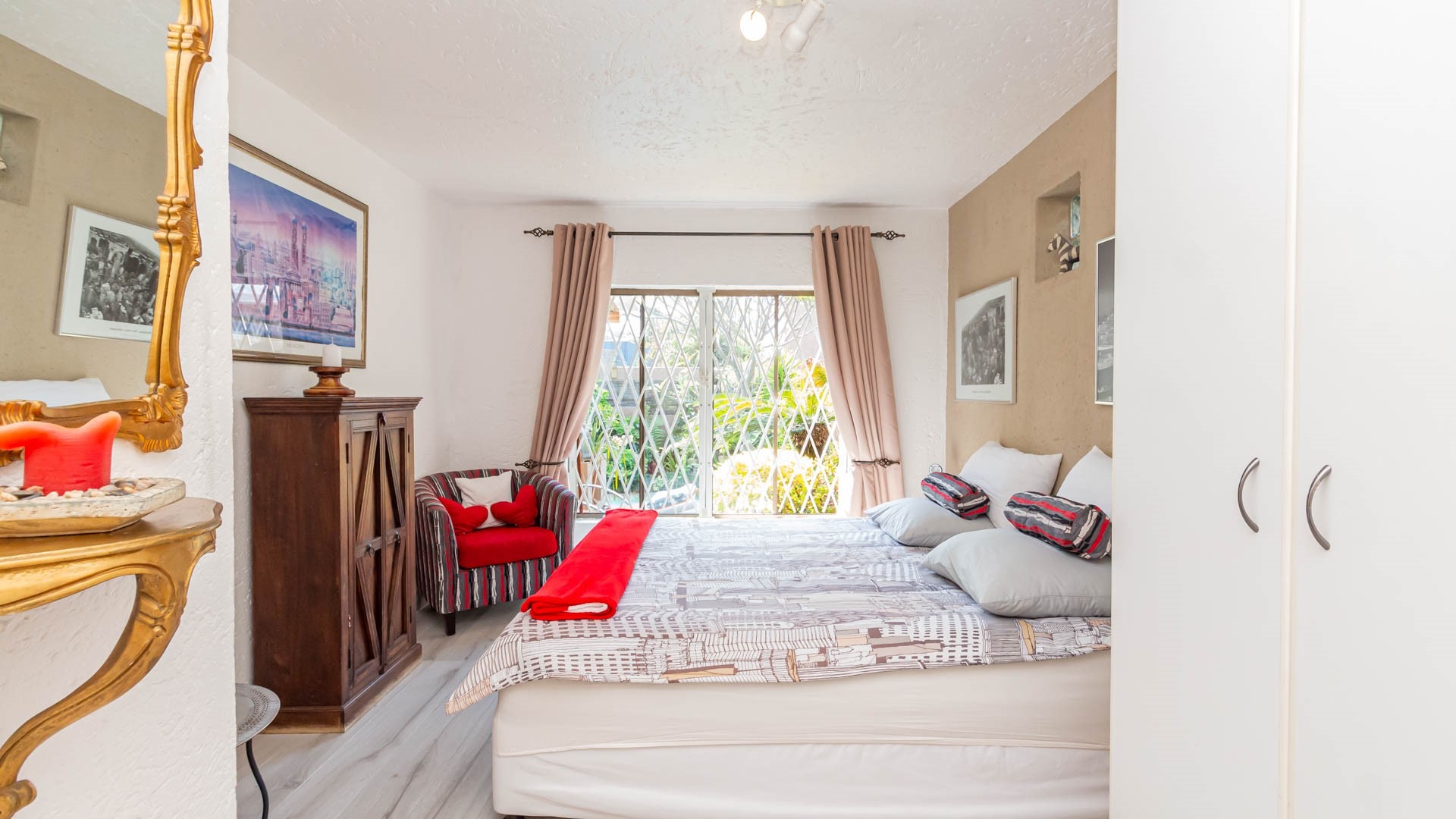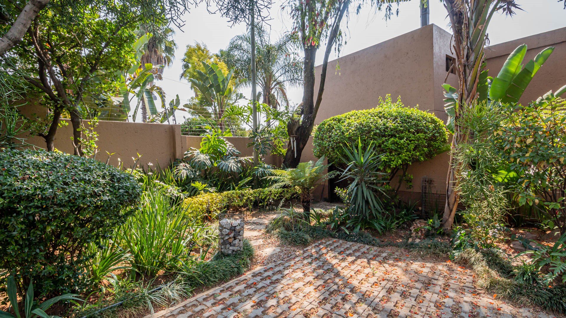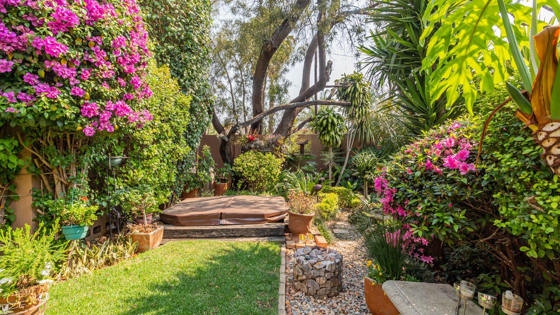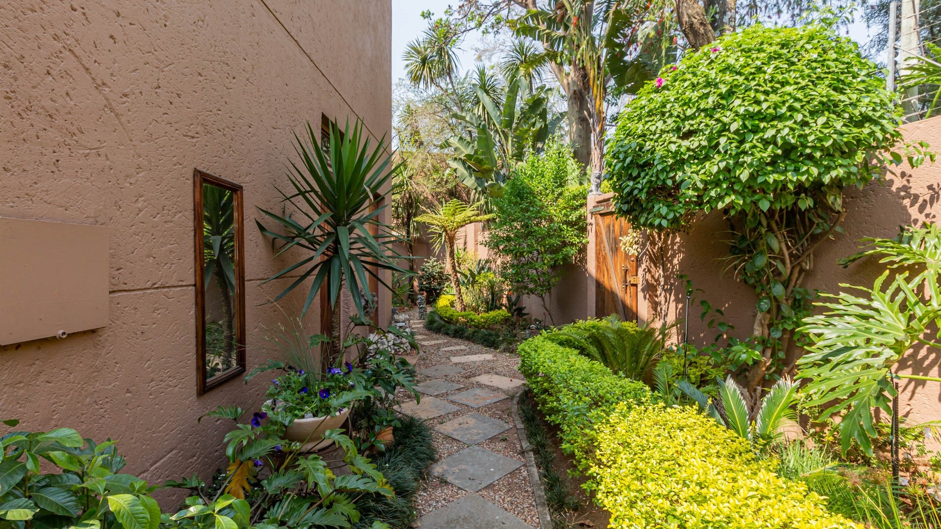 The ground floor is an open concept modern gourmet kitchen, lounge, and dining room with sliding doors onto a patio with a “water wall” feature overlooking a sparkling swimming pool in a simply beautiful garden, also home to a private jacuzzi. The double 2nd bedroom and 3rd guest bedroom, currently used as a snug, are also located on this floor and serviced