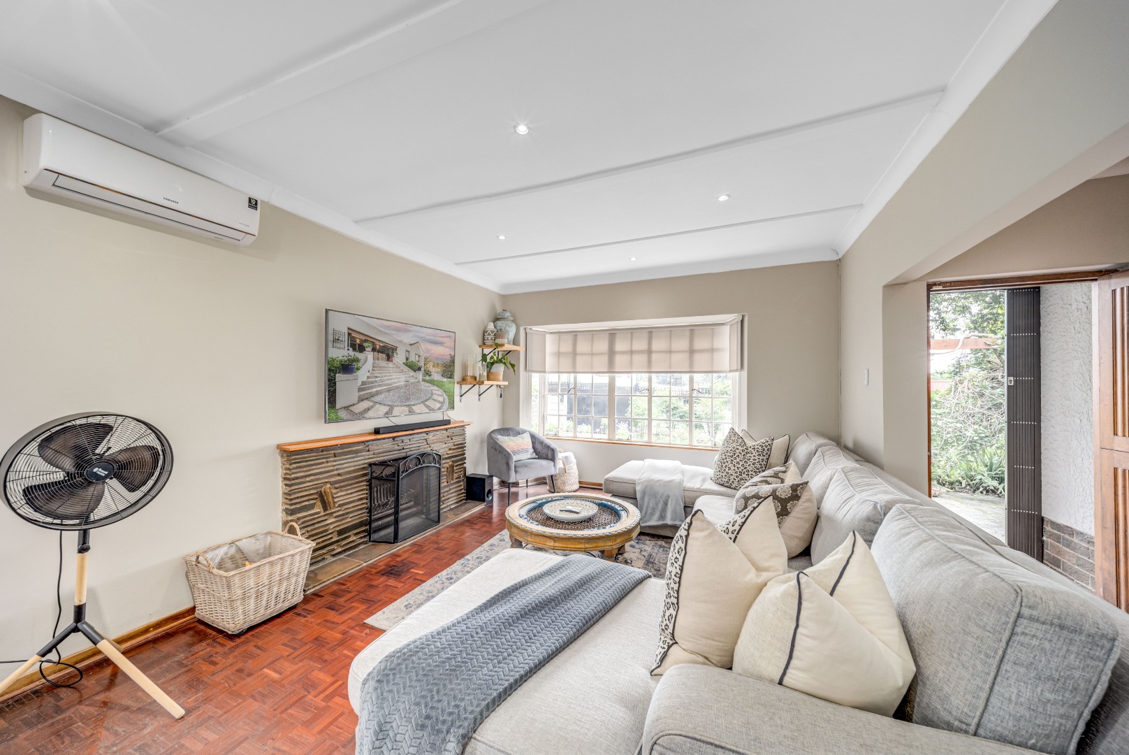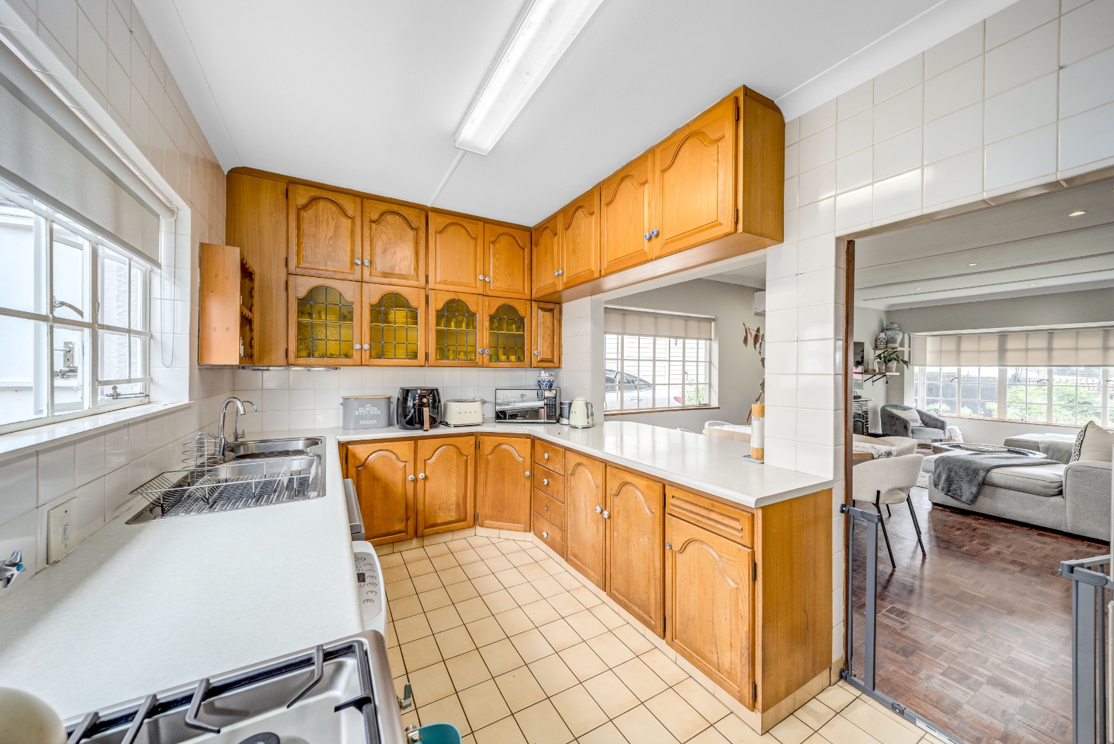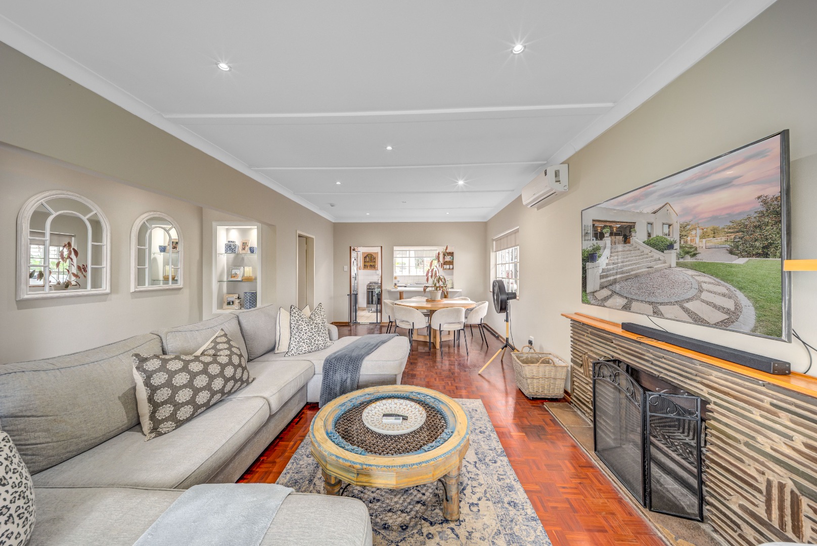 The home offers open-plan living, with the kitchen overlooking the dining and lounge areas, all air-conditioned for year-round comfort.