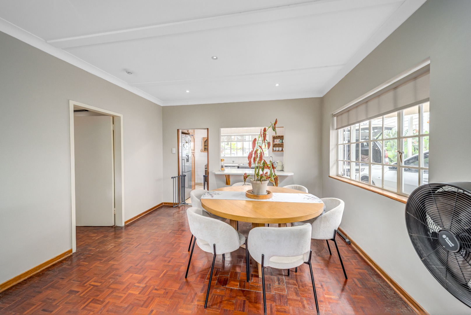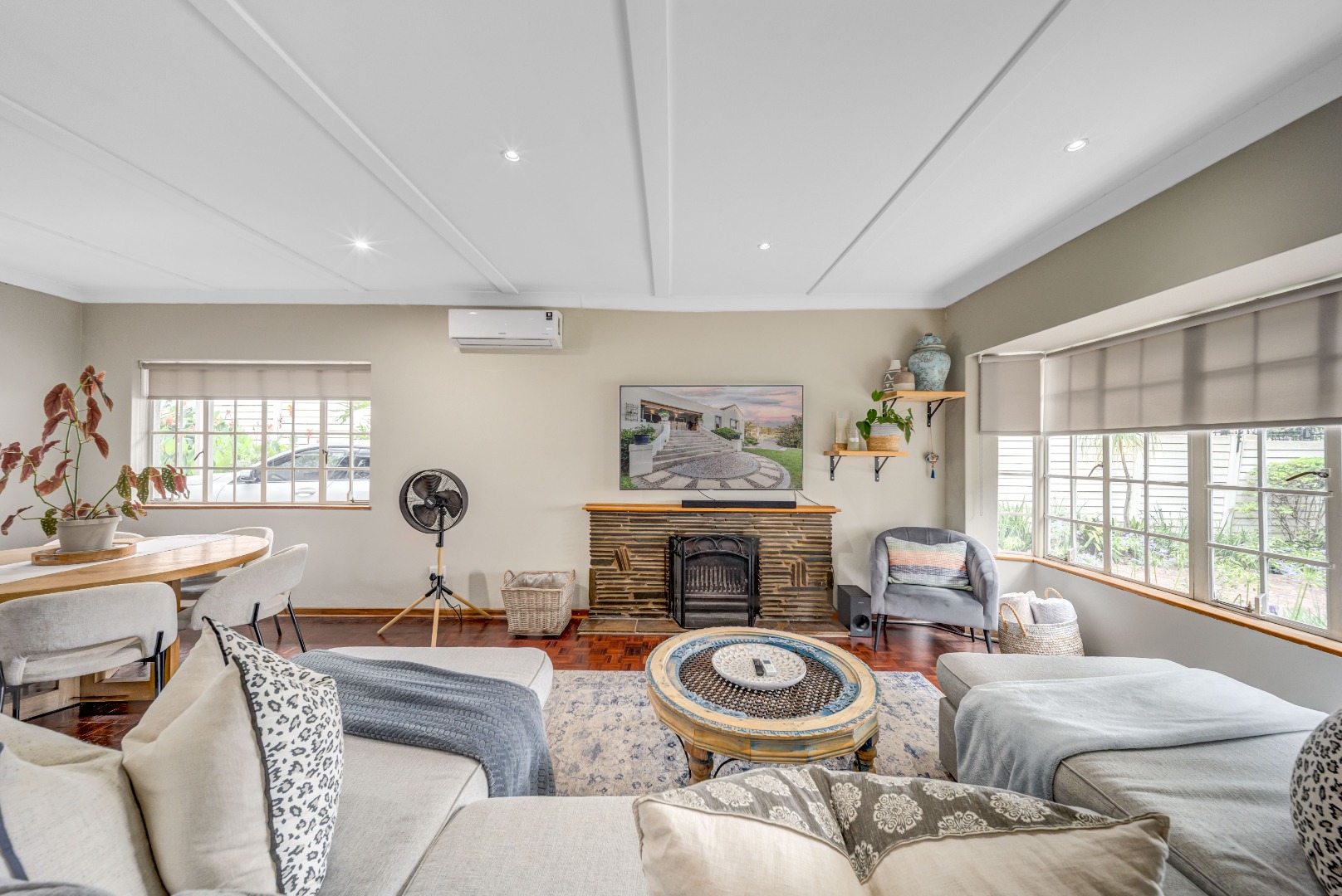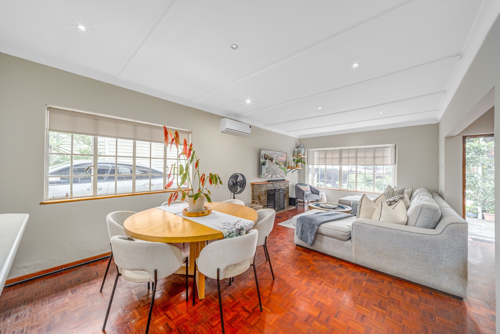 The home offers open-plan living, with the kitchen overlooking the dining and lounge areas, all air-conditioned for year-round comfort.