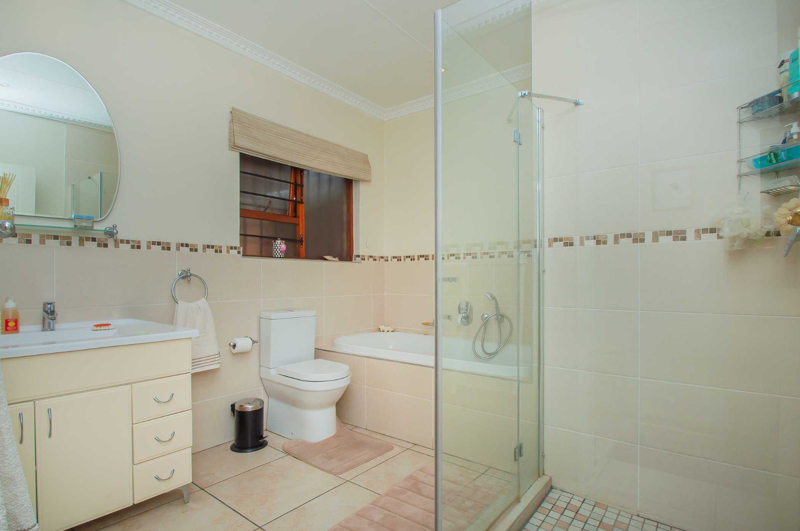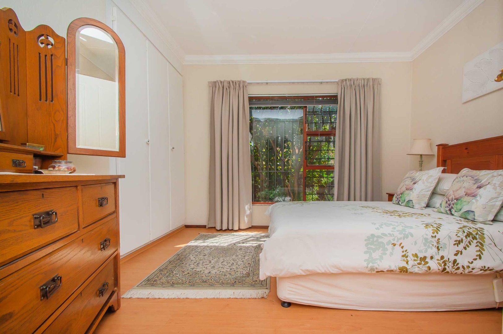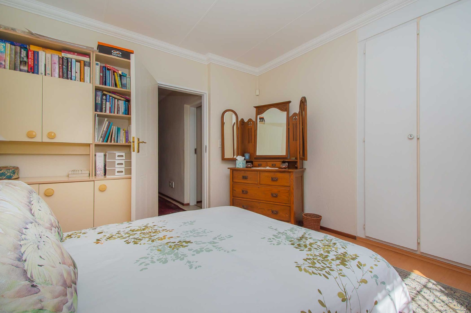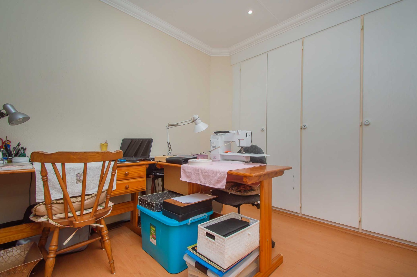 Two additional bedrooms are spacious with laminated flooring and built-in cupboards. The shared bathroom is neatly tiled and offers a bath, shower, basin, and toilet. Linen cupboard in passage.