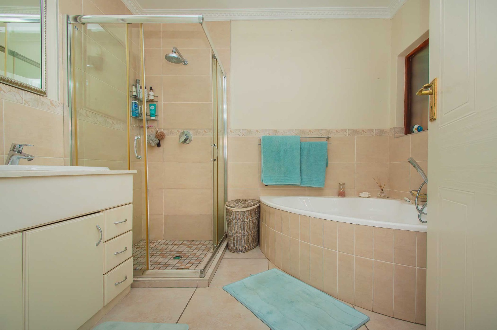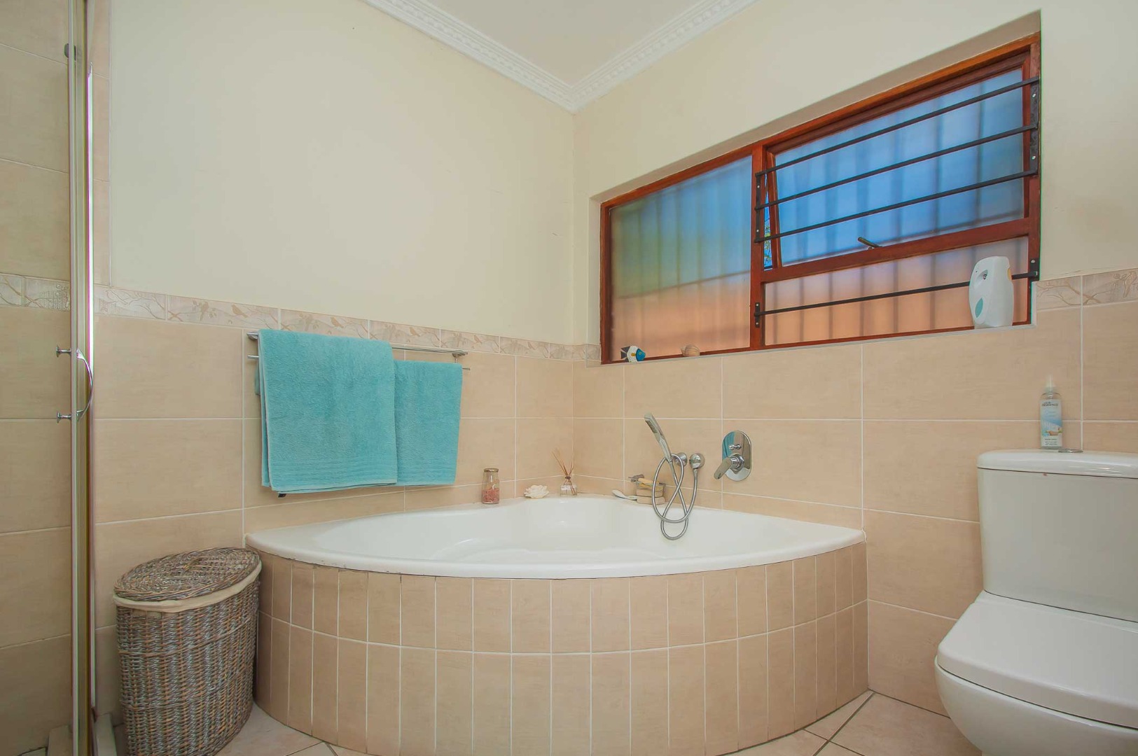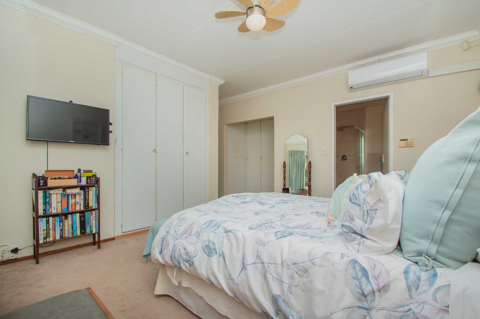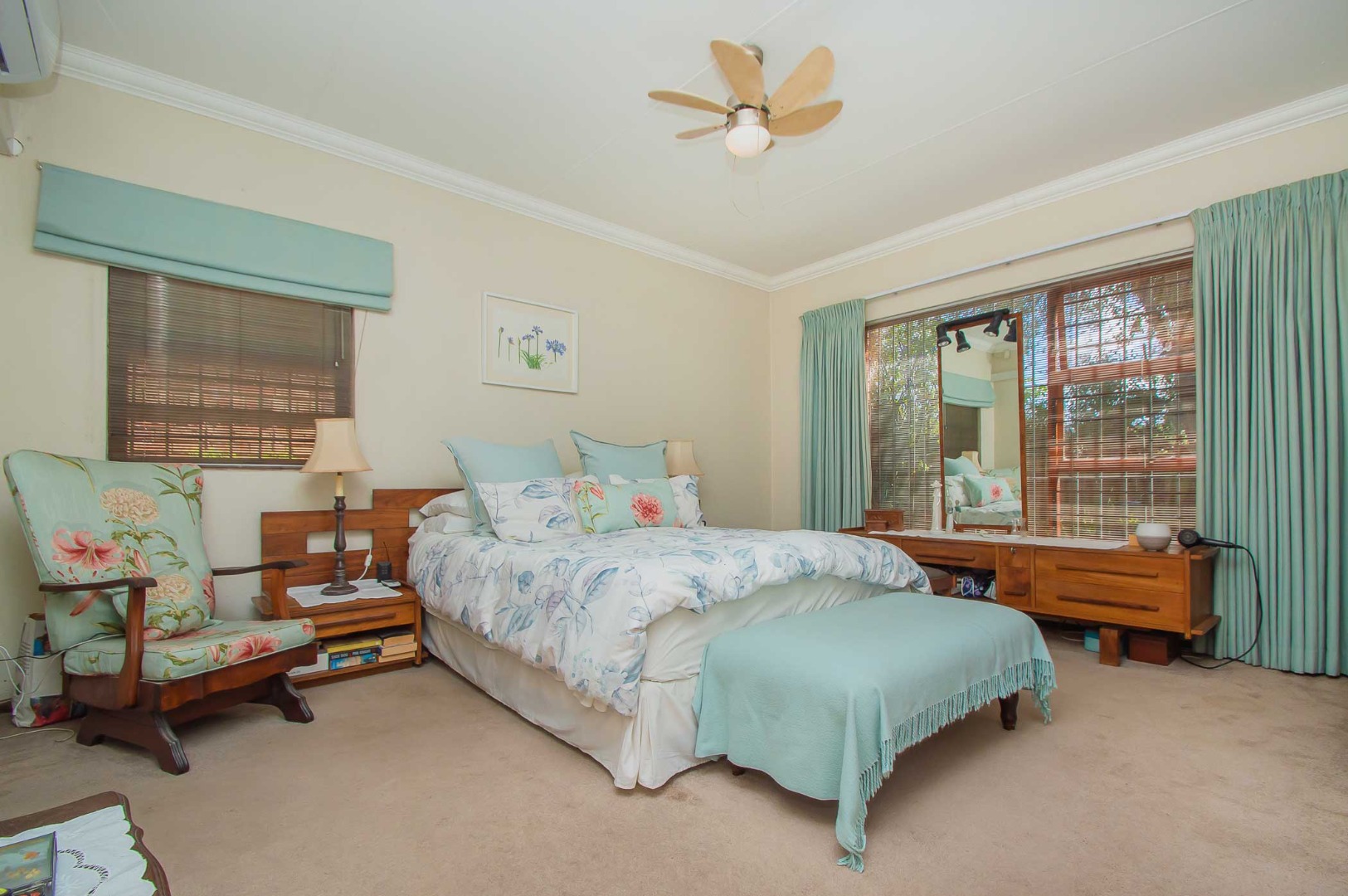 The main bedroom is a private retreat, featuring carpets, an air conditioner, ample built-in cupboards, and a walk-in dressing area. The en-suite bathroom is designed with relaxation in mind, complete with a double vanity, large corner spa-style bath, shower, and toilet.
