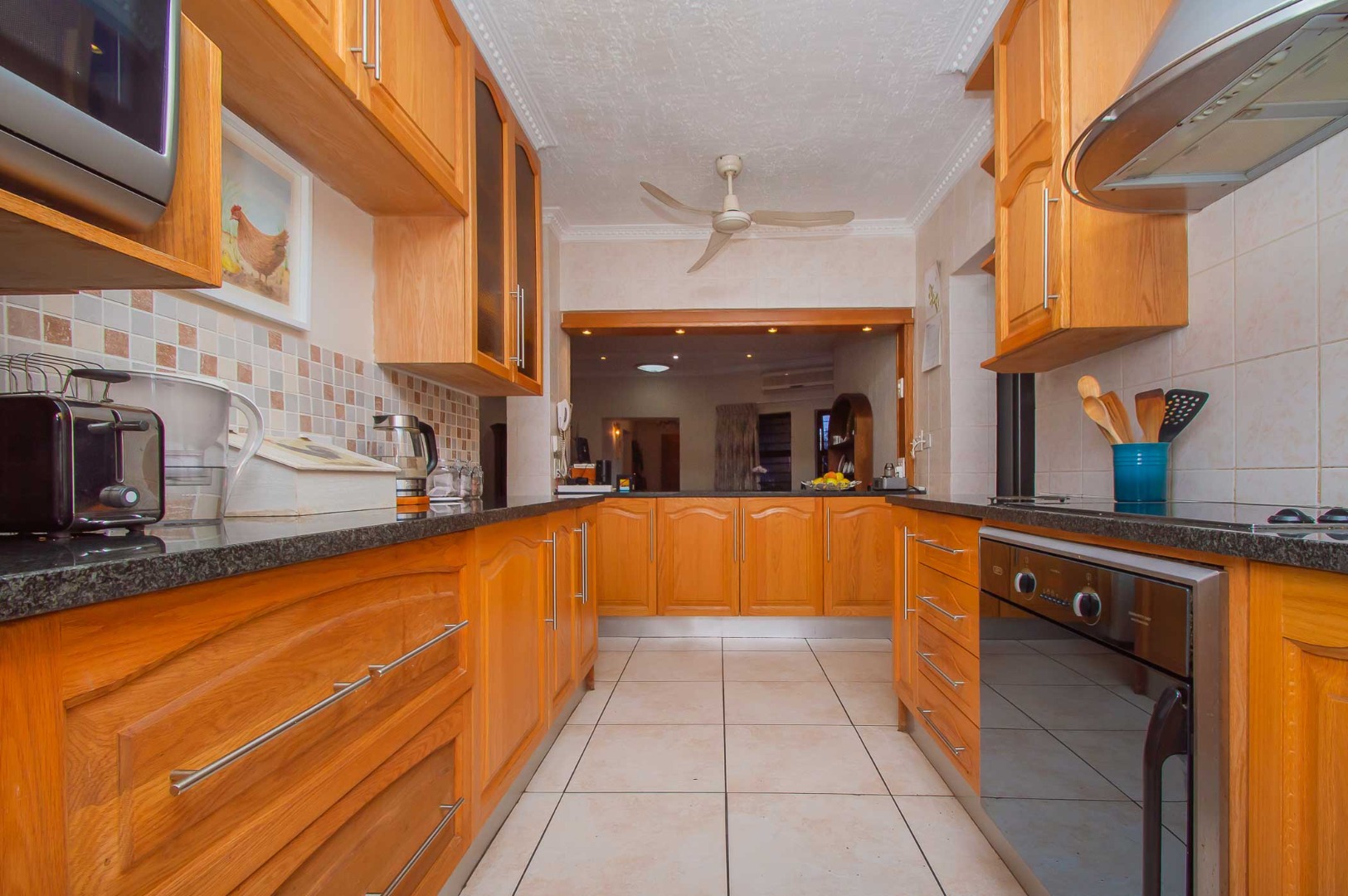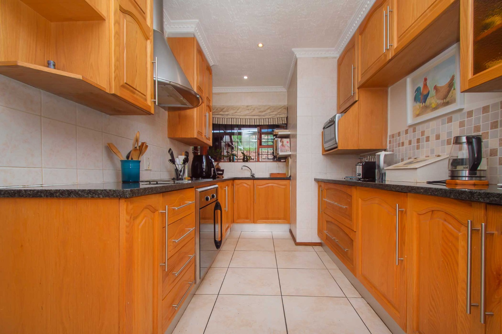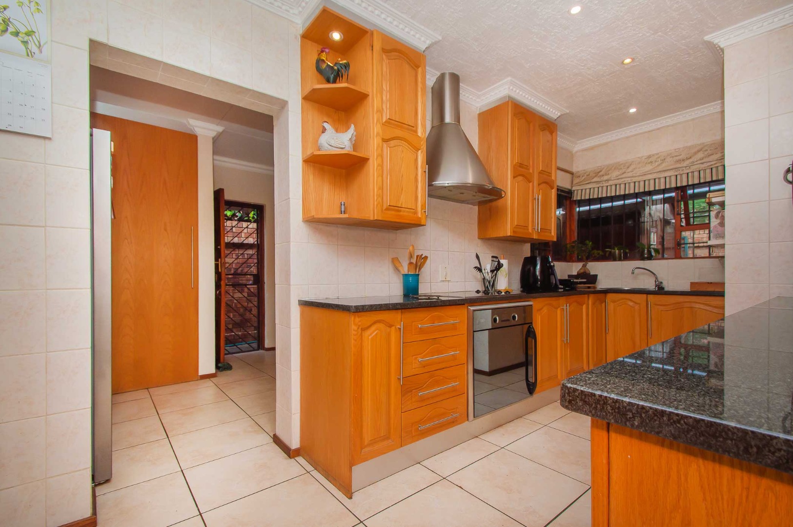The kitchen is both practical and stylish, fitted with Rustenburg granite countertops, solid oak cupboards, a dedicated prep area, and a separate scullery with double sink. There is space for two appliances, a double-door fridge, plus pantry and broom cupboards for added convenience.