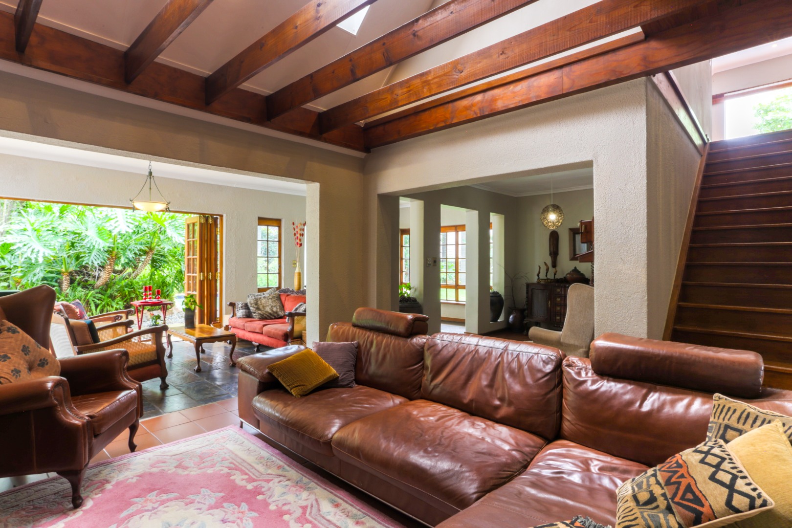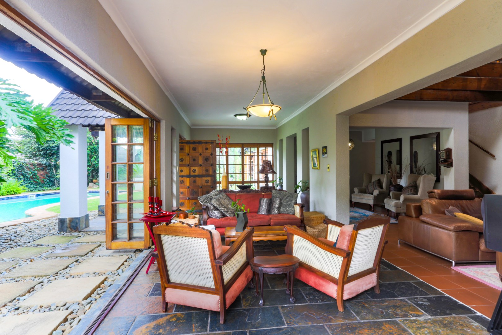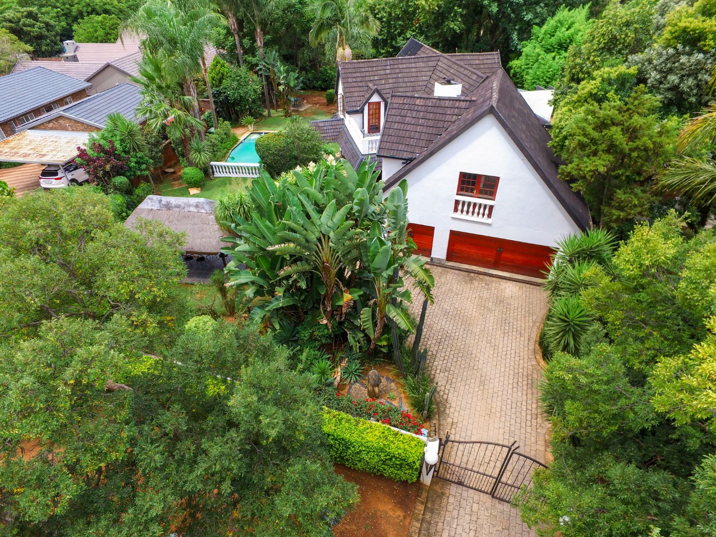 The spacious garden with mature trees and wide lawns offers plenty of room for children to play, complemented by a heated swimming pool. Additional features include a triple garage, staff room, and a separate income-generating cottage.