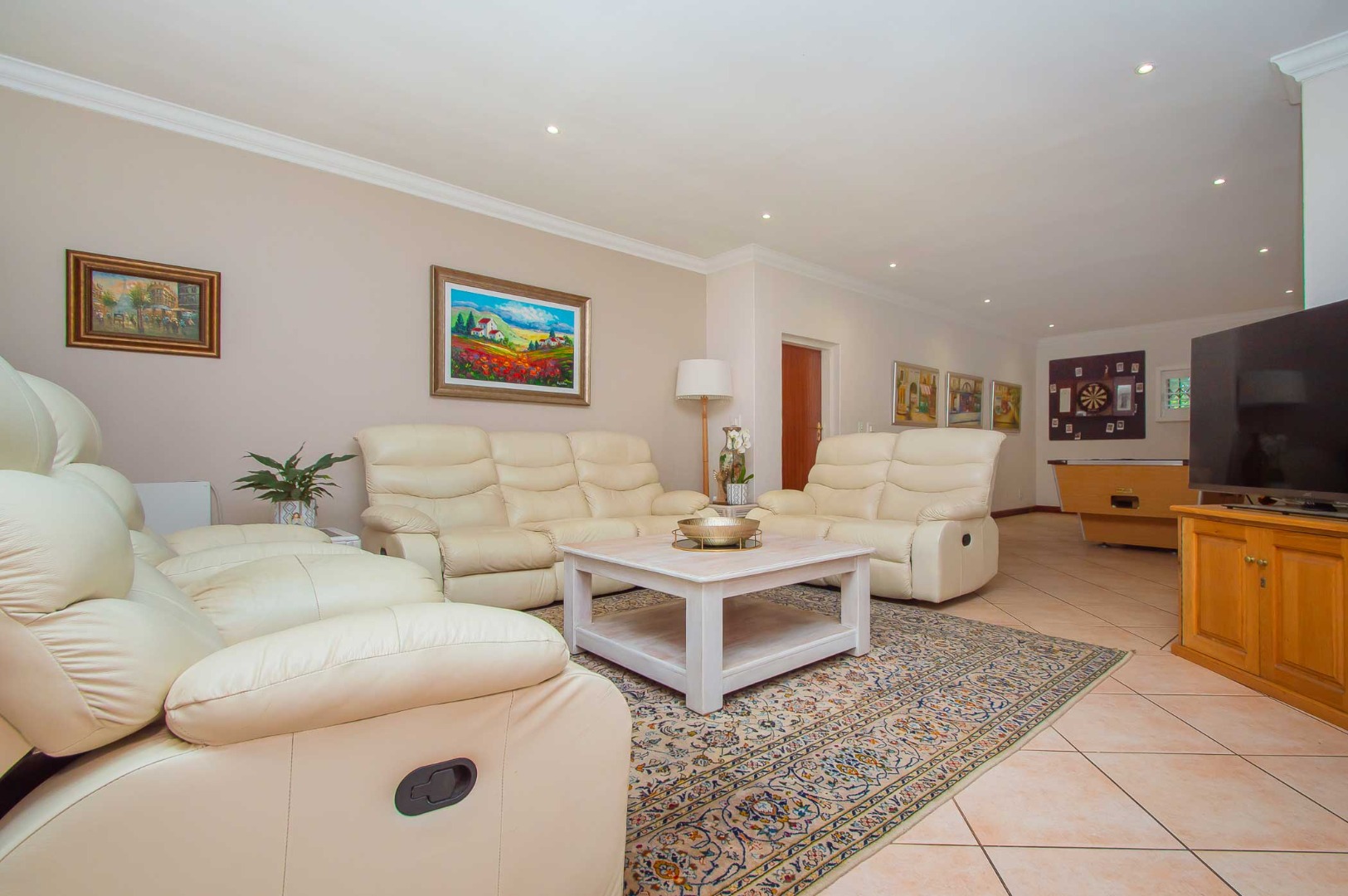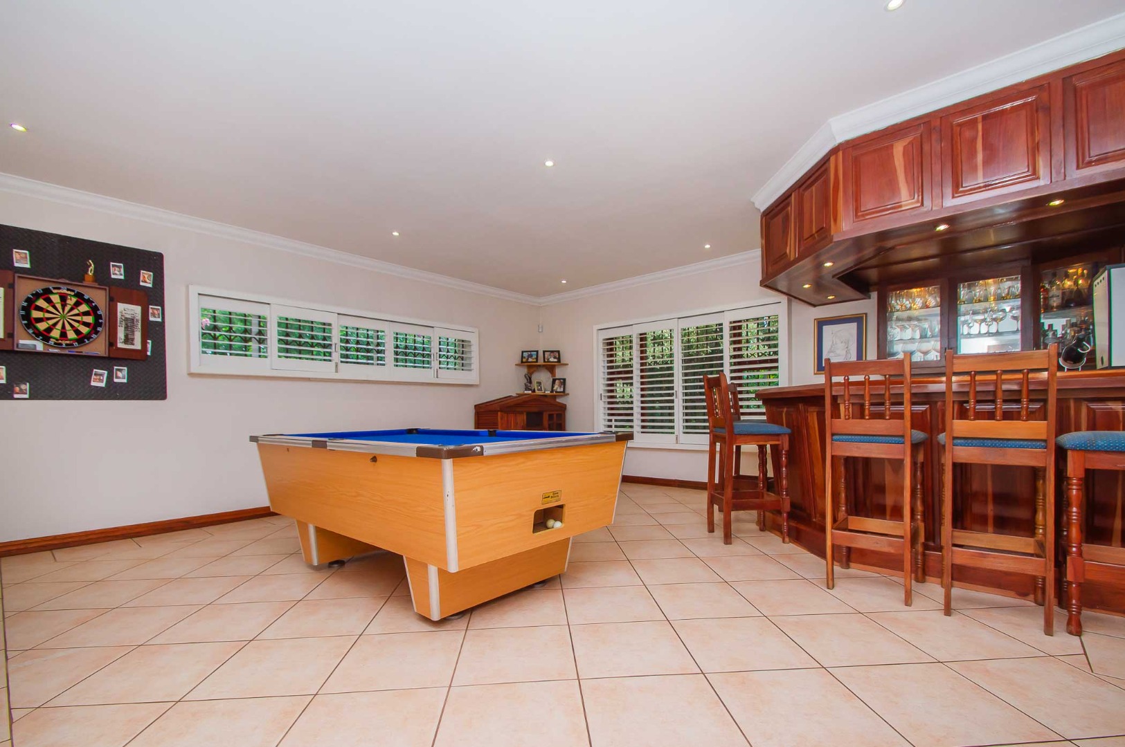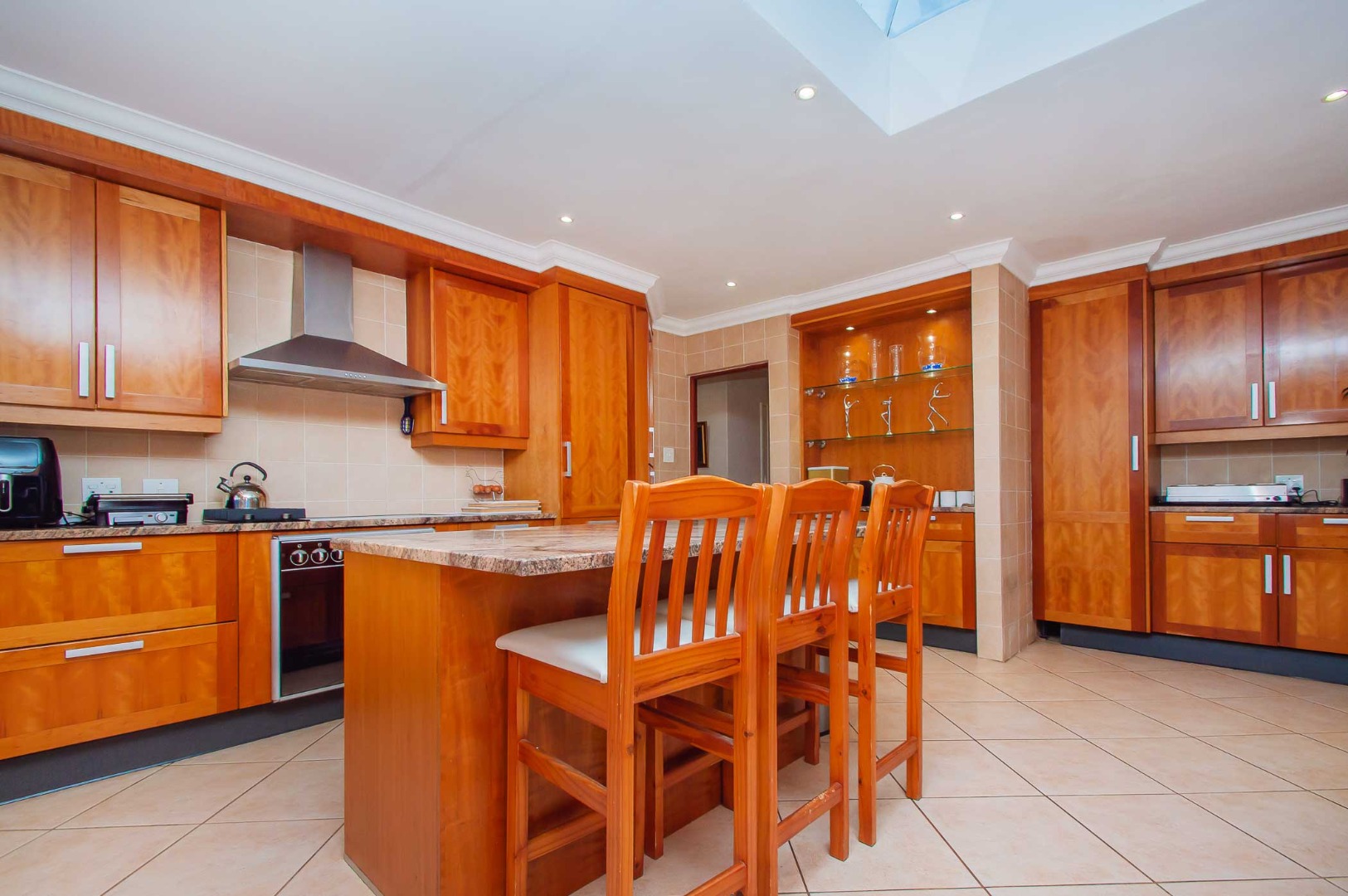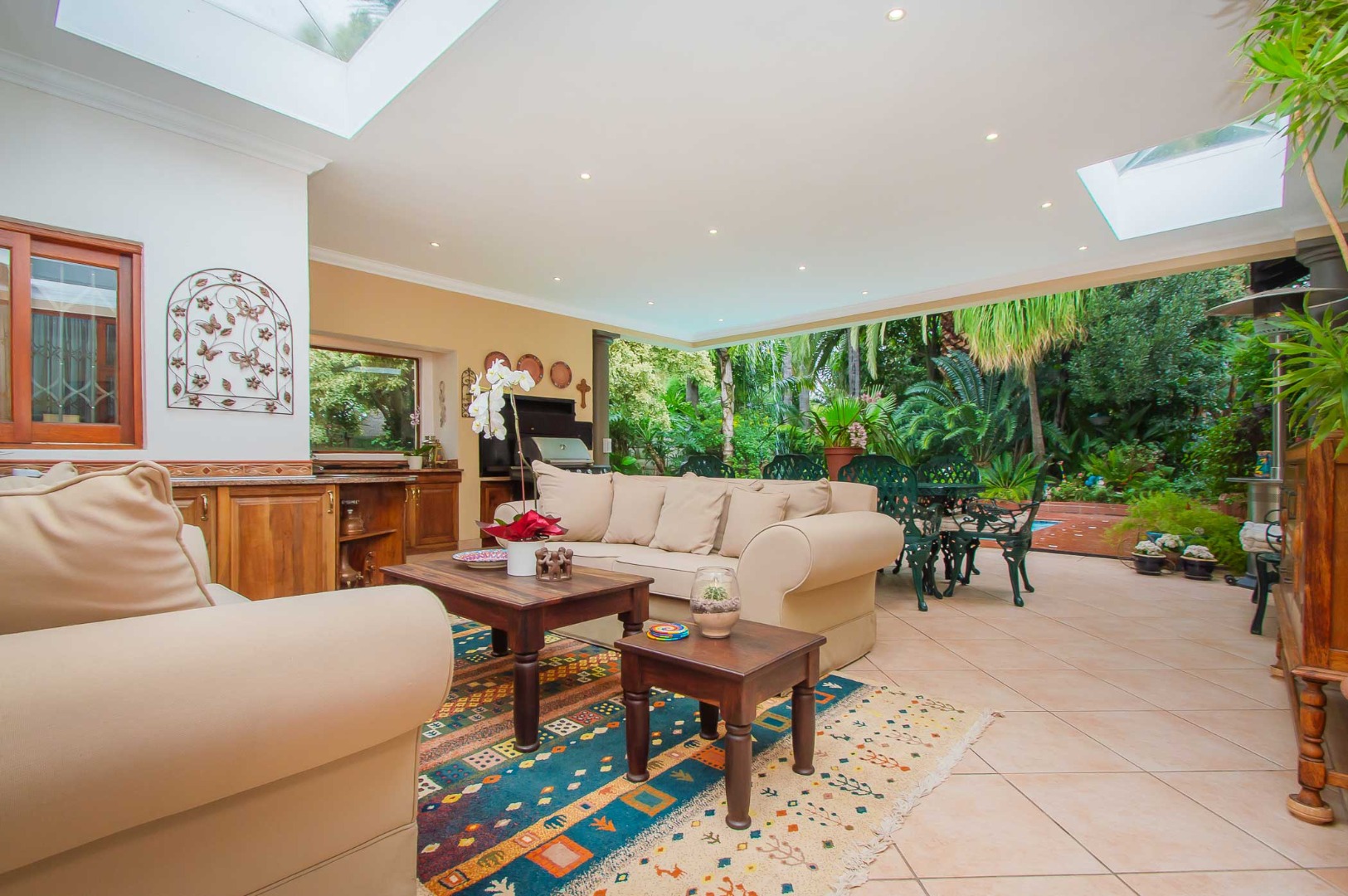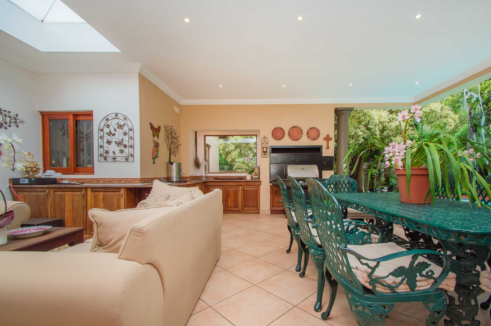 The heart of this home features a large lounge and dining room, perfect for family gatherings. For more informal moments, a separate family room comes complete with a built-in bar, ideal for entertaining guests. These inviting living spaces seamlessly open up to a covered patio, which boasts a built-in braai and a spacious area for both dining and relaxing.