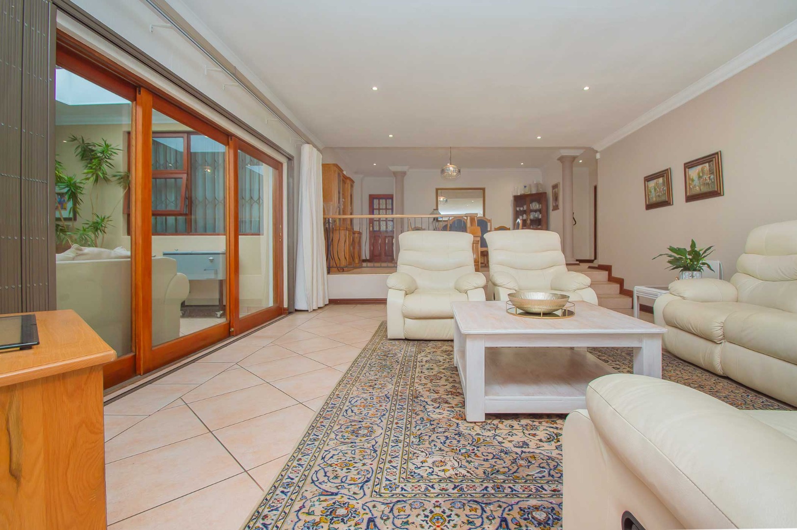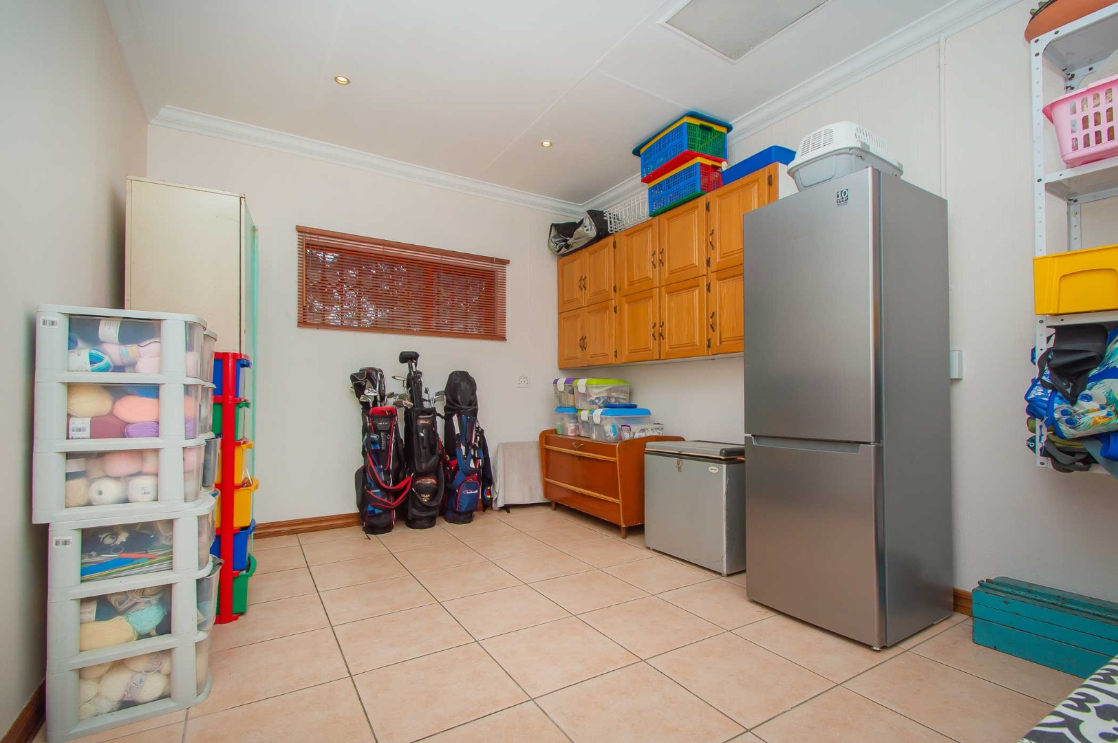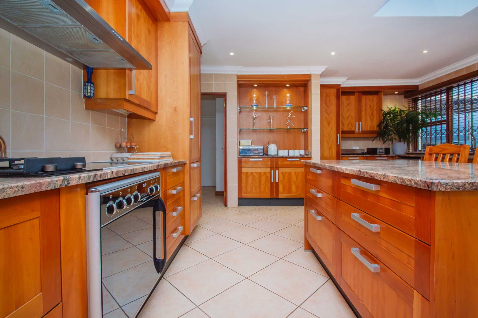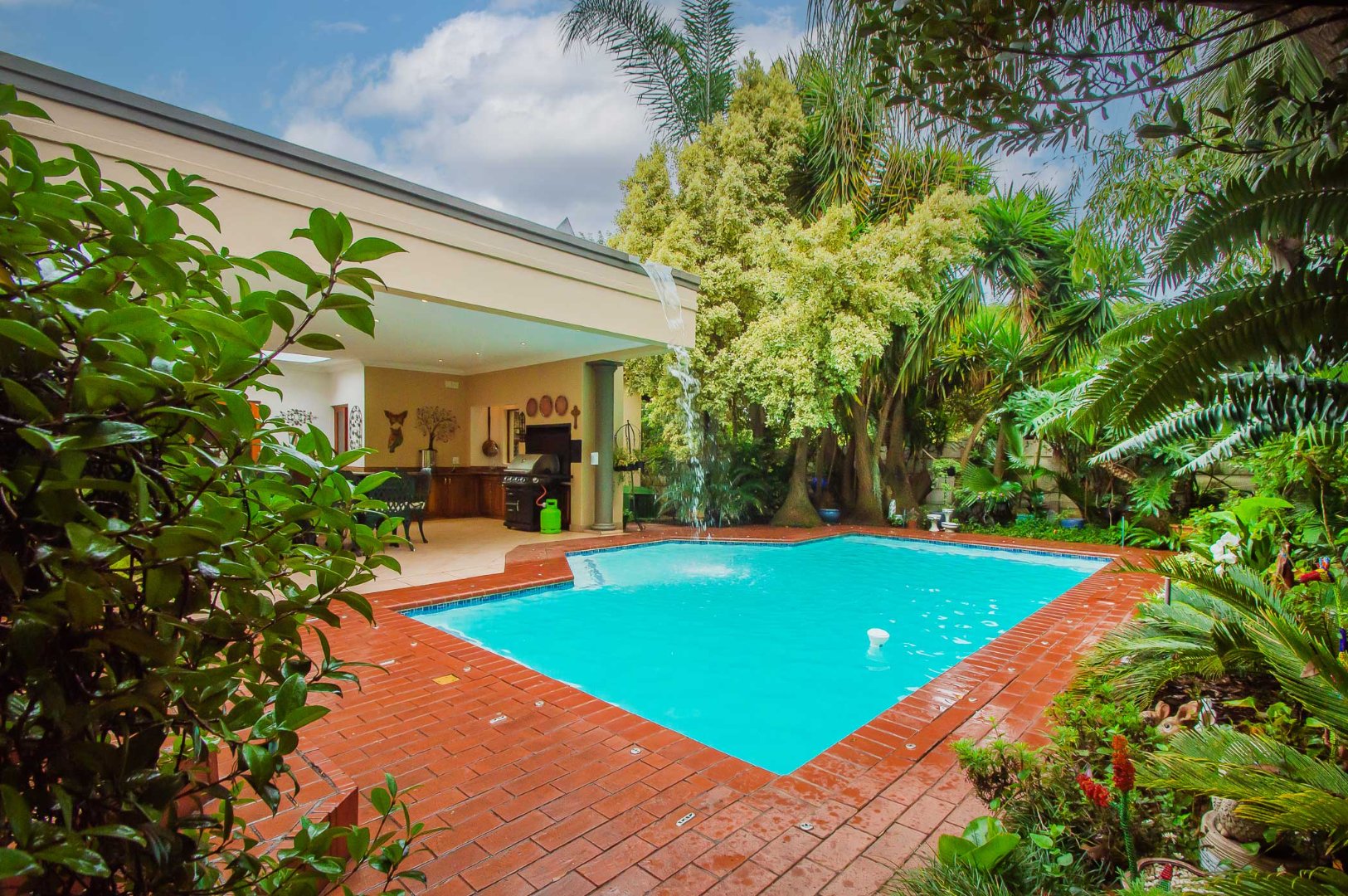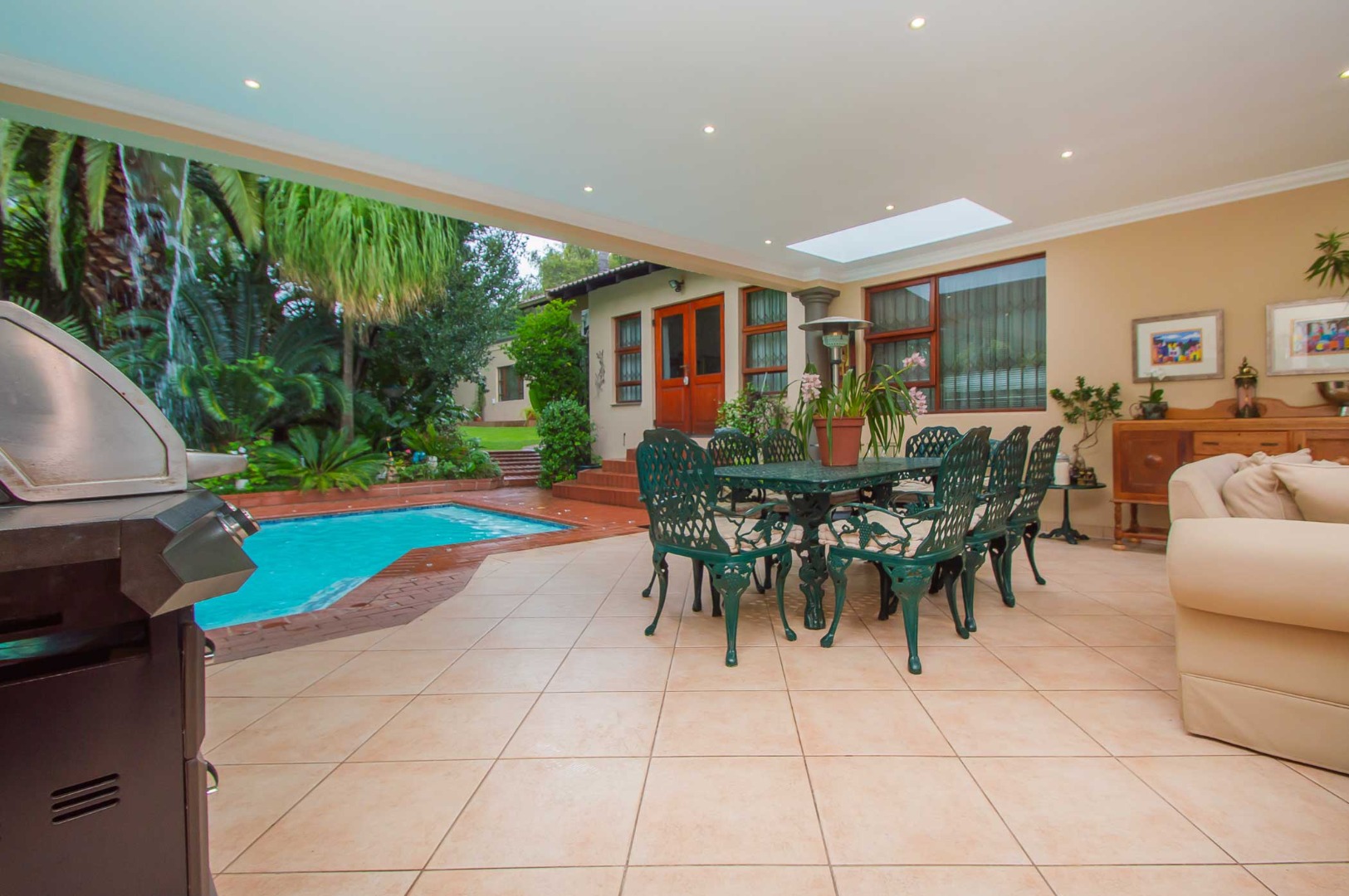 The heart of this home features a large lounge and dining room, perfect for family gatherings. For more informal moments, a separate family room comes complete with a built-in bar, ideal for entertaining guests. These inviting living spaces seamlessly open up to a covered patio, which boasts a built-in braai and a spacious area for both dining and relaxing.