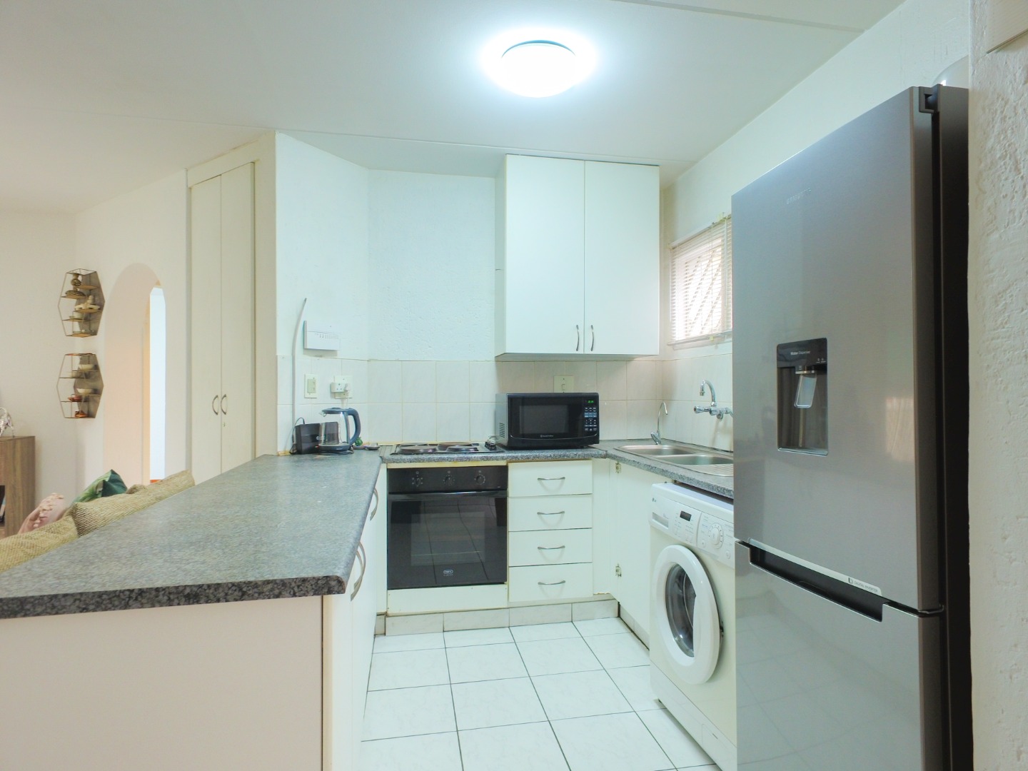 The compact kitchen features ample cupboard space, generous counter tops, a hob and under-counter oven, a double sink, and space for one under-counter appliance and a single-door fridge.