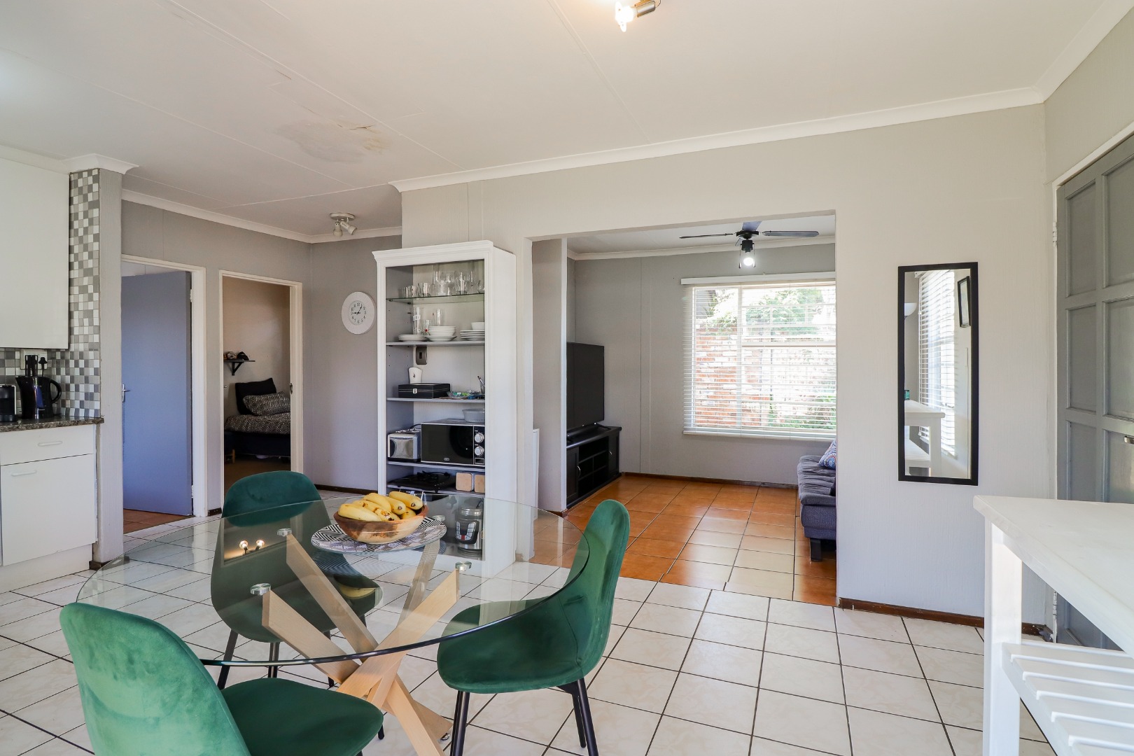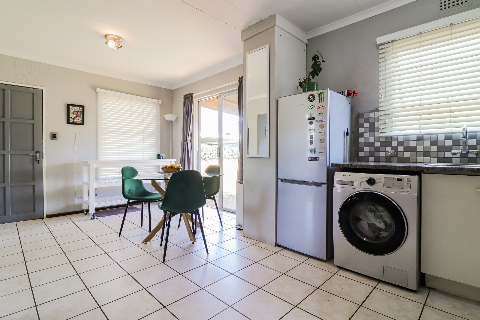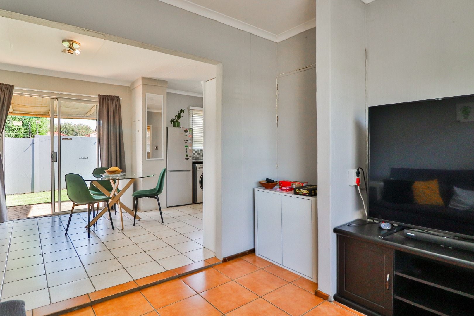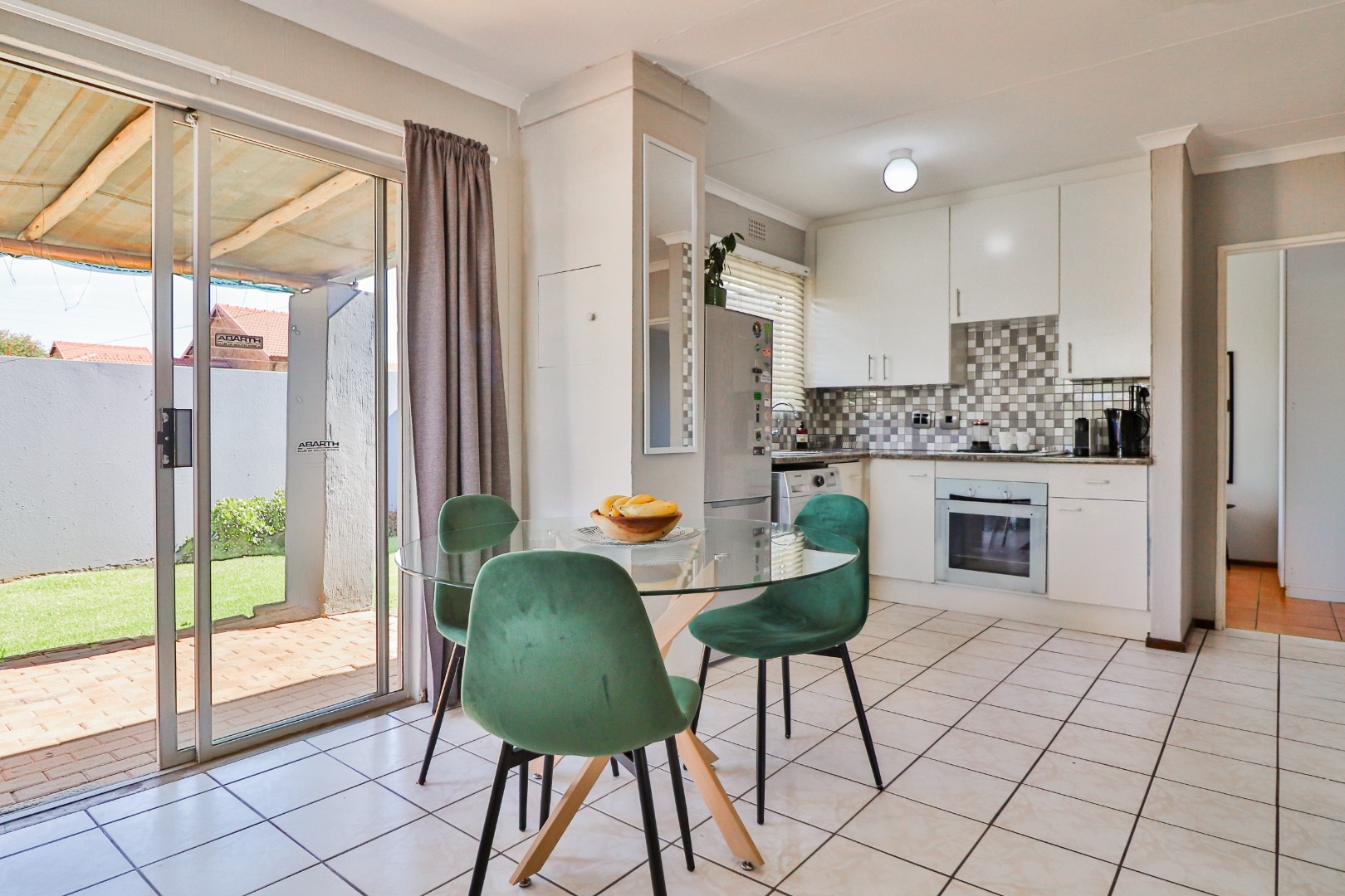 Step inside to a bright open-plan living area with a lounge and dining space that opens through sliding doors to a covered patio and private garden — perfect for relaxing or entertaining.