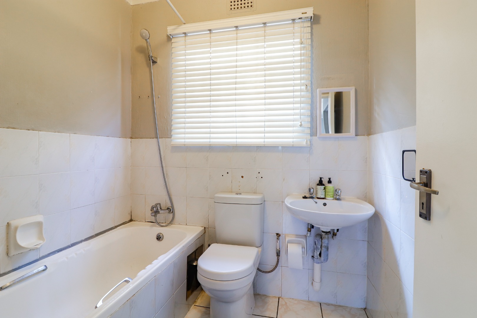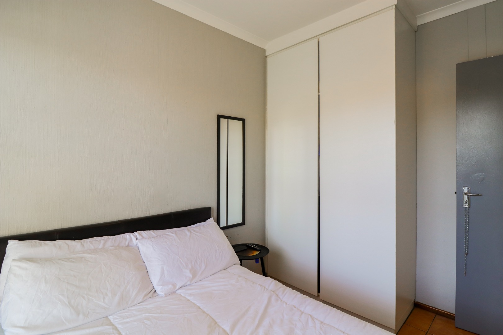Two spacious bedrooms with built-in cupboards, plus a neat bathroom with bath, basin, toilet, and overhead shower.