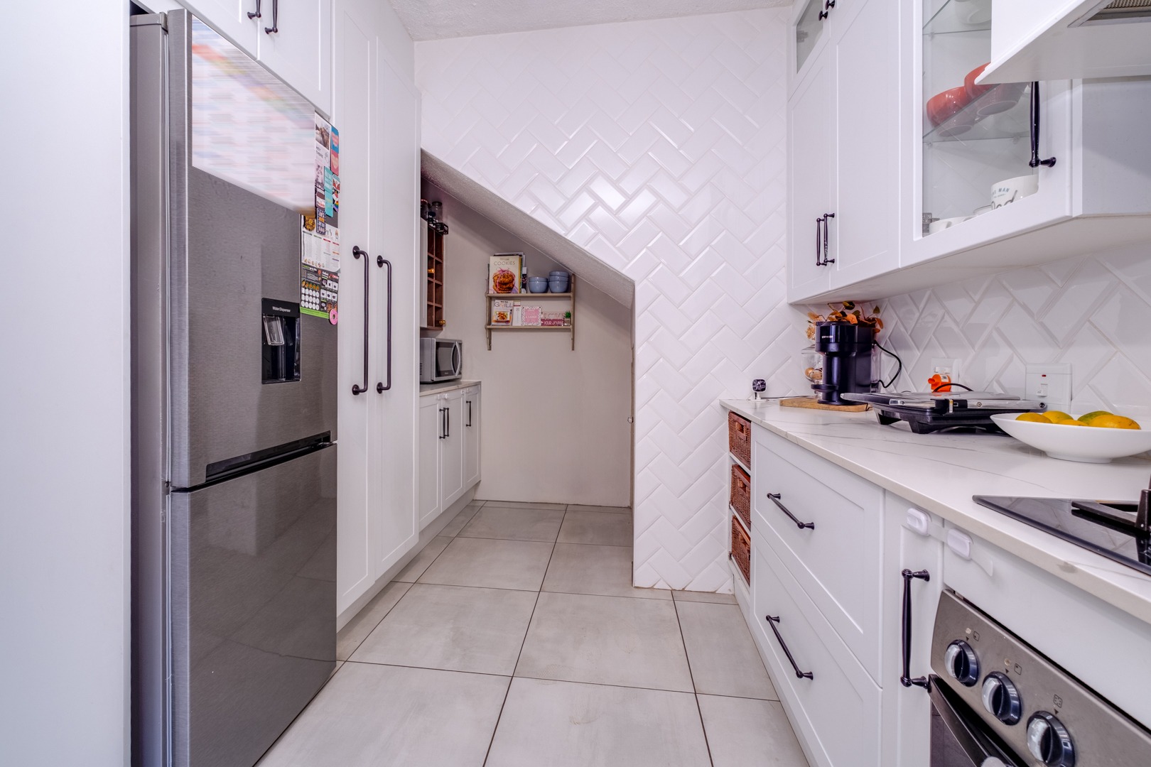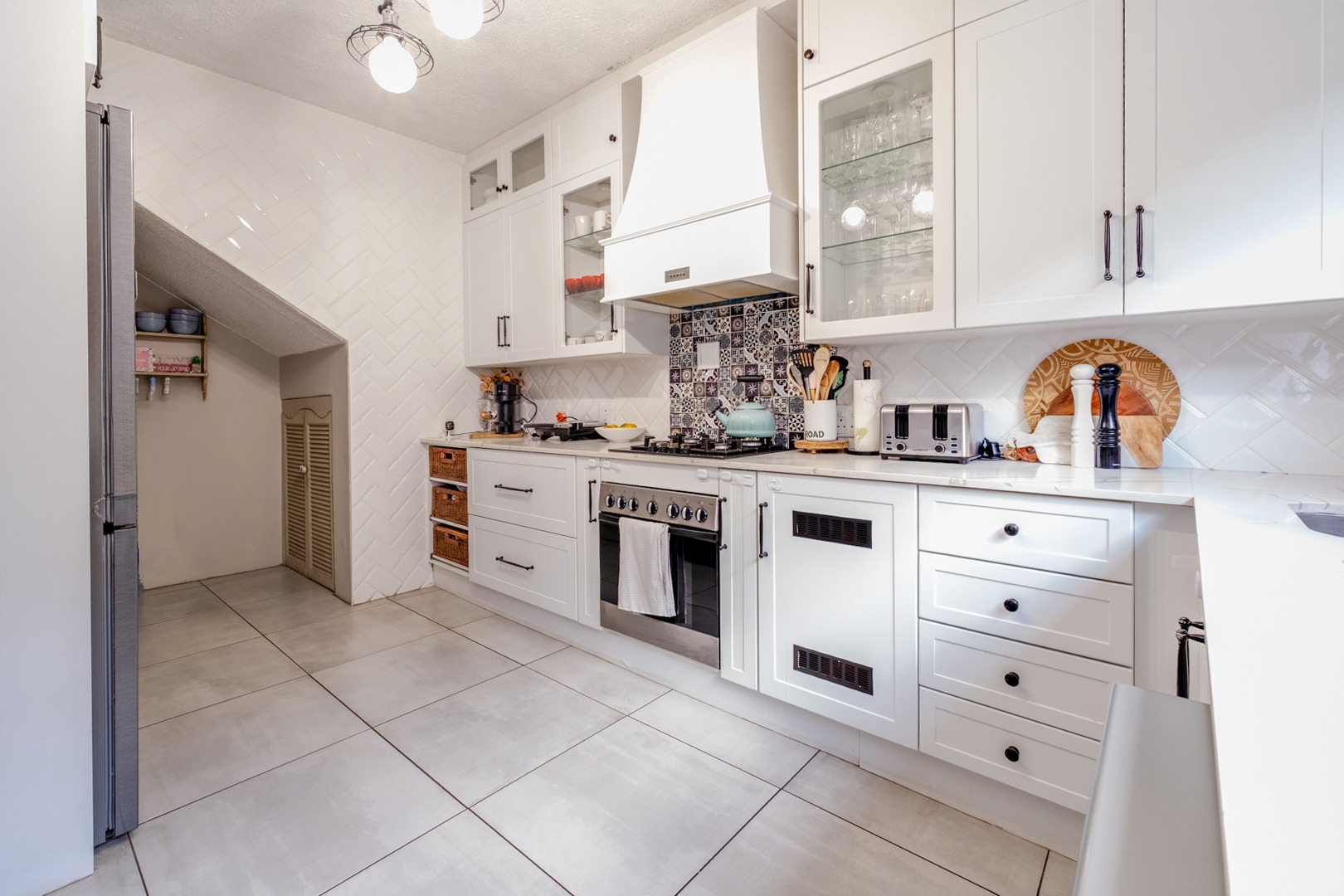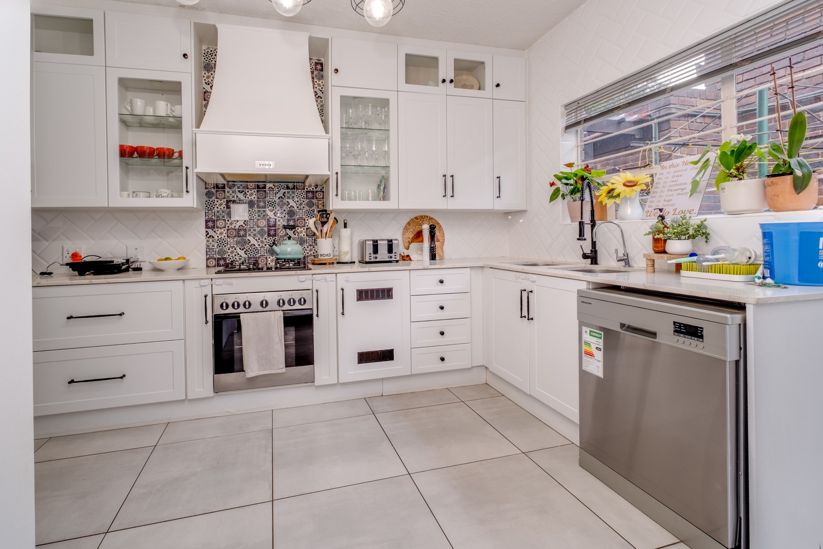 The ultra-modern kitchen is a standout feature, boasting sleek Caesarstone counter tops, ample built-in cupboards, and a gas hob—perfect for home cooks and entertainers alike.