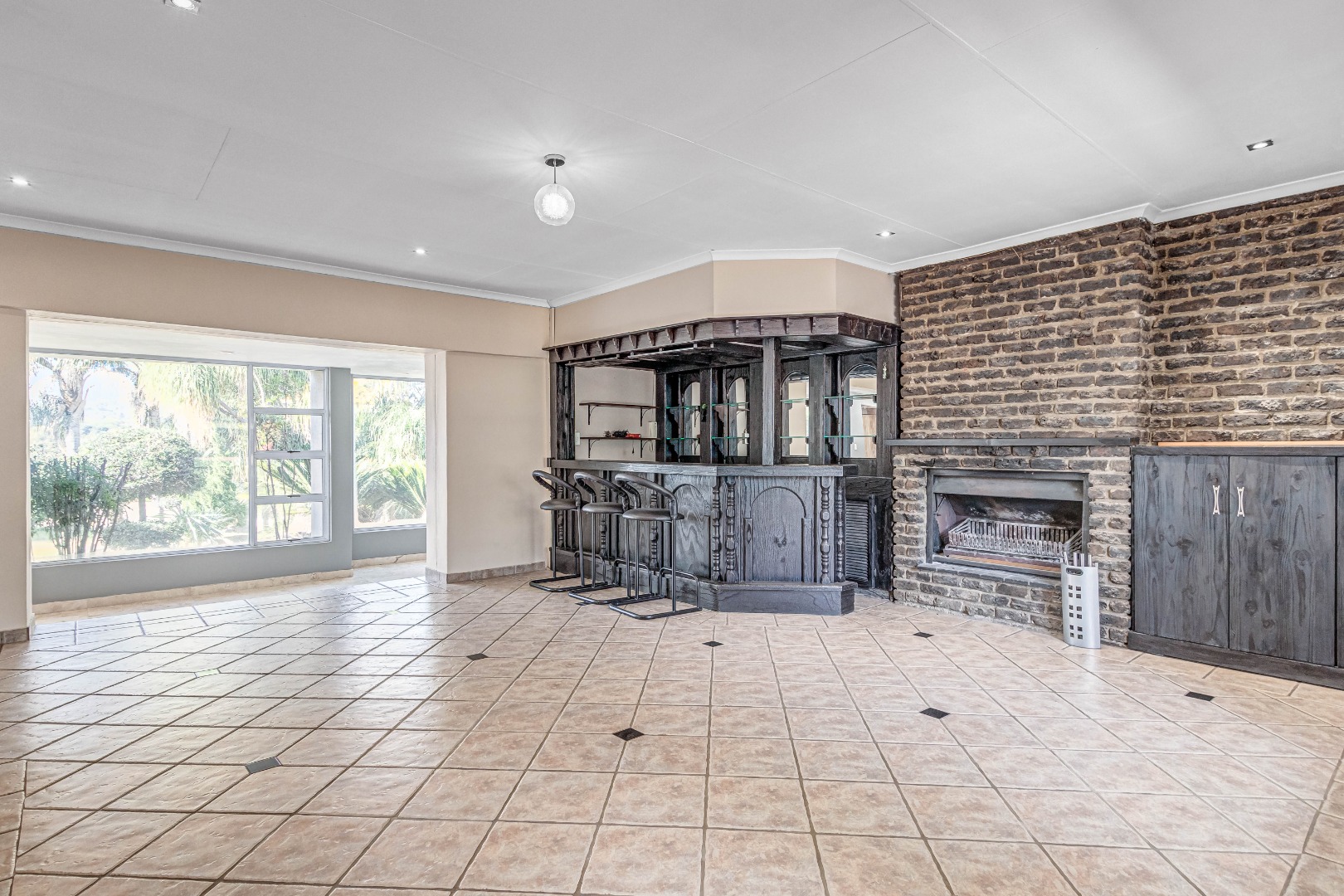 • Indoor Bar – An elegant, classic pub-style bar flows into a cozy entertainment area with fireplace and brick finishes.