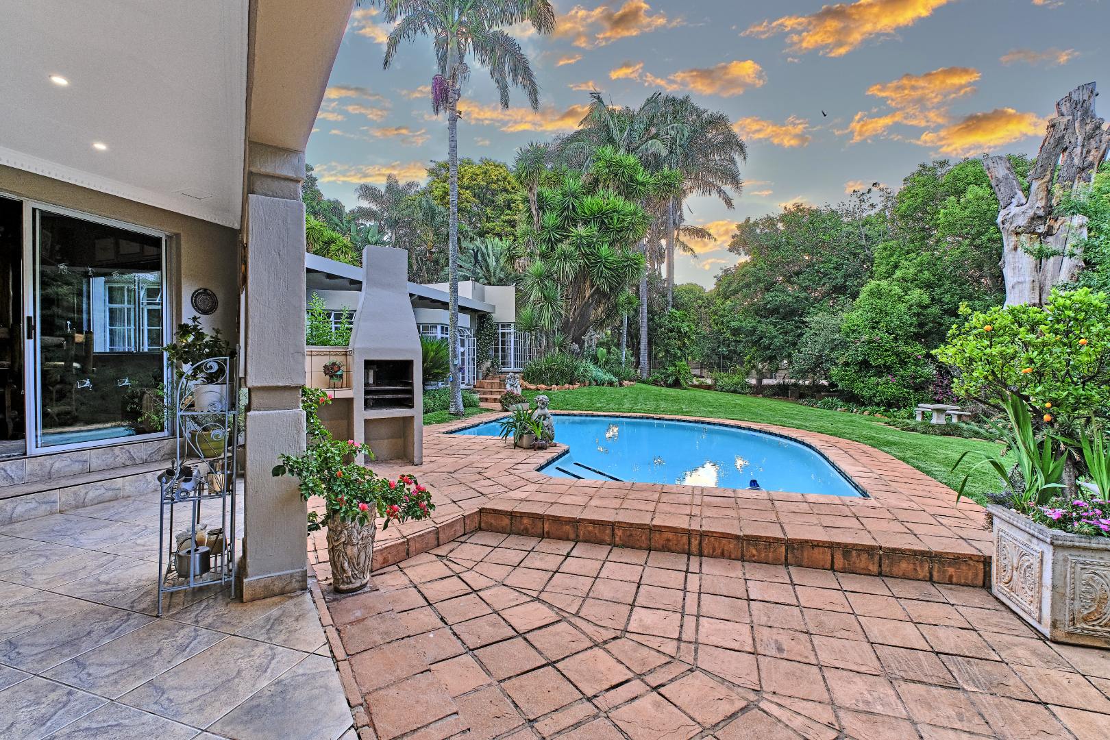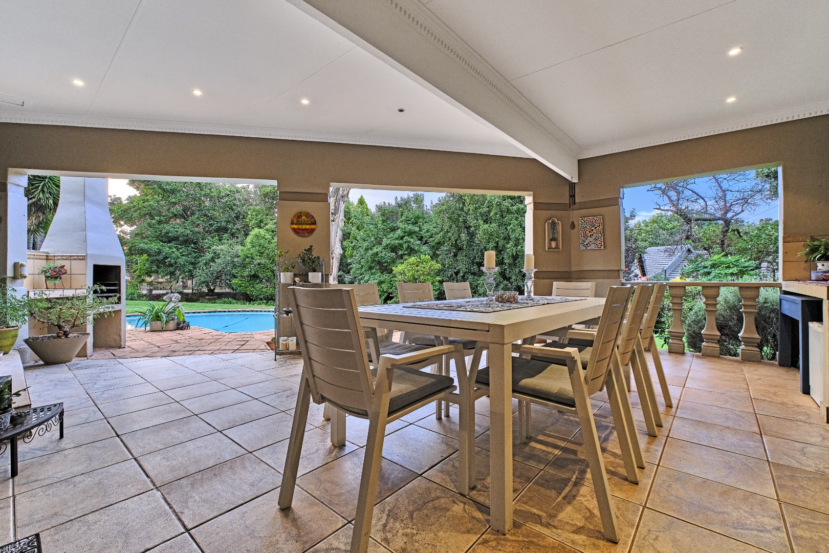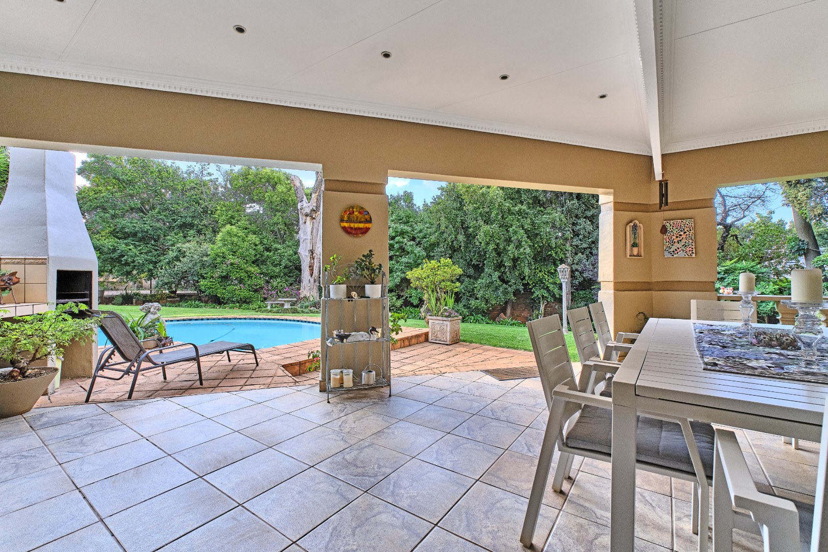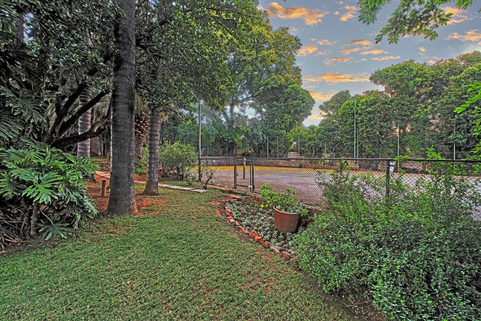 The outdoor amenities are a true highlight, transforming the property into a private resort-like sanctuary. A sparkling swimming pool, surrounded by a manicured lawn and lush garden, invites relaxation. The expansive covered patio, complete with a built-in braai, is perfect for al fresco dining and entertaining guests year-round. For the active family, a private tennis court offers endless recreational opportunities. The property benefits from an irrigation system and a borehole, ensuring the garden remains vibrant. Parking is abundant with four garages and eight additional parking spaces. Pets are welcome, making this an ideal family residence.