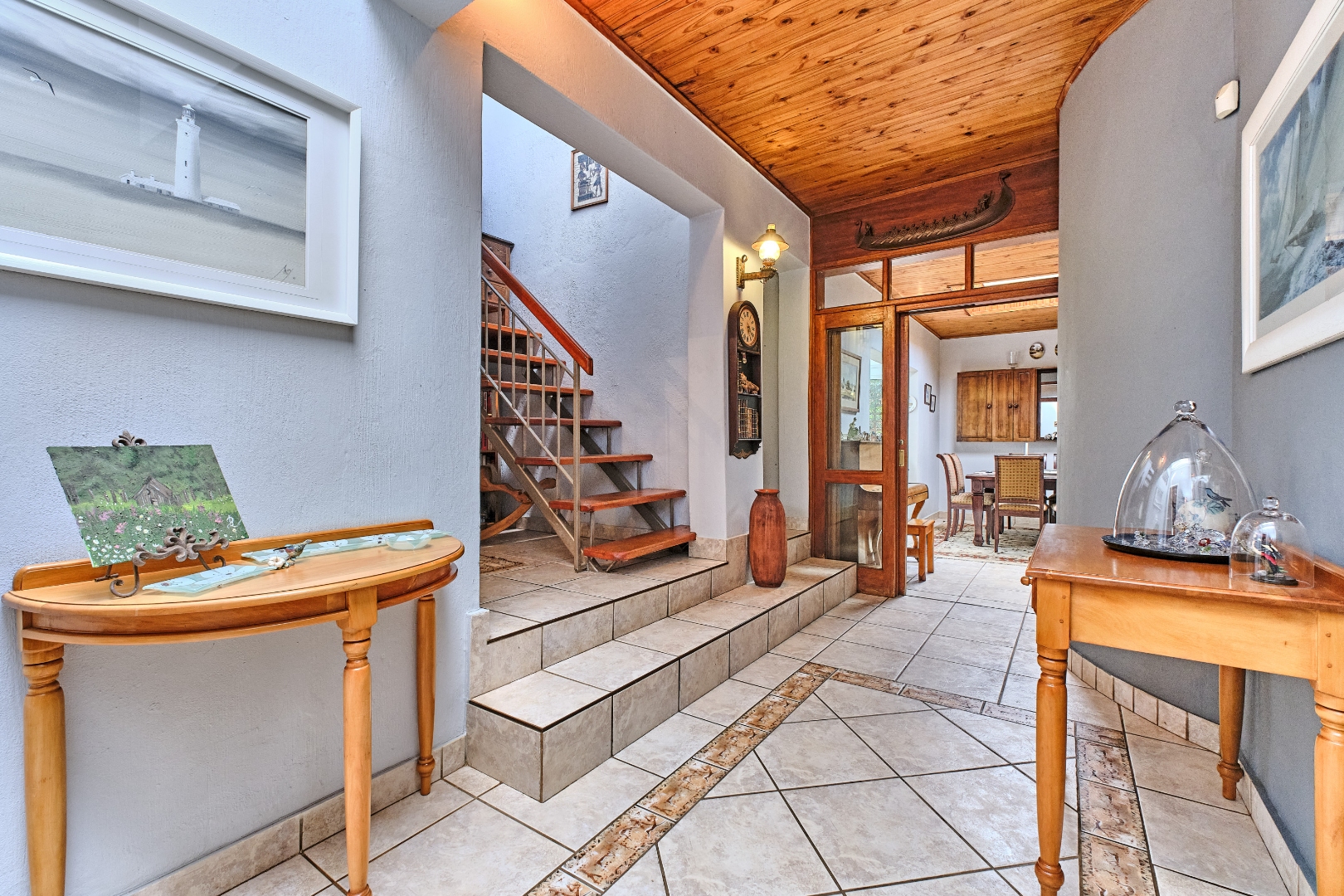 Step inside to discover a thoughtfully designed interior boasting five spacious bedrooms and four and a half bathrooms, including main en-suite and a convenient guest toilet. The home offers an impressive array of living spaces, with two lounges and a dining room, ensuring ample room for relaxation and entertaining. Unique architectural elements such as vaulted wooden ceilings and inviting fireplace add character and warmth. The open-plan design between the dining room and lounge seamlessly connects key areas, while a dedicated small study provides a quiet workspace. The property also features a well-appointed kitchen, offering extensive wooden cabinetry, ample counter space, and modern amenities, catering to diverse culinary needs.