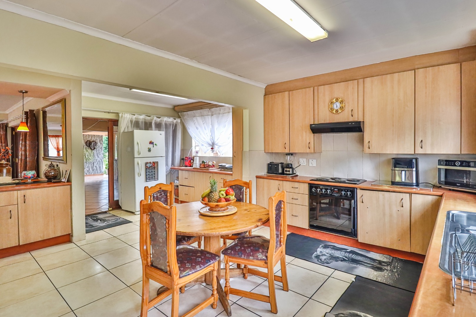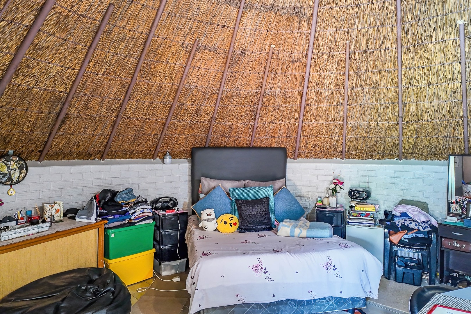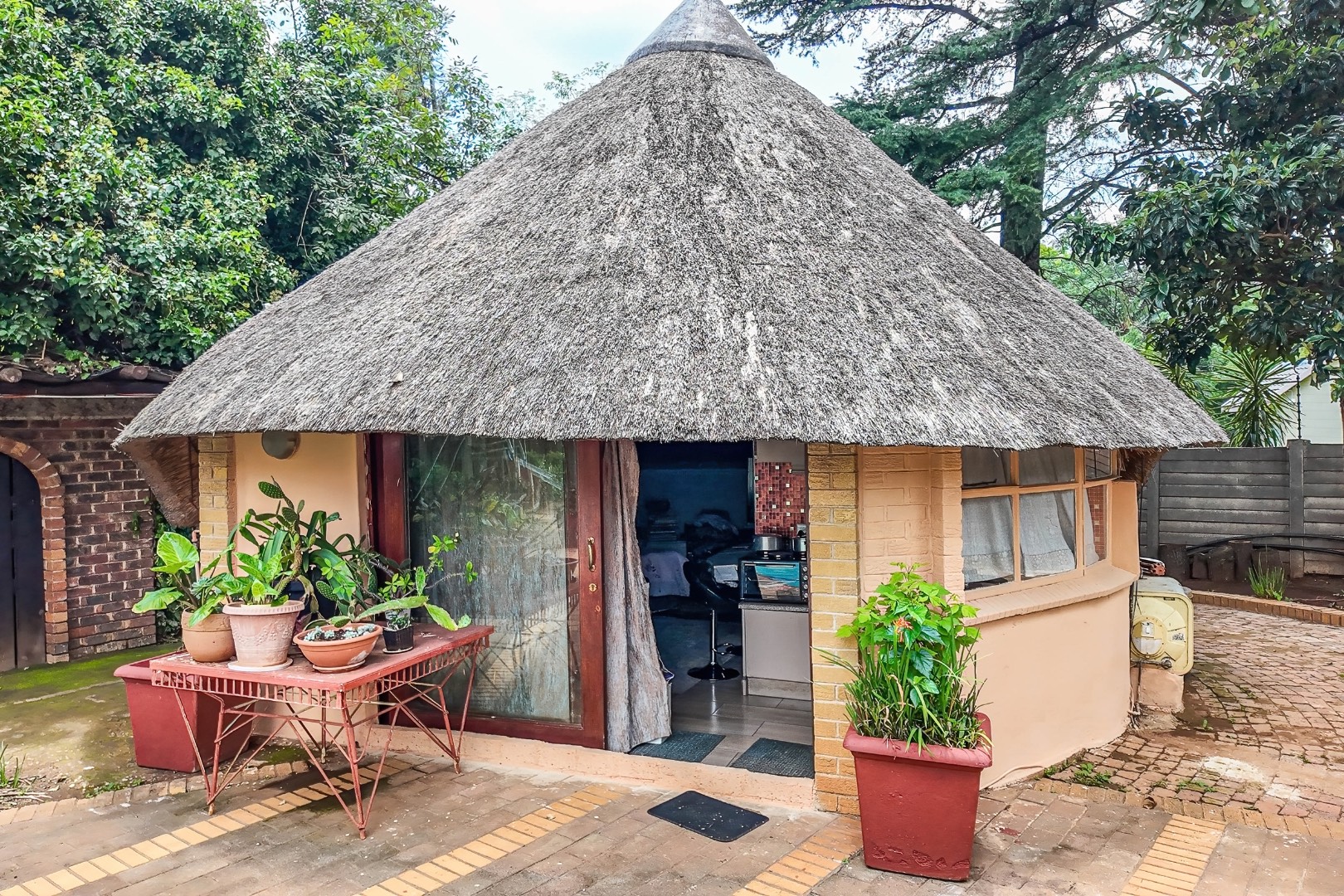 Accommodation includes seven well-proportioned bedrooms and four bathrooms, with two en-suite bedrooms and a guest toilet for added convenience. A separate flatlet, along with domestic rooms and outside toilets, further enhances the home’s adaptability for extended family, guests, or staff. Distinctive thatched-roof features, including a charming rondavel, add character and architectural interest to the property