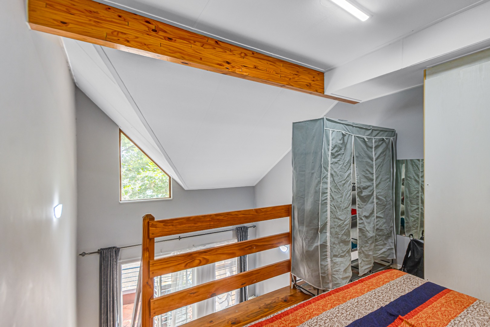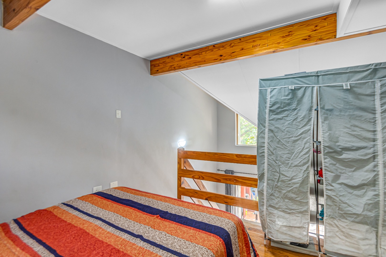 Loft-style bedroom with ample natural light, creating a cosy yet open atmosphere.
