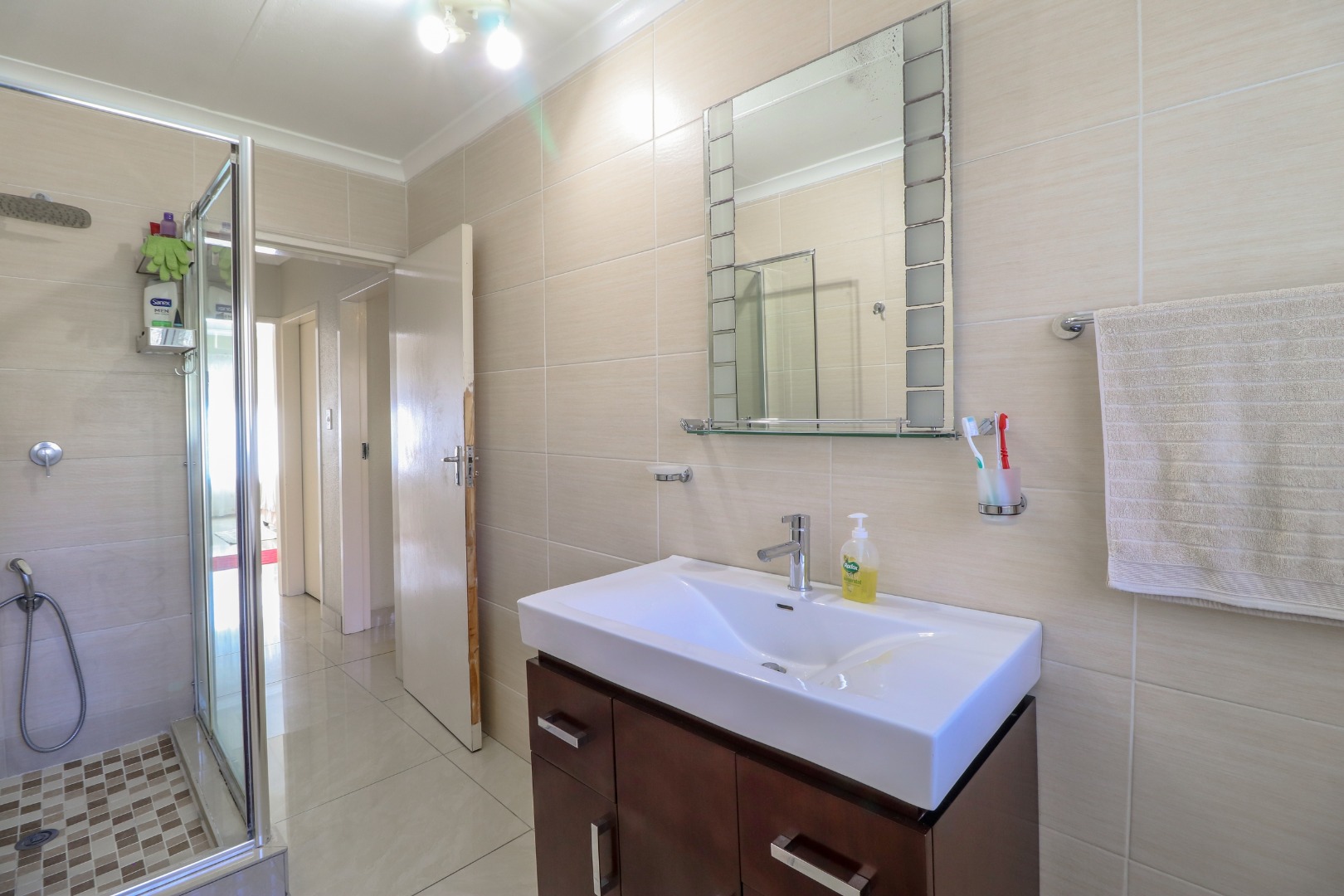 Apartment is fully tiled with trendy porcelain tiles. Brand new bathroom.