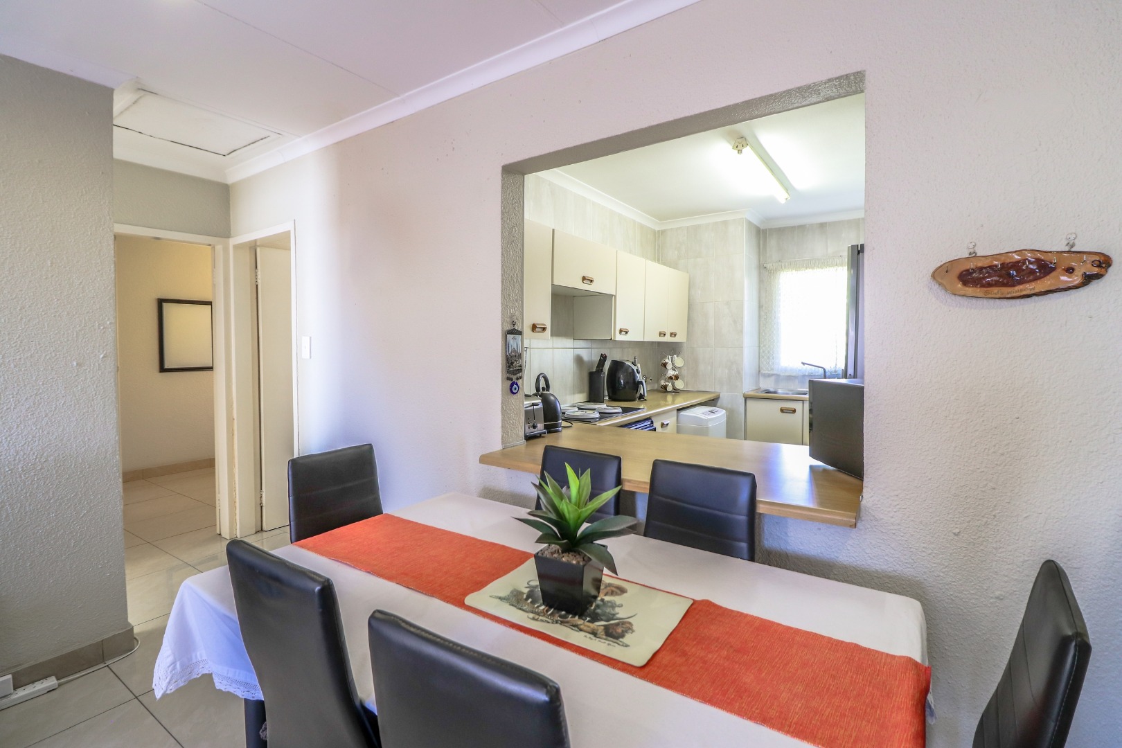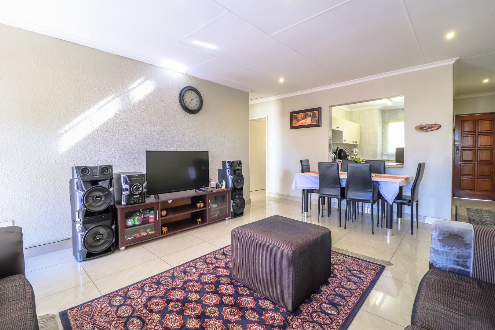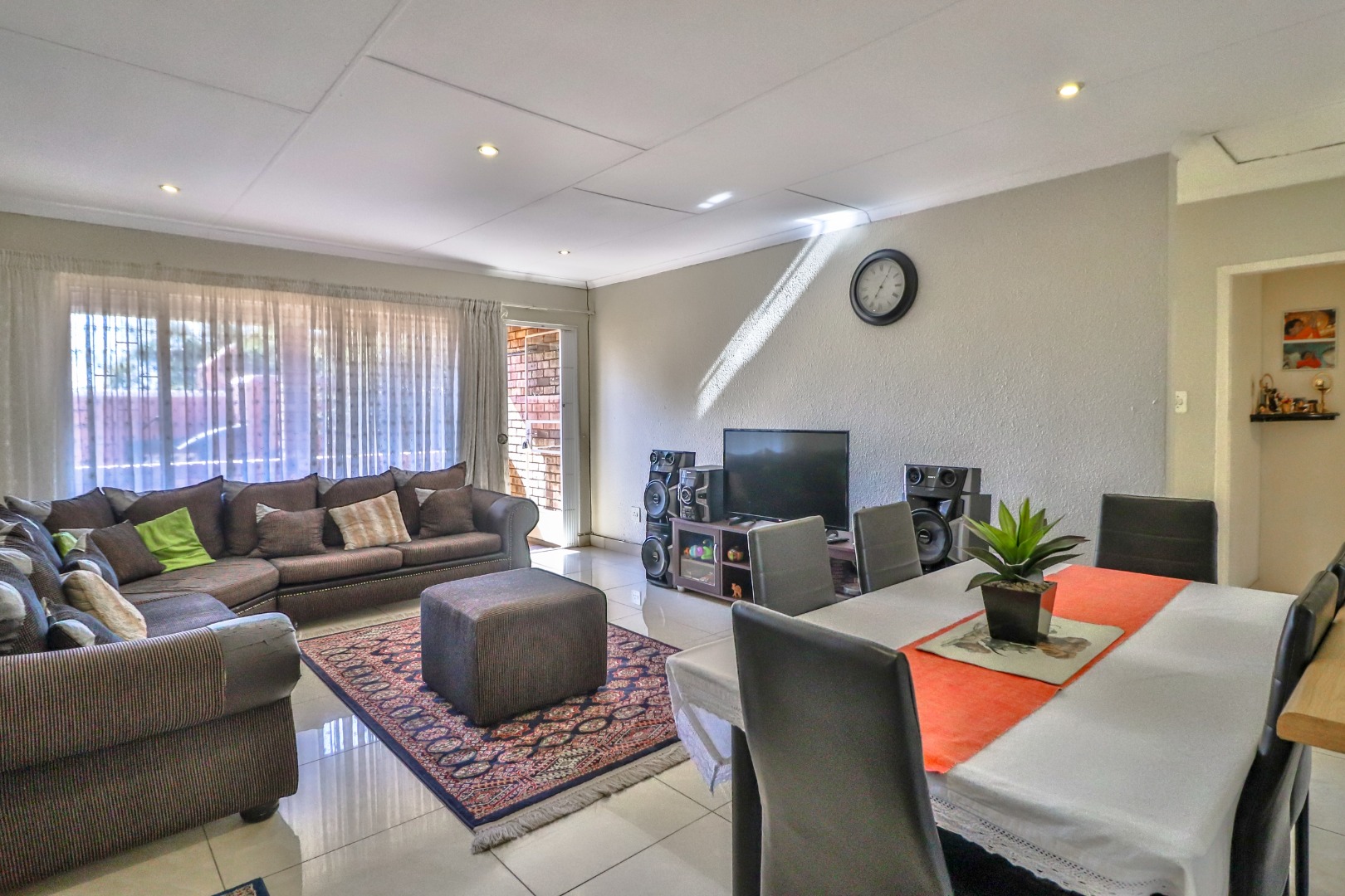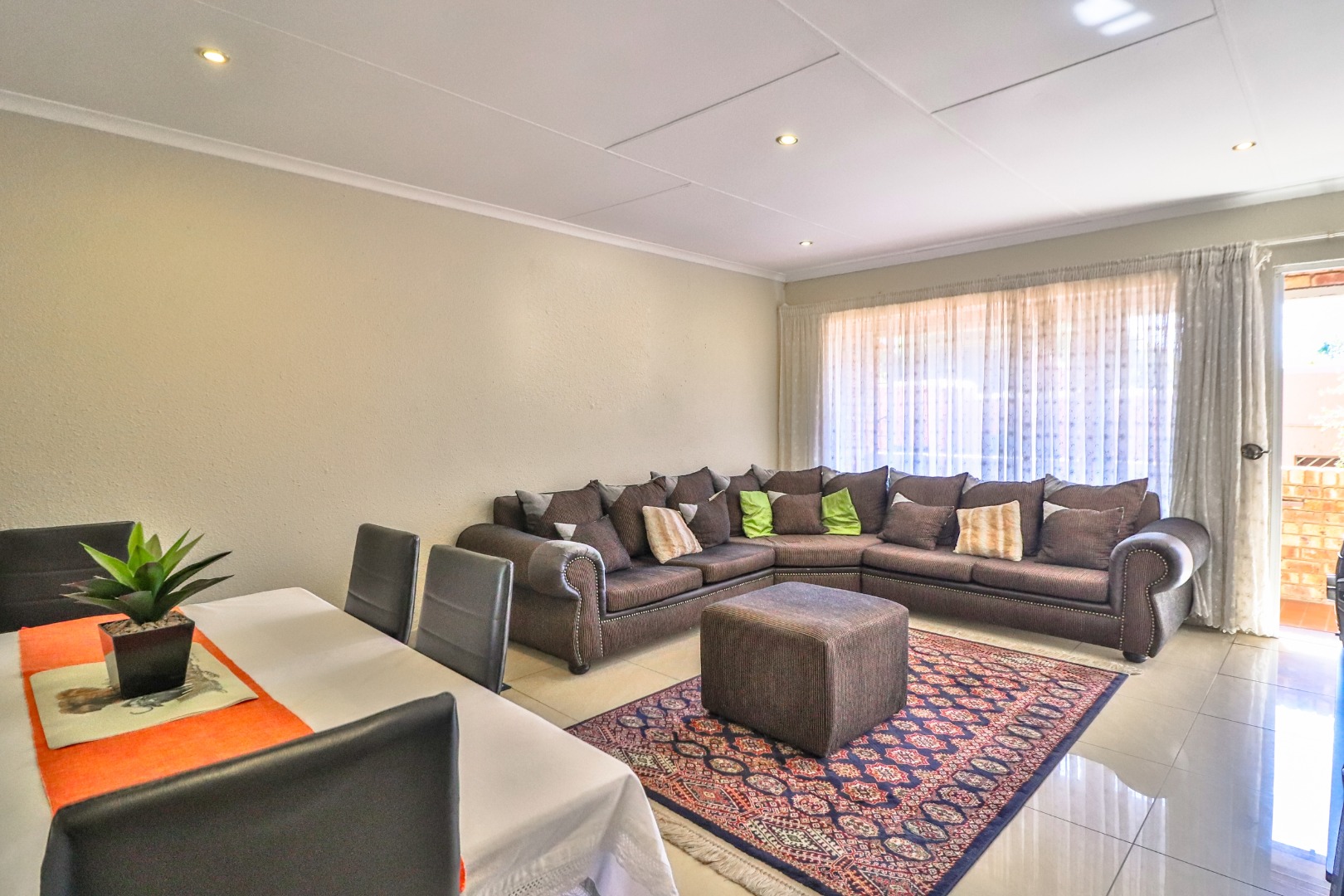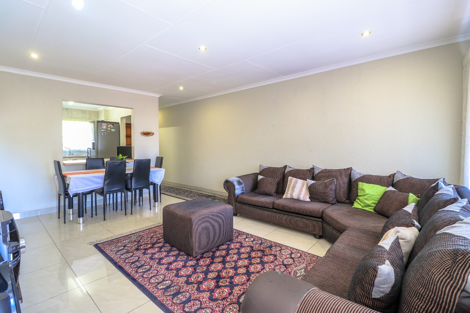 Open plan dining/lounge is big enough to fit in corner couch and 6-seater dining table.