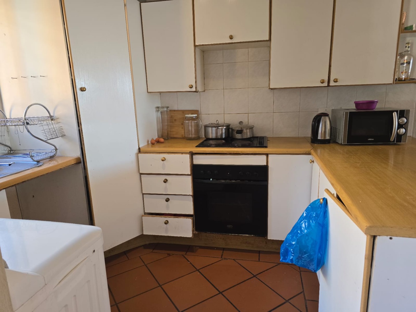 A compact kitchen boasts plenty of cupboard space and under-counter appliance