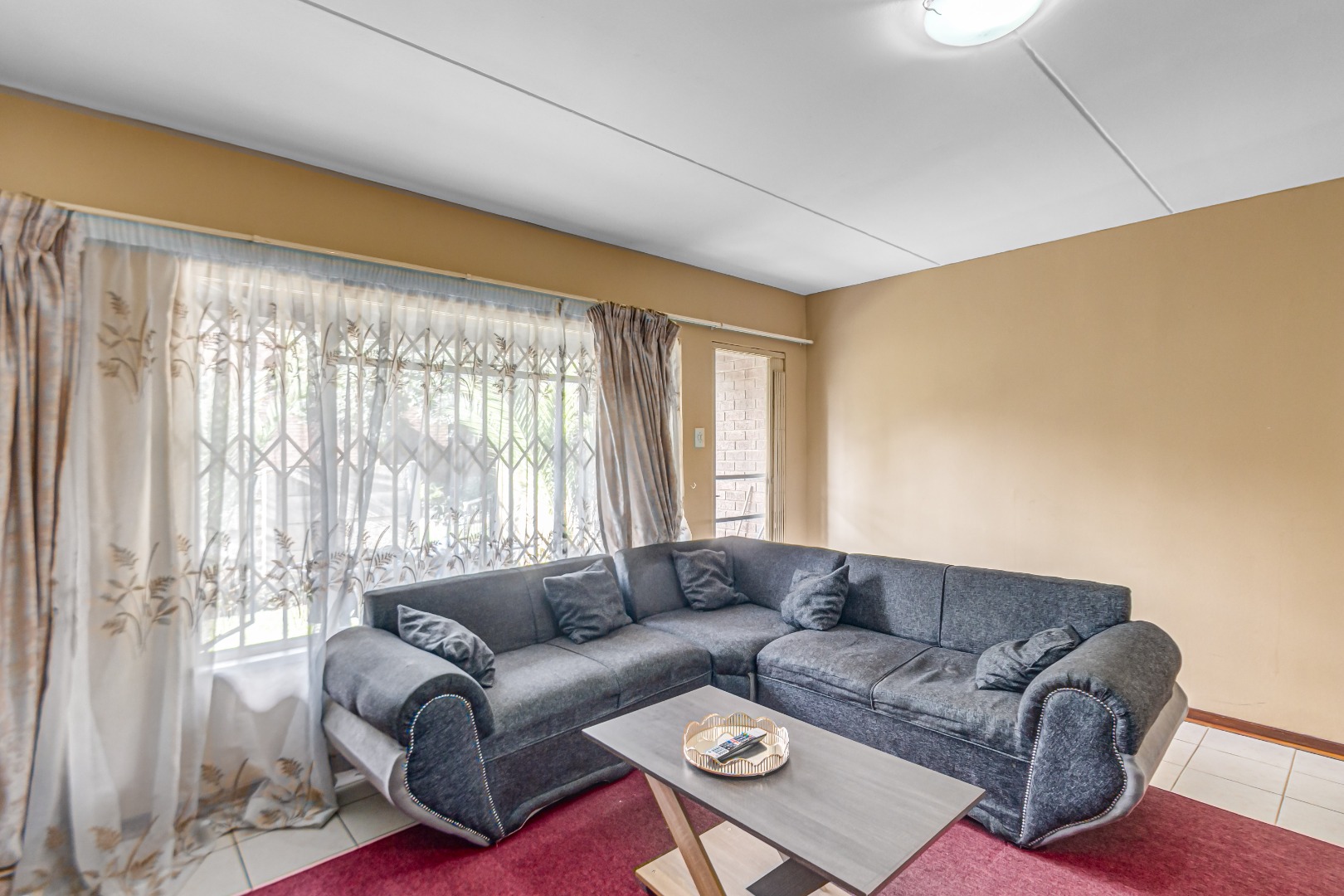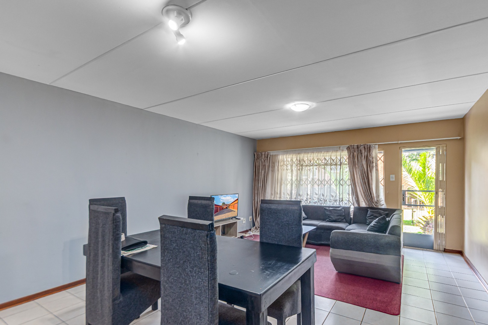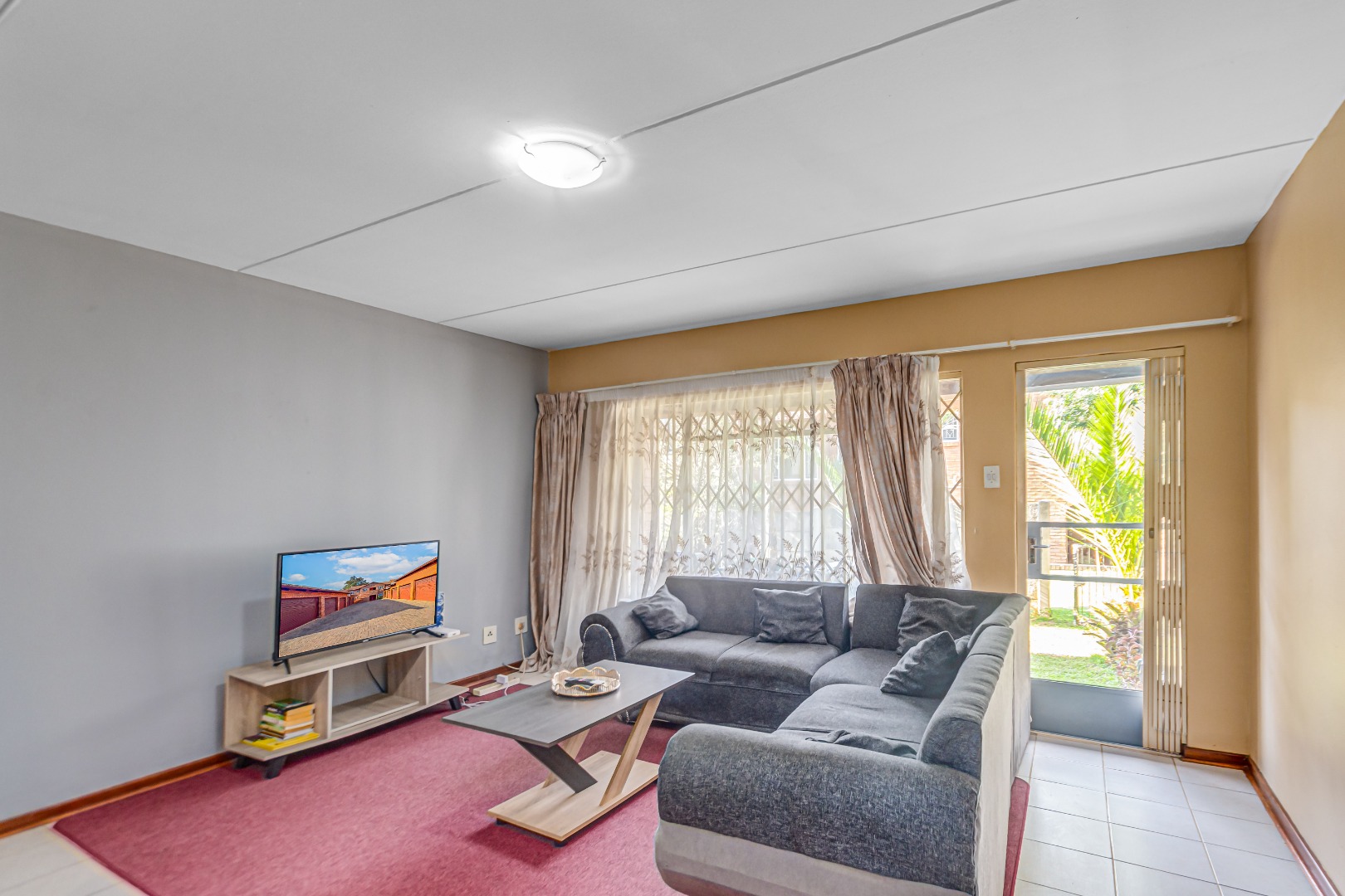 The open-plan lounge and dining area is surprisingly spacious, tiled throughout, and flows seamlessly onto your private patio and garden – the ideal spot for morning coffee or weekend braais. For peace of mind, the lounge doors are fitted with a security gate and burglar bars, ensuring comfort and safety.