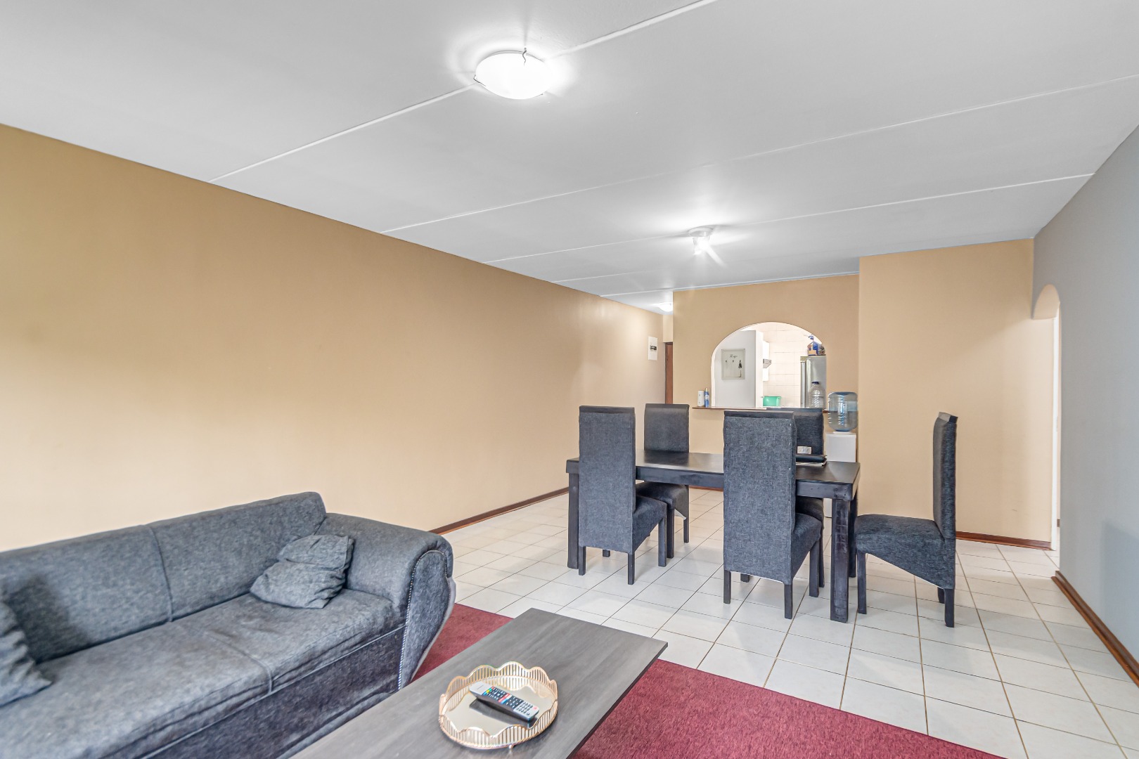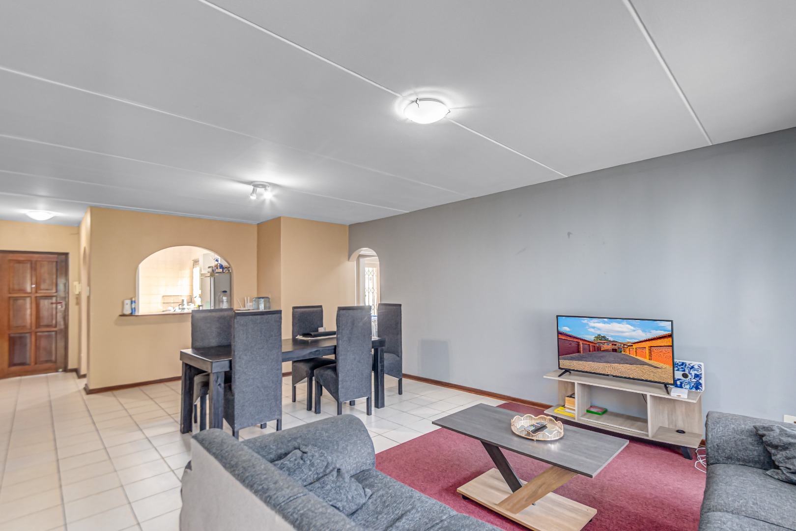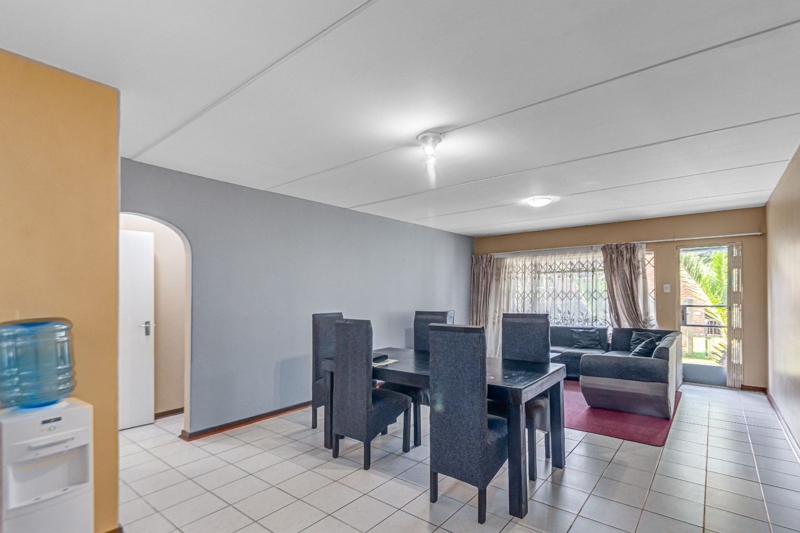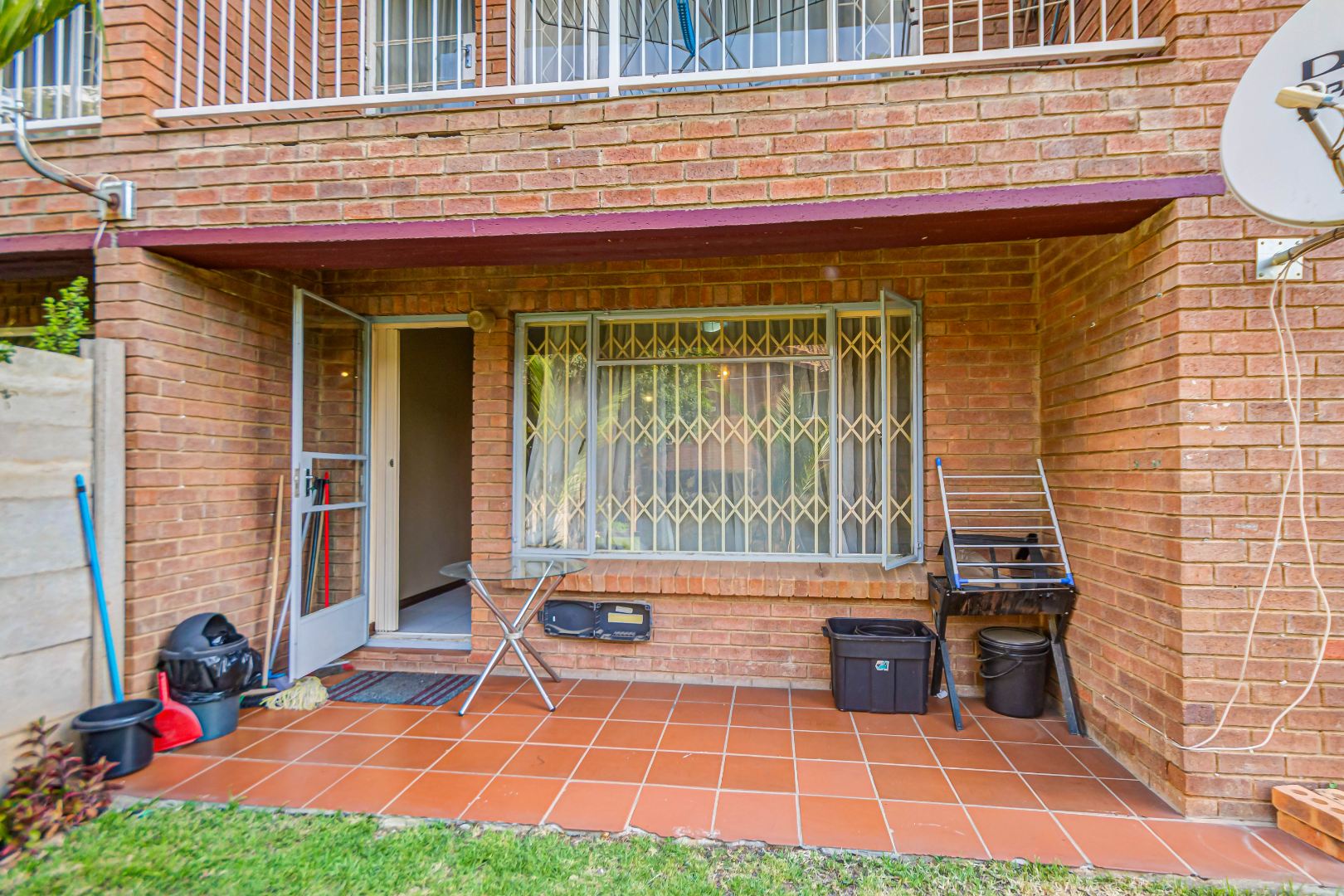 The open-plan lounge and dining area is surprisingly spacious, tiled throughout, and flows seamlessly onto your private patio and garden – the ideal spot for morning coffee or weekend braais. For peace of mind, the lounge doors are fitted with a security gate and burglar bars, ensuring comfort and safety.