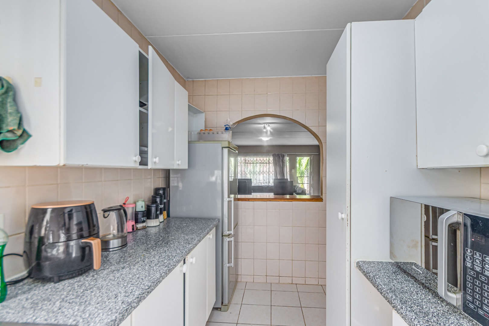 Step into a modern tiled kitchen featuring ample cupboard space, a double basin, electric oven and stove with extractor fan, and space for two appliances. The serving window opens conveniently to the living area, making it easy to entertain while cooking.