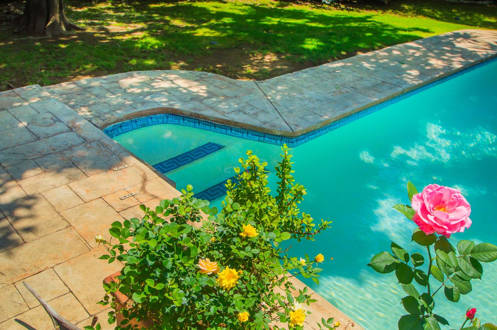 • Covered patio overlooking a sparkling pool and landscaped gardens