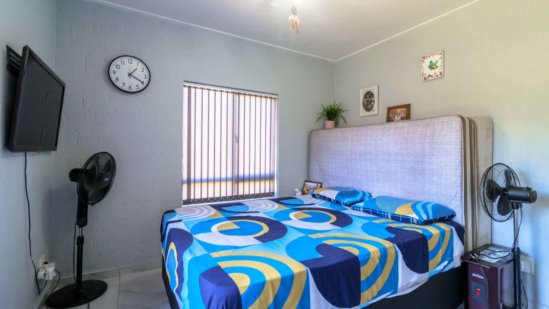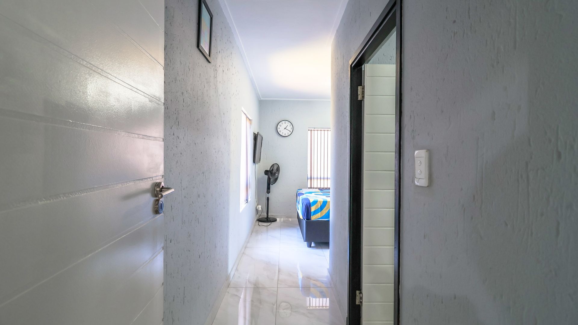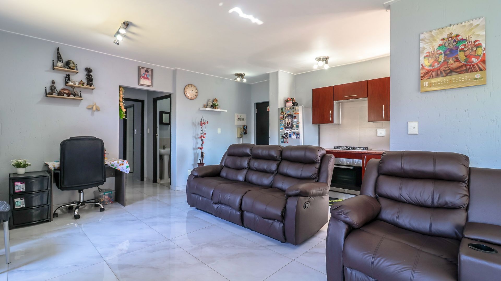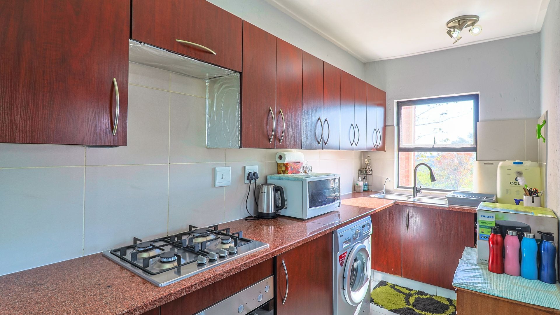 Tiled lounge and dining area , beautiful porcelain tiles with sliding door to private balcony. Computer nook in corner of lounge/work from home area. Open-plan kitchen with space for a fridge, 2 appliances, lots of cupboards, double sink, water purifier, under cover oven and gas hob . Main bedroom, tiled 4 BIC. MES has bath, shower in bath, loo and vanity. 2nd bedroom, tiled, 3 BIC, Bathroom has bath, loo and vanity. Blinds throughout. Mosquito nets on windows. Single carport. 1 open allocated parking. Prepaid electricity. This precinct has its own pool.