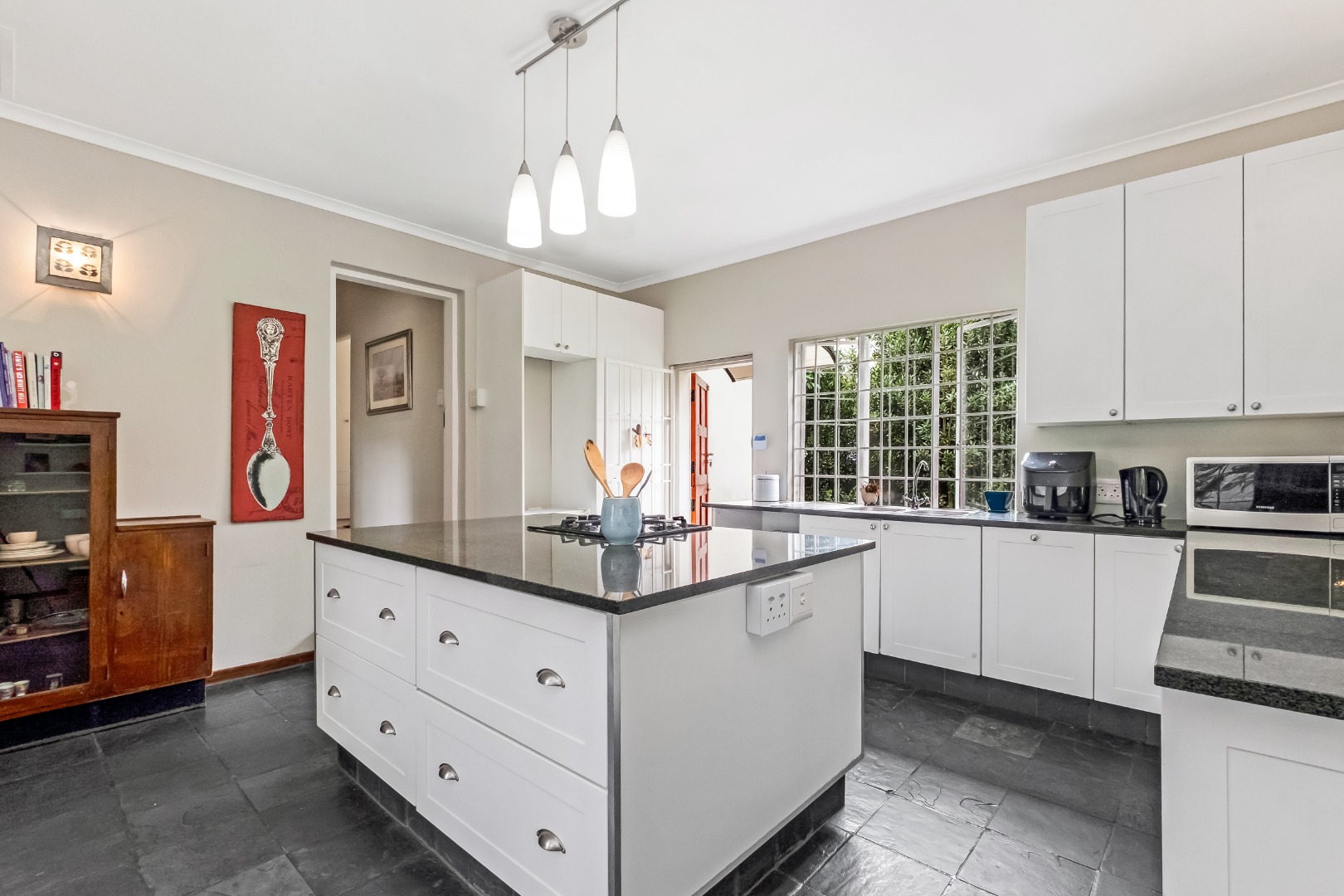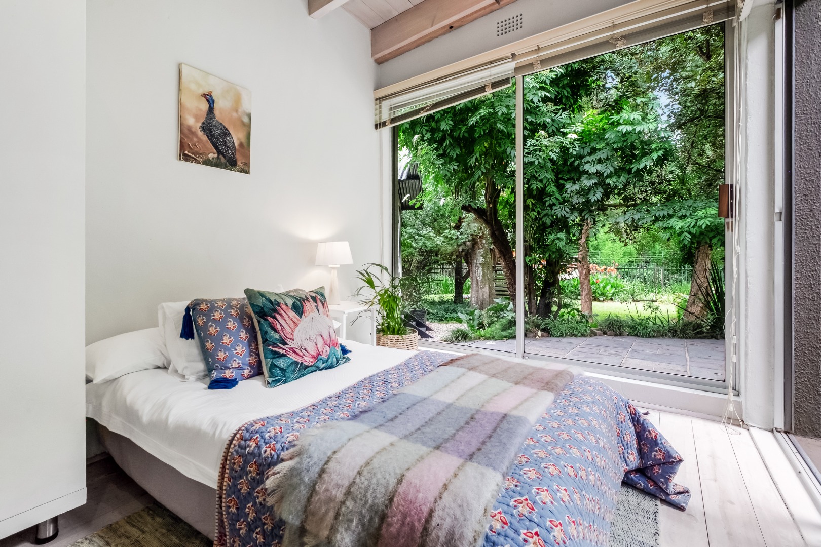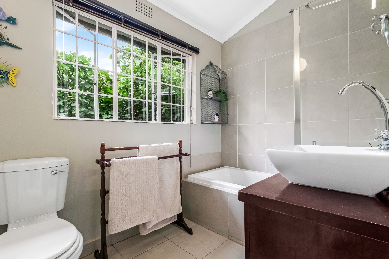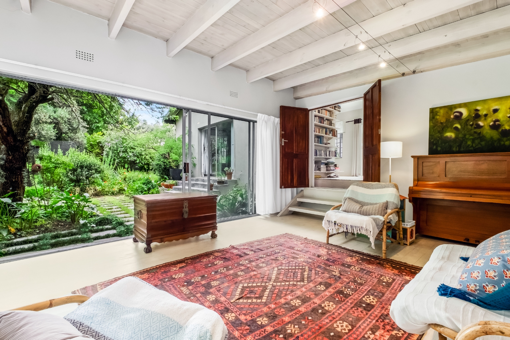 with fireplace opens through sliding doors into the lush indigenous garden. Interleading from here is a dedicated study or play area, also with garden access. Guest Bathroom with Shower.