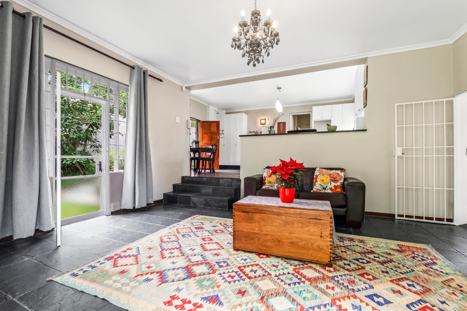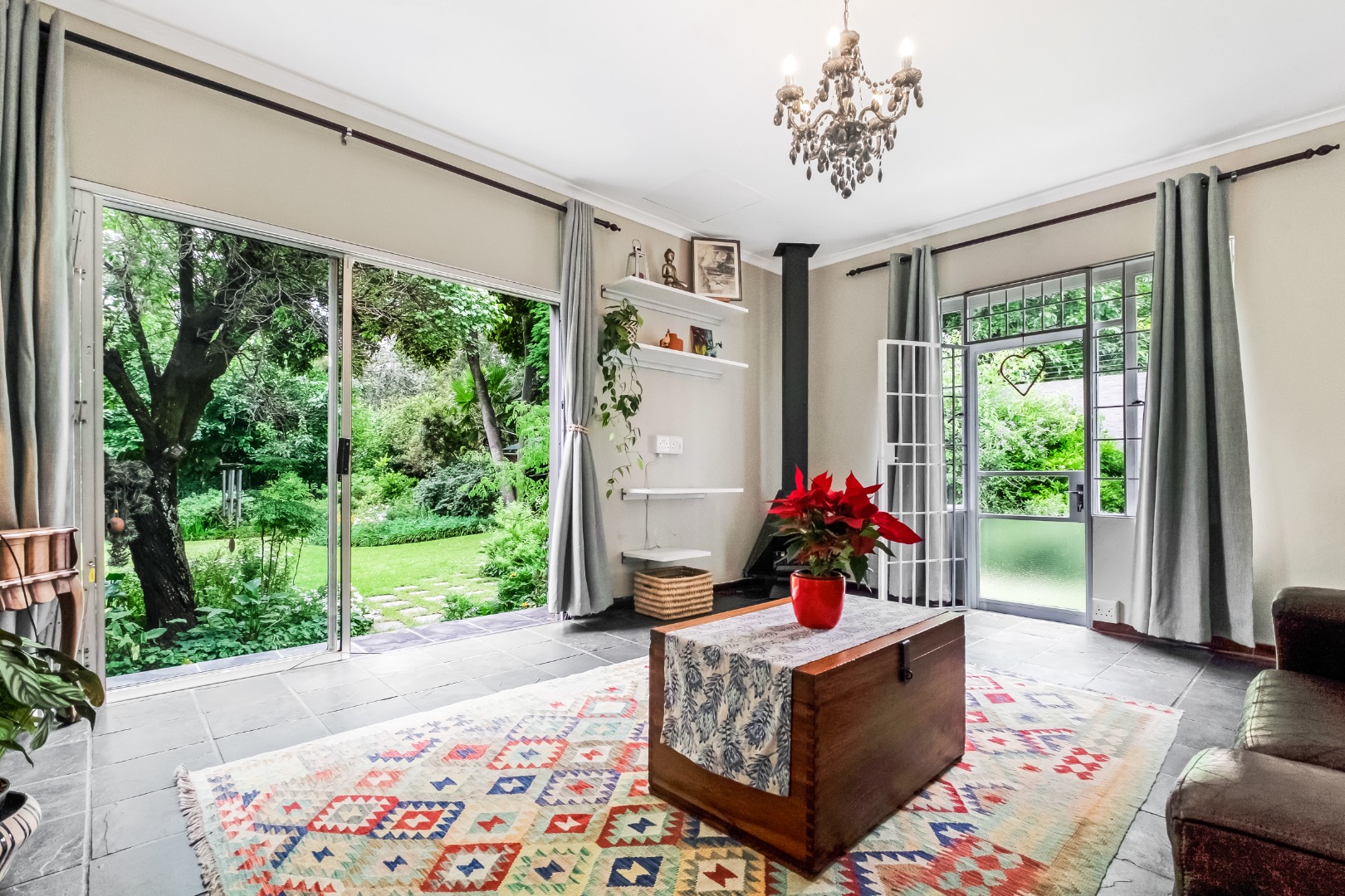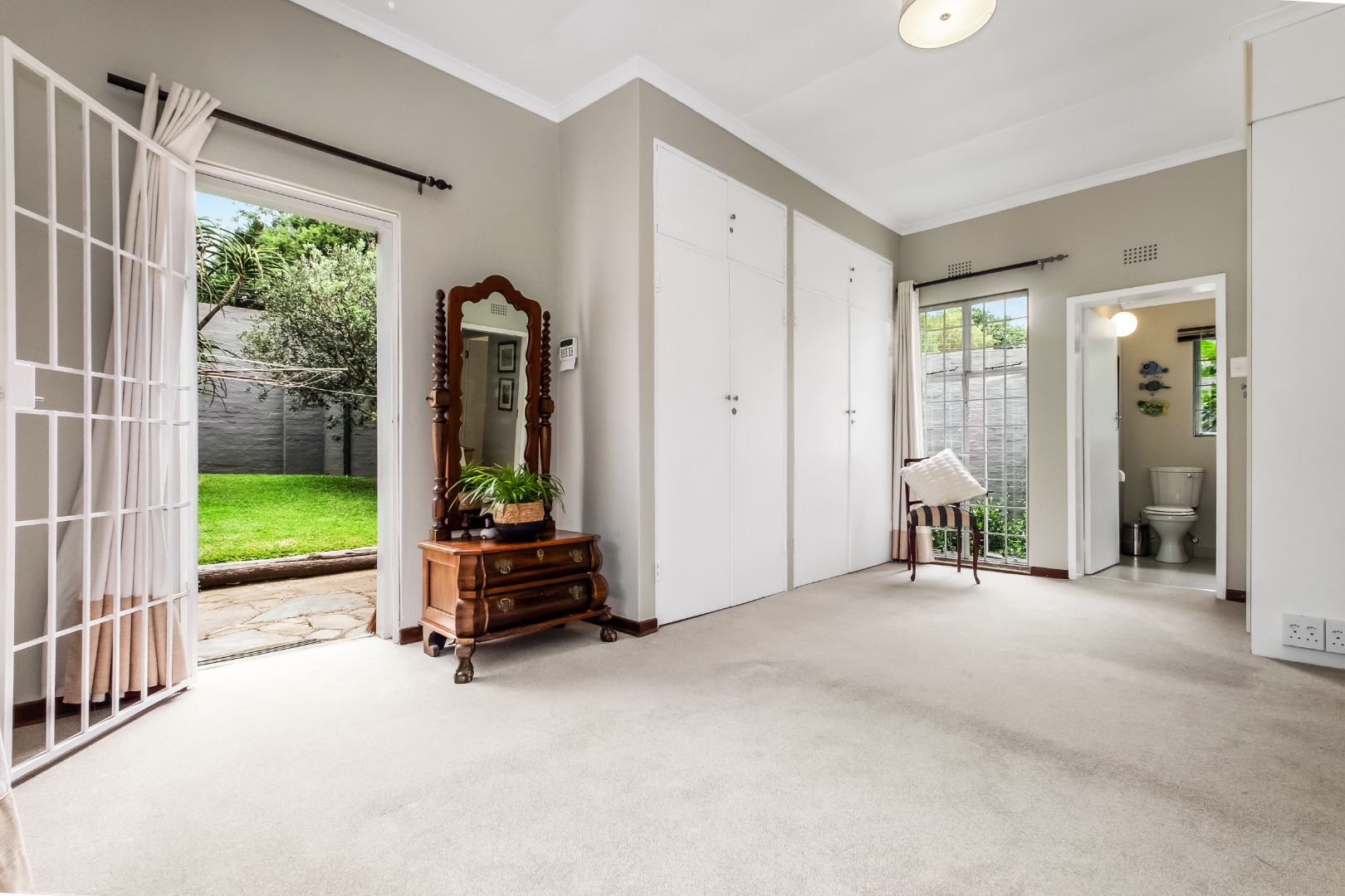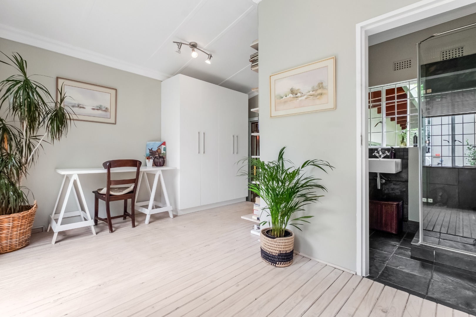 with fireplace opens through sliding doors into the lush indigenous garden. Interleading from here is a dedicated study or play area, also with garden access. Guest Bathroom with Shower.