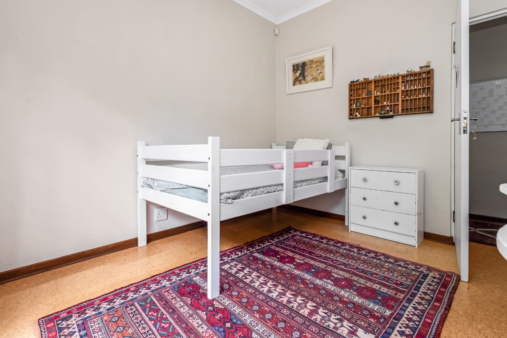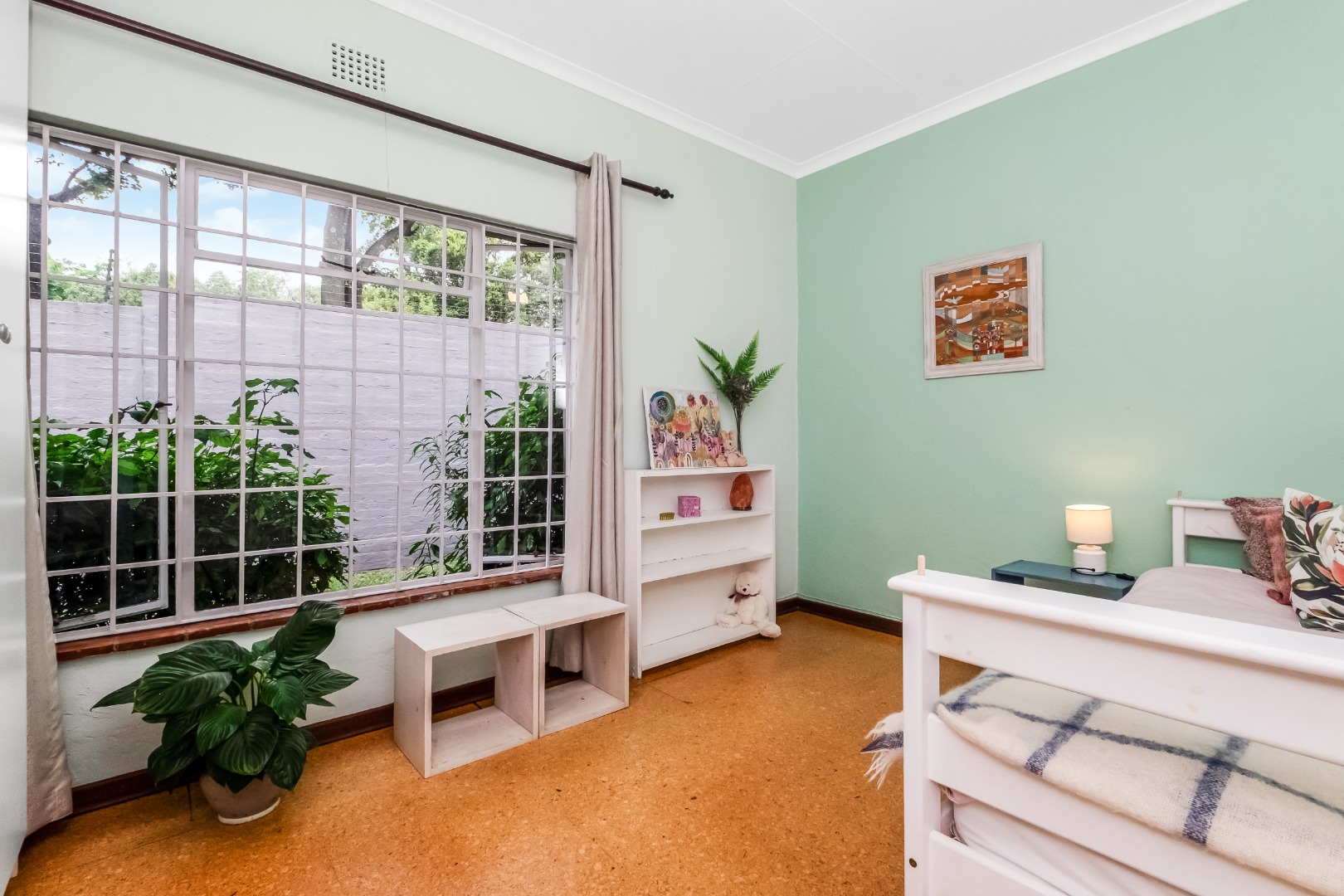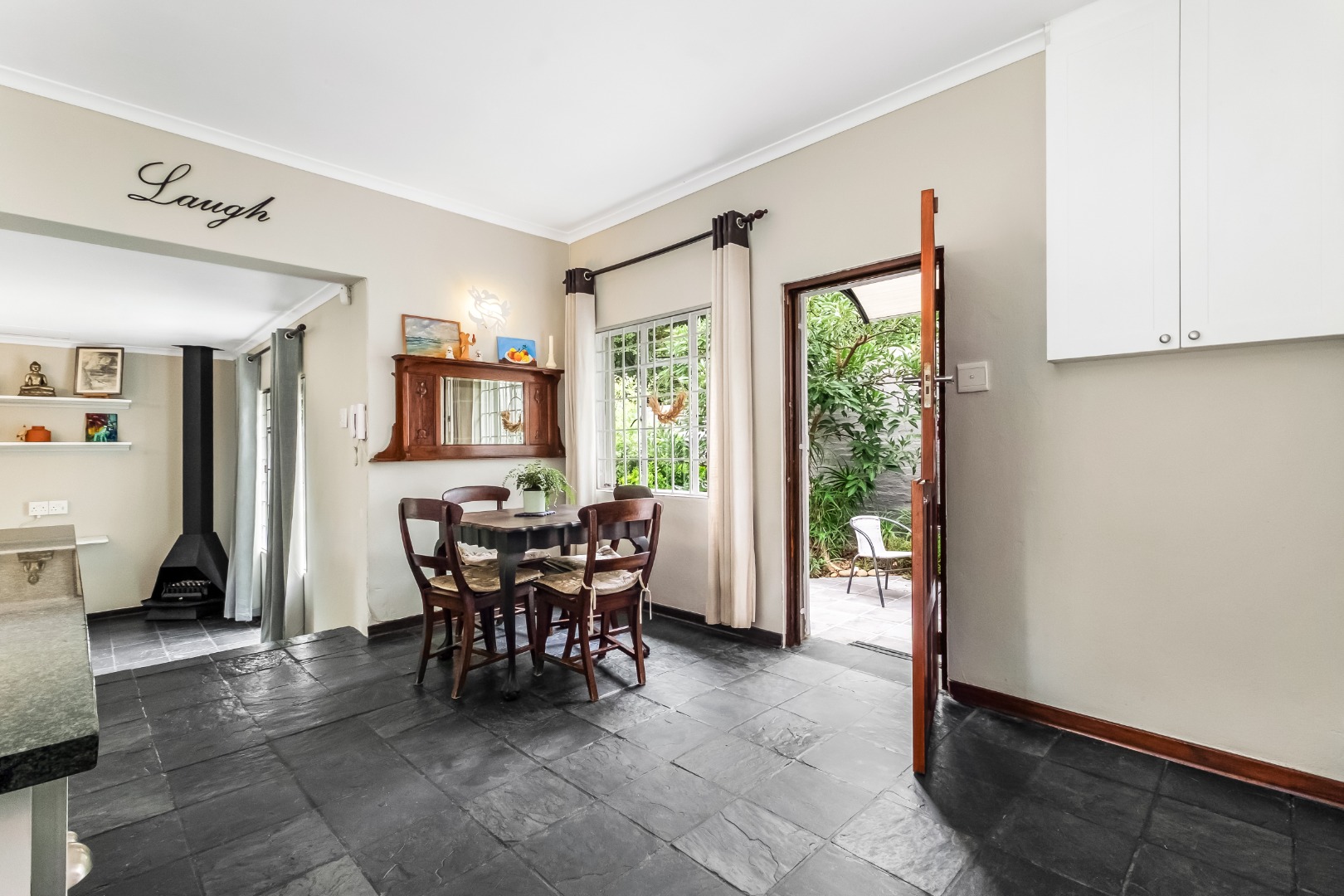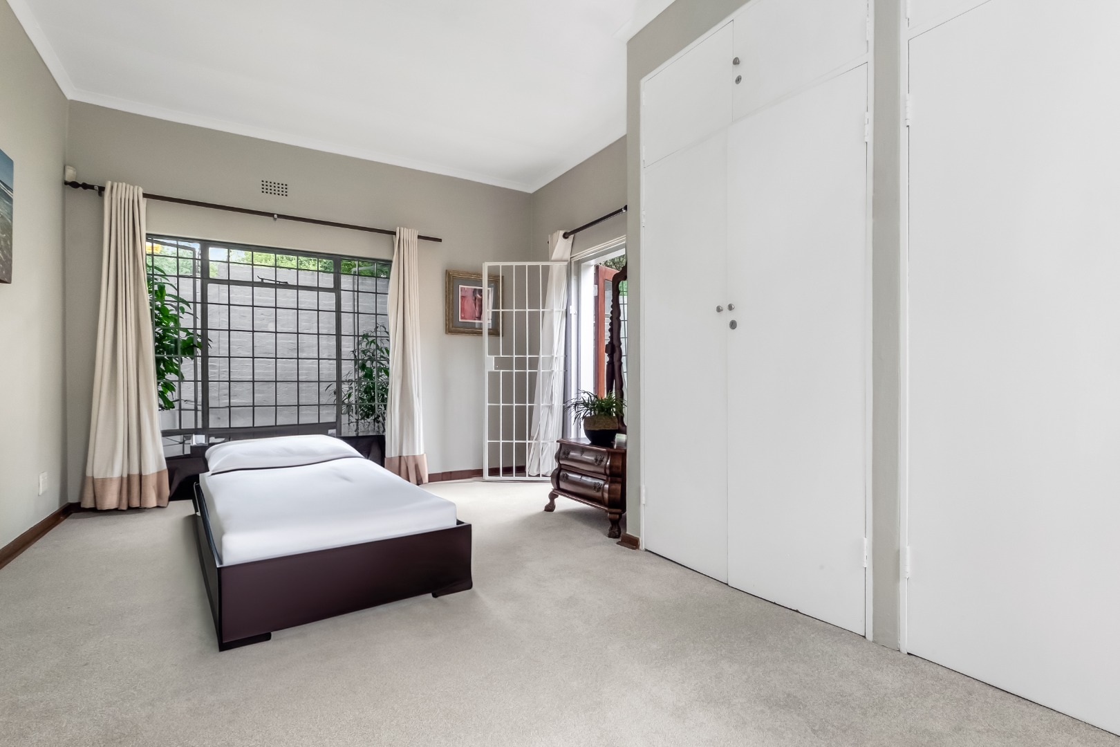 with fireplace opens through sliding doors into the lush indigenous garden. Interleading from here is a dedicated study or play area, also with garden access. Guest Bathroom with Shower.