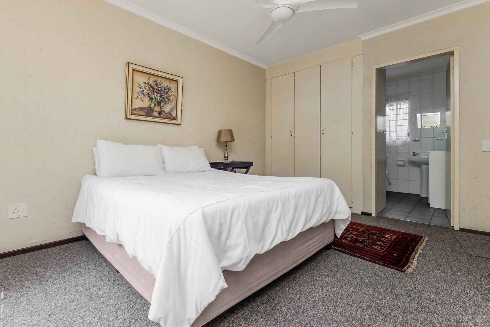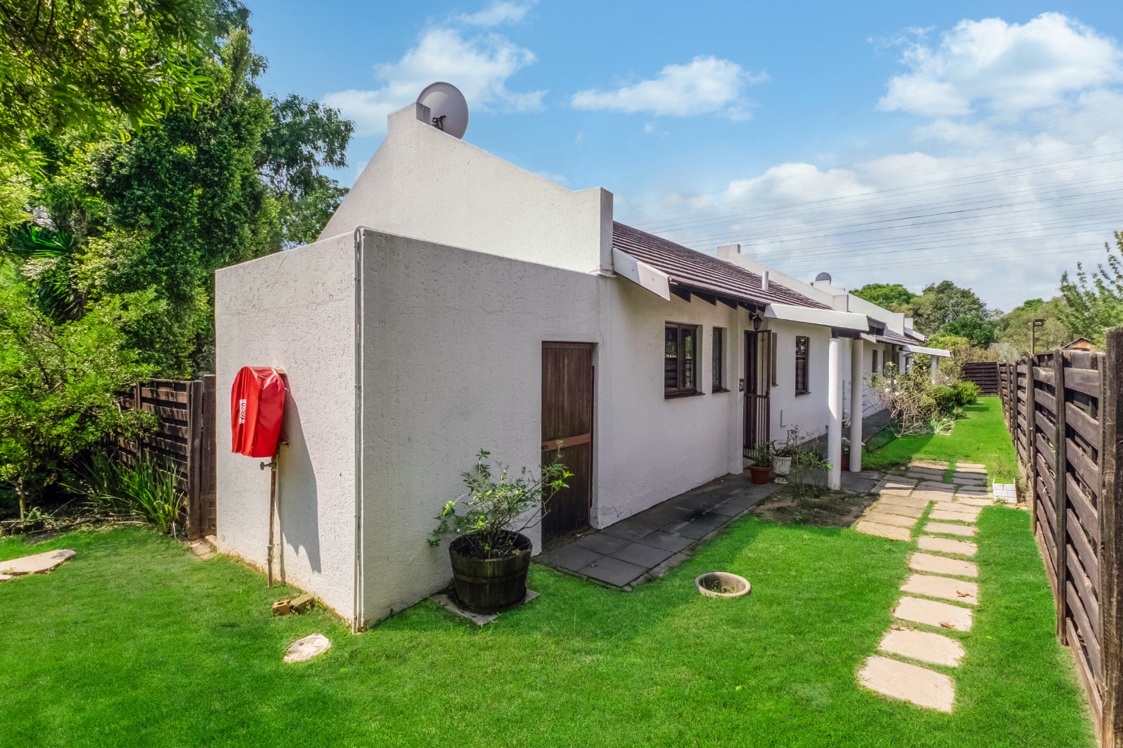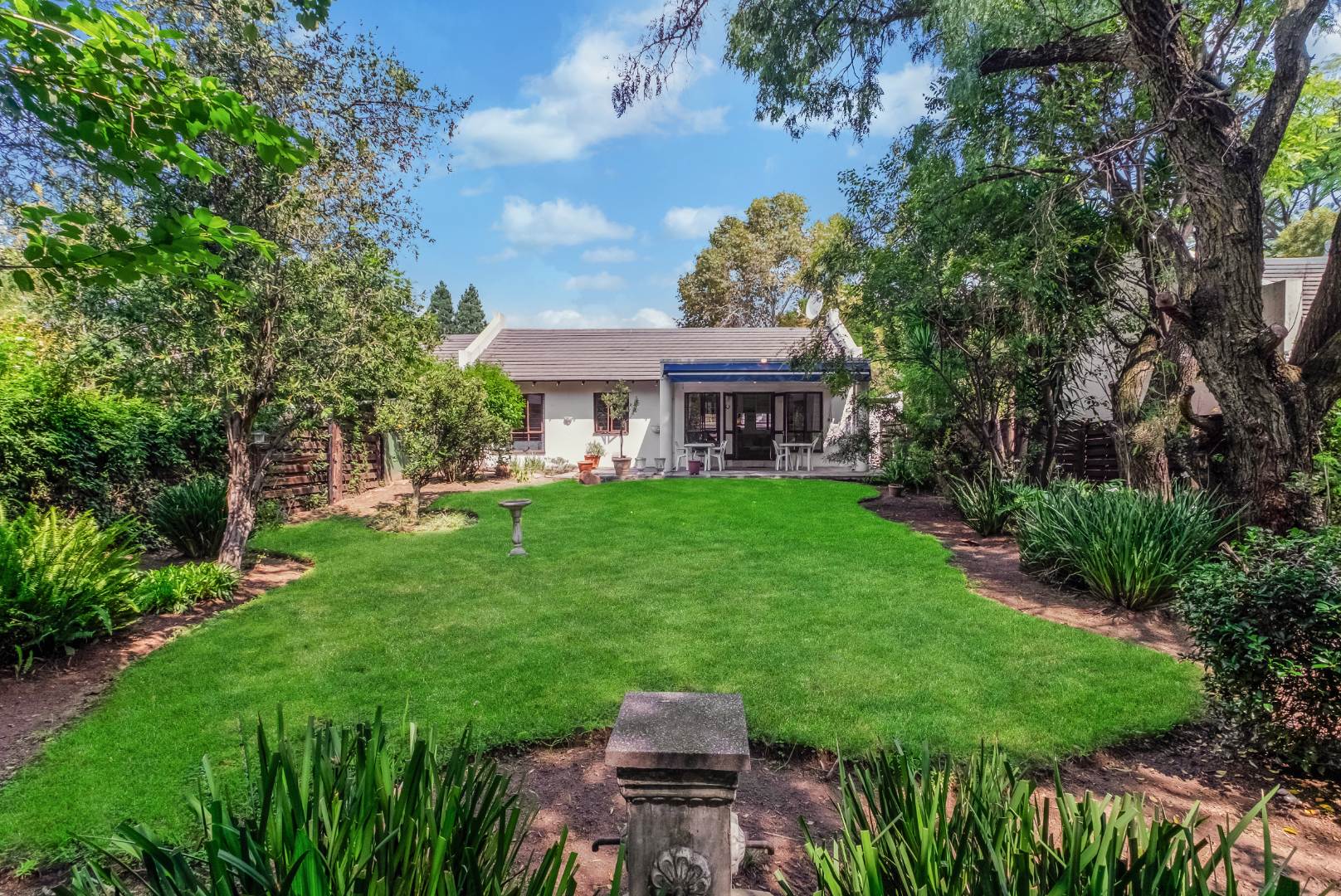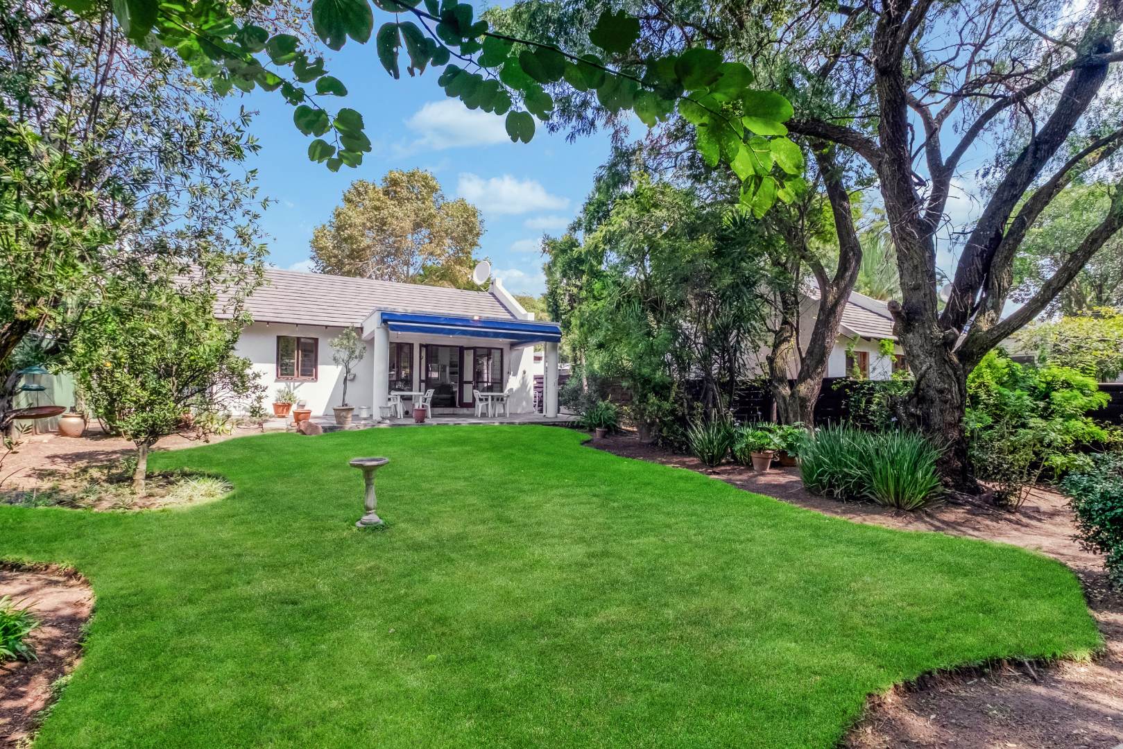 This property is private and tucked away in the heart of the complex therefore spacious private garden. Enter into open plan living space with Kitchen. The open plan living opens up with French Doors leading onto the covered patio overlooking the garden. The kitchen has a breakfast bar/counter with built in cupboard and additional utility room for additional appliances and storage. Three Bedrooms with two Bathrooms. The main bedroom offers a bathroom on suite with bath only. The second bathroom a shower only. The two bedrooms are small and able to fit single beds only. All 3 bedrooms have new carpets. The golden oldie has loads of potential. It is neat and looked after but will need modernizing to your personal taste. This complex is 34 years old and offer 24 Units in the complex hence the space. Allocated Single garage with single carport. Additional parking in the complex plus a swimming pool. The Complex is Pet friendly, Fibre Ready. This home ideal for starter family. You are allowed to build your own private pool.