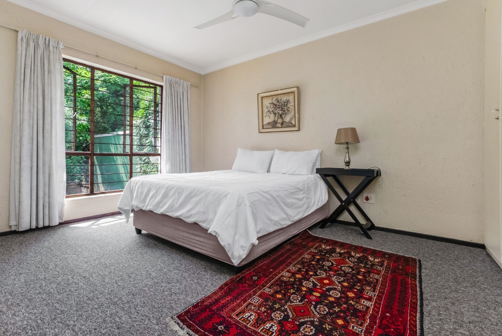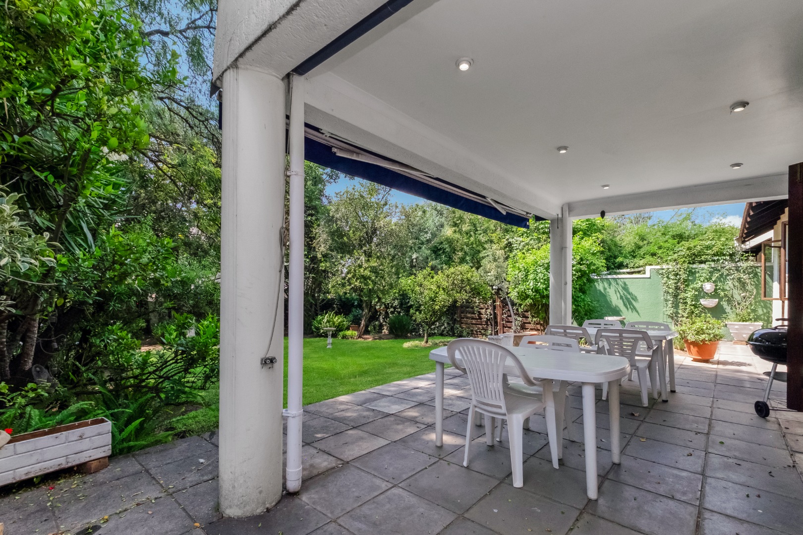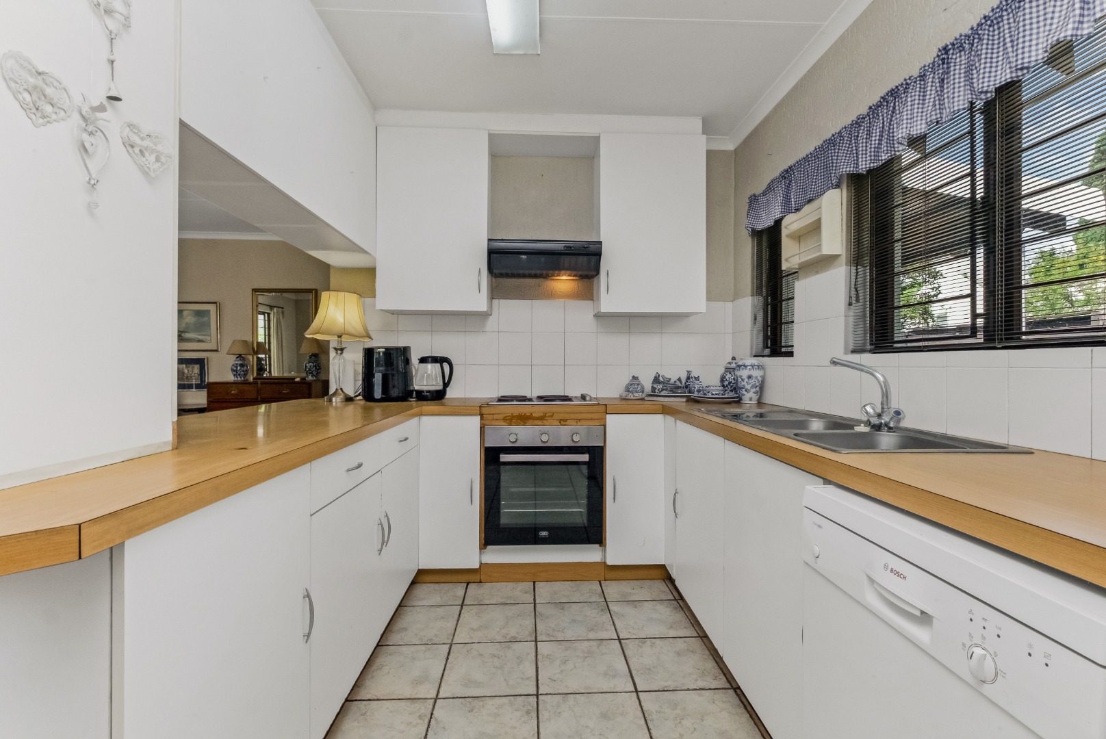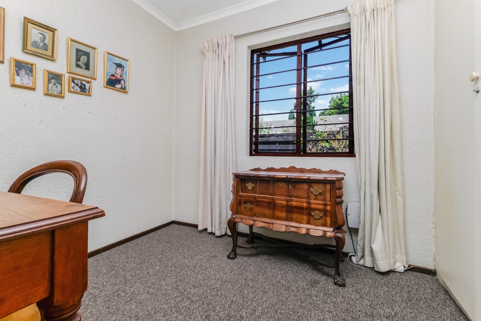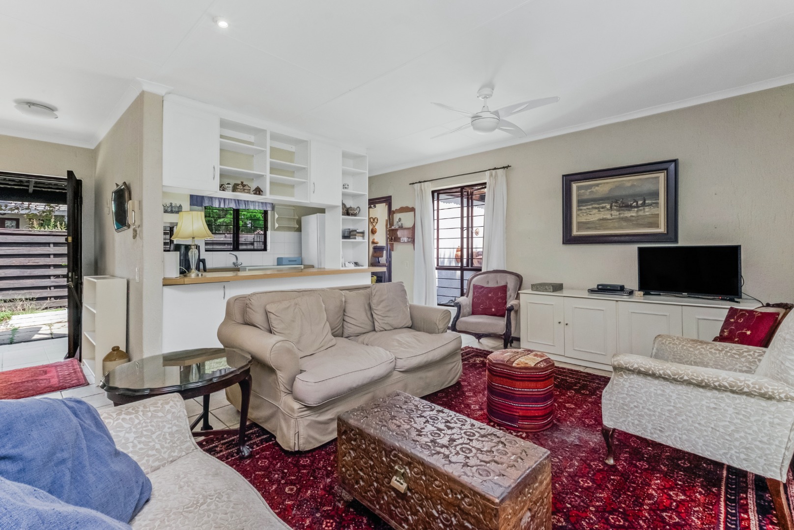 This property is private and tucked away in the heart of the complex therefore spacious private garden. Enter into open plan living space with Kitchen. The open plan living opens up with French Doors leading onto the covered patio overlooking the garden. The kitchen has a breakfast bar/counter with built in cupboard and additional utility room for additional appliances and storage. Three Bedrooms with two Bathrooms. The main bedroom offers a bathroom on suite with bath only. The second bathroom a shower only. The two bedrooms are small and able to fit single beds only. All 3 bedrooms have new carpets. The golden oldie has loads of potential. It is neat and looked after but will need modernizing to your personal taste. This complex is 34 years old and offer 24 Units in the complex hence the space. Allocated Single garage with single carport. Additional parking in the complex plus a swimming pool. The Complex is Pet friendly, Fibre Ready. This home ideal for starter family. You are allowed to build your own private pool.