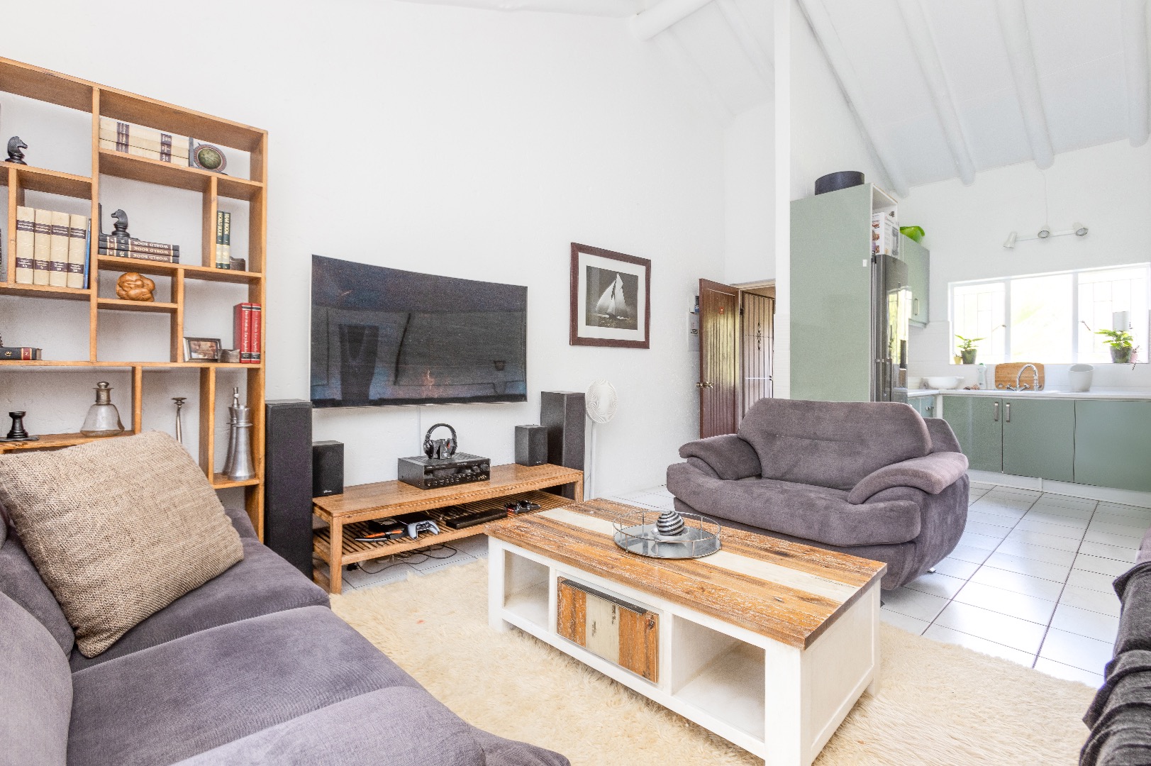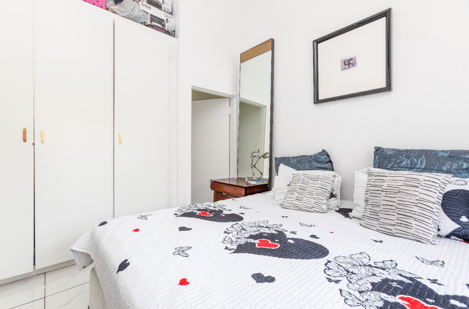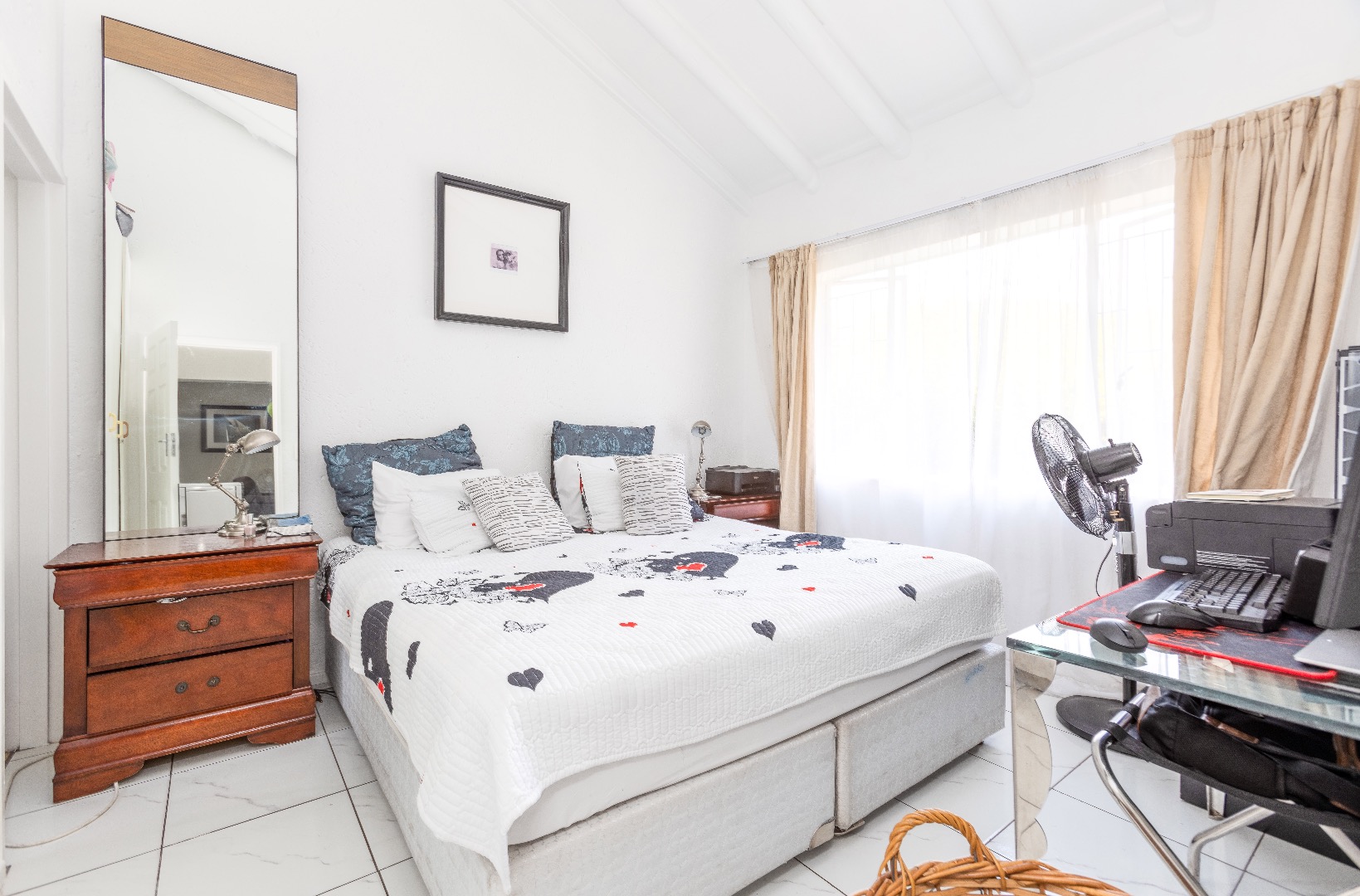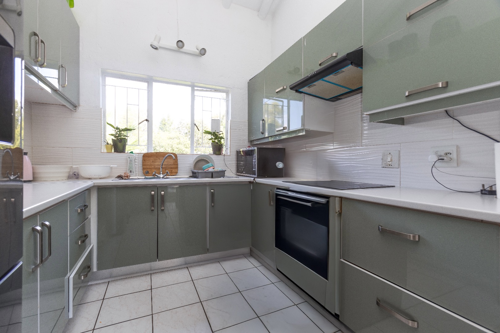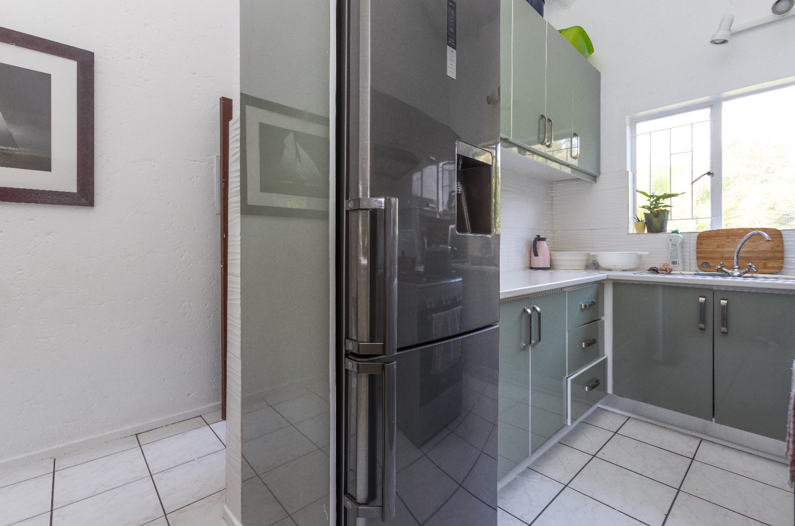 The apartment's contemporary kitchen is designed for both style and functionality, with space for a single-door fridge. The open-plan living area boasts double-volume ceilings, creating an airy, spacious atmosphere. The living area accommodates both a lounge and a dining space, with the lounge leading to a covered patio that overlooks the beautiful communal grounds.